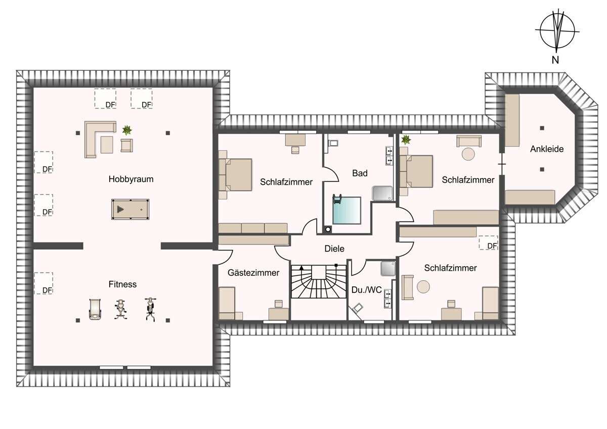 Im Obergeschoss liegt das Hauptschlafzimmer mit angrenzender, luxuriöser Badelandschaft mit Whirlpool und ebenerdiger Dusche. Zudem beherbergt das Obergeschoss drei weitere Schlafräume und ein voll ausgestattetes Bad. Highlight ist der 140 m² große Hobby- und Fitnessraum, der reichlich Platz für Freizeitaktivitäten bietet.