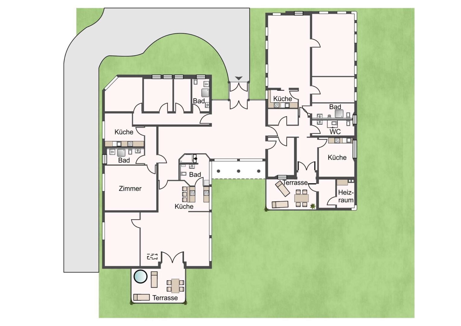 Eine breite, asphaltierte Zufahrt mit Stellplätzen für bis zu zehn Fahrzeuge sowie vorhandene Garagen bietet nicht nur ausreichend Parkfläche, sondern schafft auch einen repräsentativen ersten Eindruck. Der barrierefreie Grundriss und die durchdachte Aufteilung in zwei unabhängige Gebäudeflügel erlauben eine klare funktionale Trennung – ideal beispielsweise für die Kombination von Praxis und Privatleben. Beide Einheiten sind mit separaten Küchen, Bädern sowie Wohn- und Arbeitsräumen ausgestattet und verfügen über voneinander getrennte Gartenbereiche, was die Nutzungsmöglichkeiten zusätzlich erweitert und diskrete Arbeitsumgebungen ermöglicht.