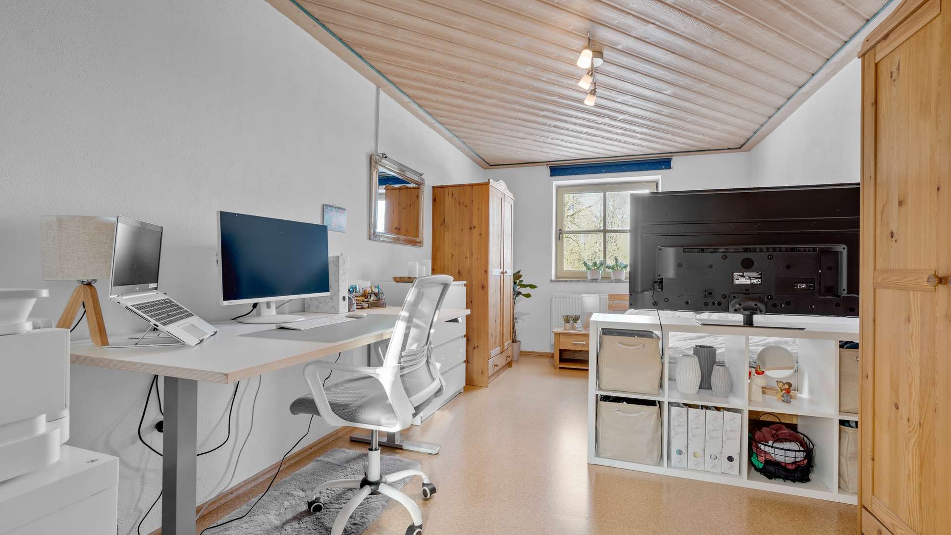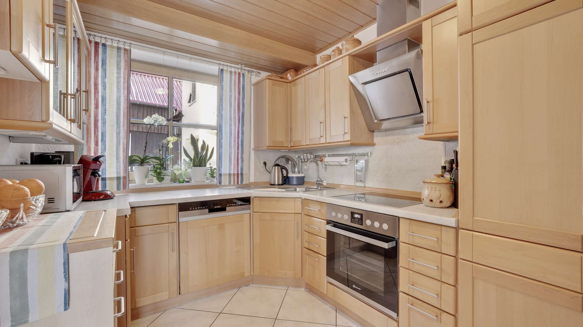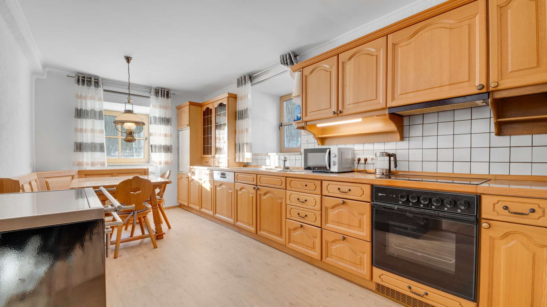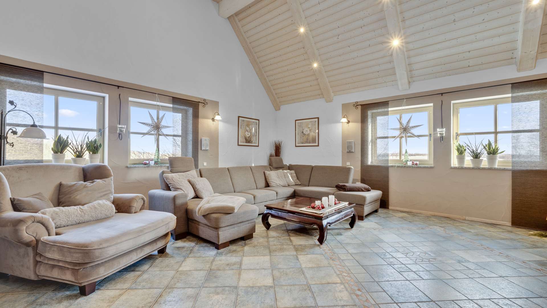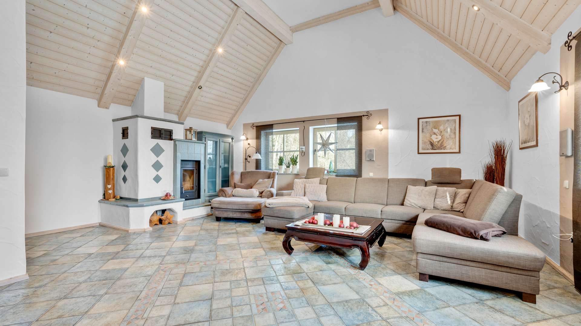 Der Innenbereich überzeugt mit durchdachtem Design und hochwertiger Ausstattung. Das lichtdurchflutete Erdgeschoss des Haupthauses besticht durch bodentiefe Fenster, die einen direkten Zugang zur Terrasse mit herrlichem Ausblick bieten. Die moderne Küche mit neuen Elektrogeräten, ein stilvoll gefliestes Badezimmer und ein gemütlicher Pellet-Kaminofen schaffen eine einladende Atmosphäre. Im Obergeschoss beeindruckt das 40 m² große Wohnzimmer mit Kachelofen und einer außergewöhnlichen Deckenhöhe von über 4 m, ergänzt durch drei geräumige Schlafzimmer und ein weiteres Badezimmer. Die Einliegerwohnung punktet mit einer edlen Granittreppe, separatem Zugang und flexibler Nutzungsmöglichkeit.
