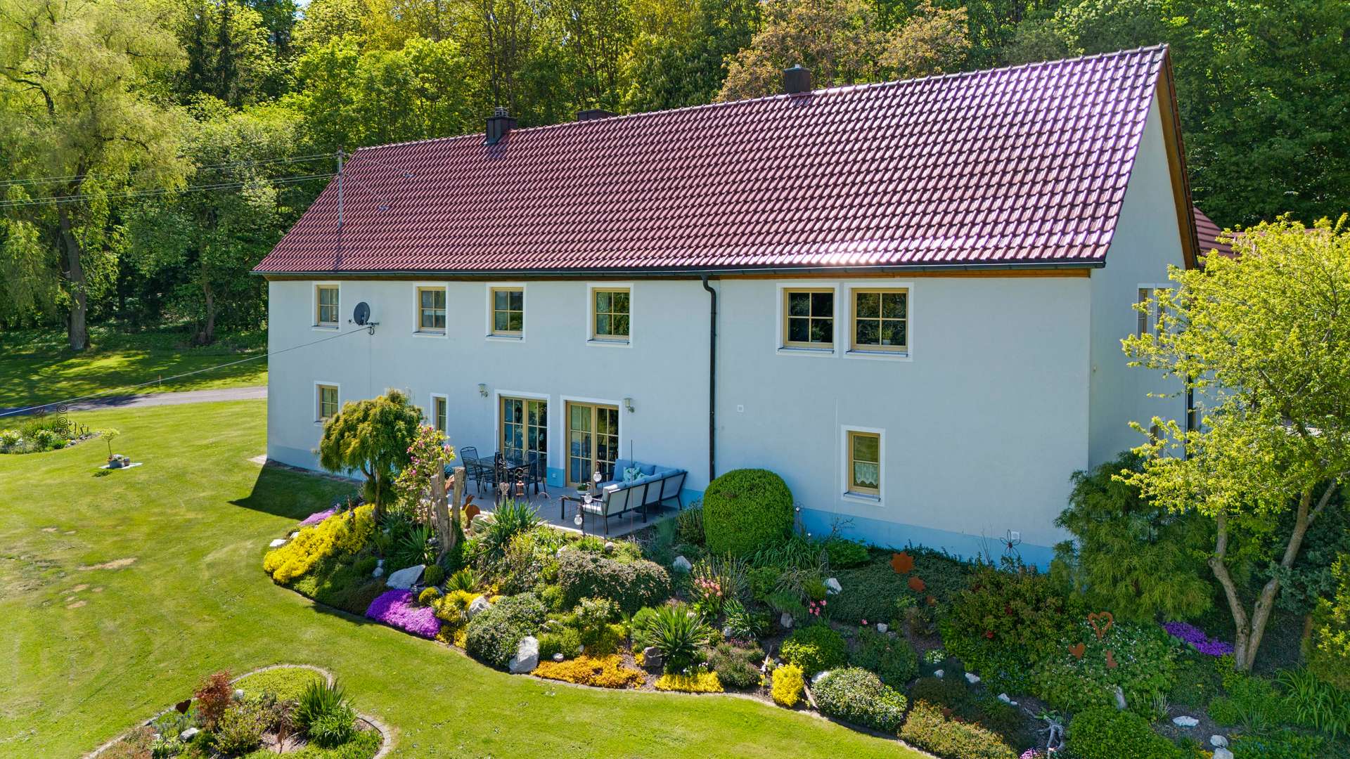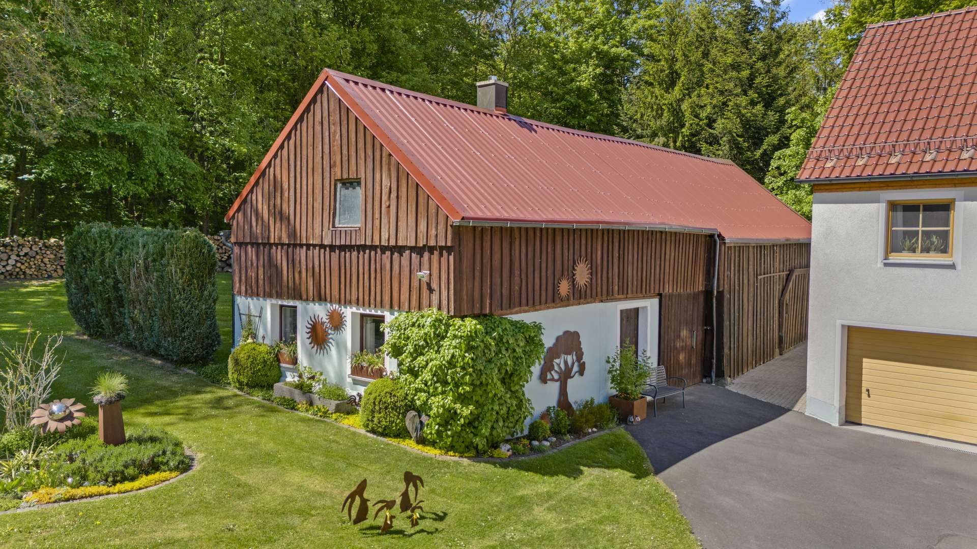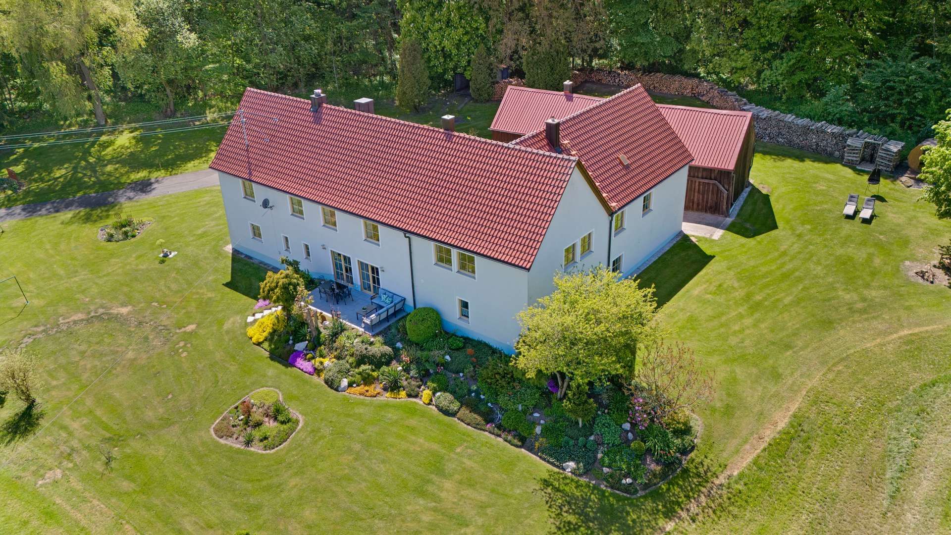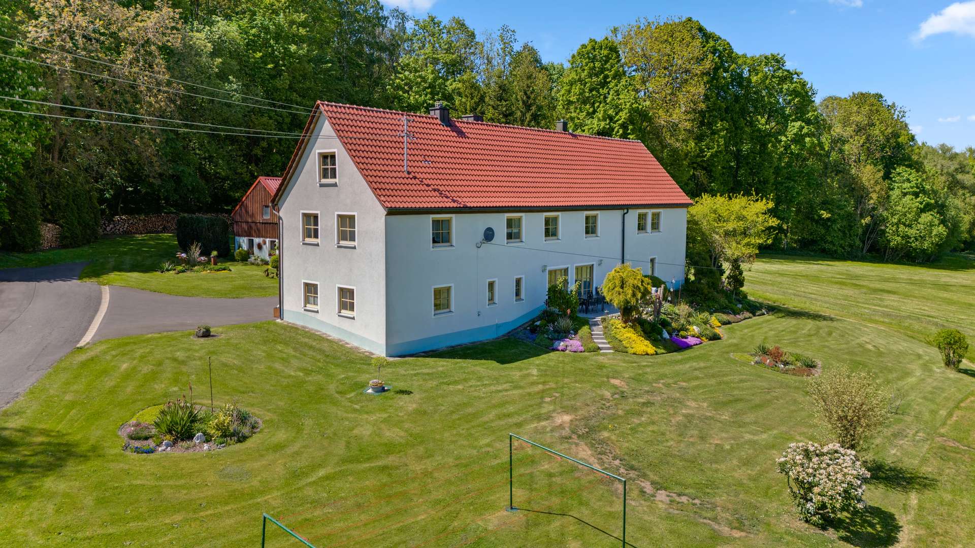 Das Wort Alleinlage bekommt bei diesem Anwesen eine ganz neue Bedeutung: Auf dem 2.471m² großen Grundstück finden Sie neben einmaliger Ruhe, Weitläufigkeit auch noch einen traumhaften Weitblick. Das Hauptgebäude teilt sich in einen charmanten Altbau aus ca. 1900 und einen modernen Neubau aus dem Jahr 2000, die zusammen eine Wohnfläche von insgesamt 261m² bieten. Das Haupthaus umfasst großzügige 175m², während die Einliegerwohnung mit 86m² ideal als Gästedomizil oder eigenständige Wohneinheit genutzt werden kann – beide Einheiten mit separaten Eingängen. Abgerundet wird die vielfältig Ausstattung durch eine große Scheune mit Werkstatt und Lagerflächen, ergänzt durch einen einladenden Wellnessbereich mit Gartenhütte, Fasssauna und Außendusche. Für Ihre Fahrzeuge stehen drei Garagen sowie eine zusätzliche Blechgarage bereit. Zwei der drei Garagen am Haus verfügen bereits über einen elektrischen Antrieb, wobei die dritte Garage bereits für eine Umrüstung vorbereitet wurde.