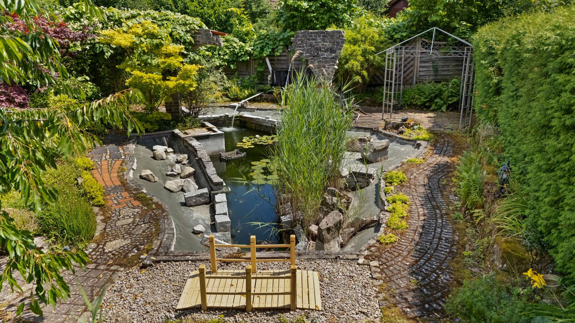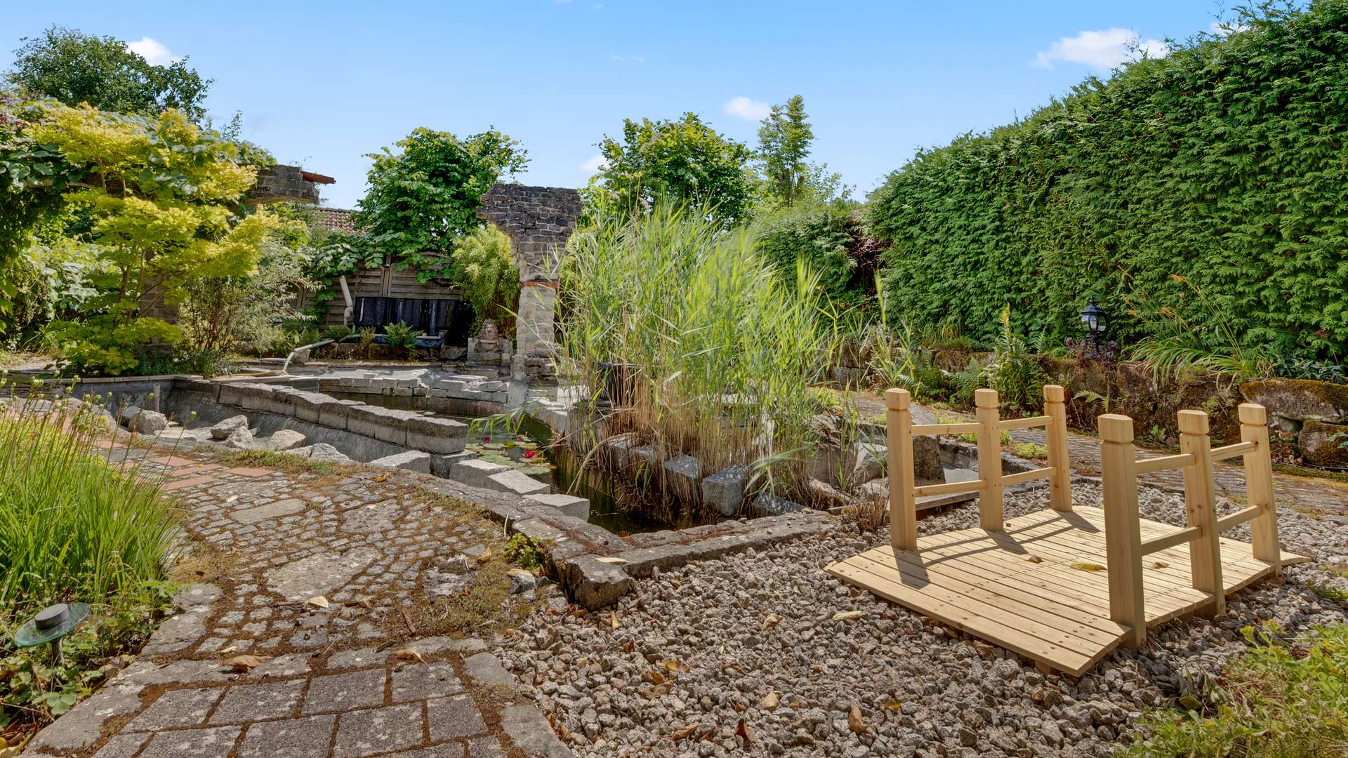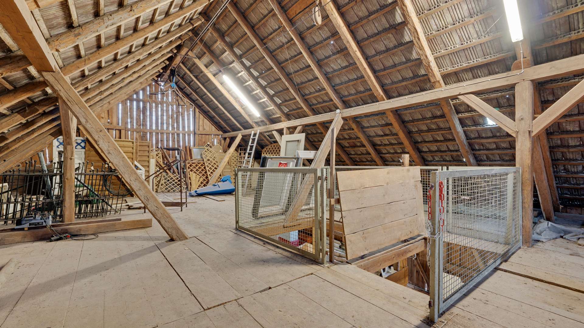 Das ursprüngliche Bauernhaus aus dem Jahr 1905 wurde 1998 umfassend saniert und in zwei separate Einheiten aufgeteilt, die über ein zentrales Treppenhaus bei Bedarf miteinander verbunden werden können. Das Erdgeschoss beherbergt aktuell eine großzügige Bürofläche mit separatem Eingang auf 208 m² sowie eine vielseitig nutzbare Werkstattfläche von 135 m². Im Obergeschoss befinden sich weitere Büroräume sowie eine lichtdurchflutete Wohnung mit vier Zimmern, einer modernen Küche und einer 19 m² großen Dachterrasse. Das Grundstück erstreckt sich über 2.953 m² und bietet neben zwei Scheunen – darunter eine beeindruckende, dreistöckige Scheune mit 450 m² Nutzfläche – auch einen idyllisch angelegten Mustergarten mit Koiteich, stilvollen Anpflanzungen und Säulen. Die weitläufige Hoffläche und die vorhandenen Nebengebäude unterstreichen den besonderen Charakter dieses Ensembles und schaffen zusätzlichen Spielraum für verschiedenste Nutzungsideen.