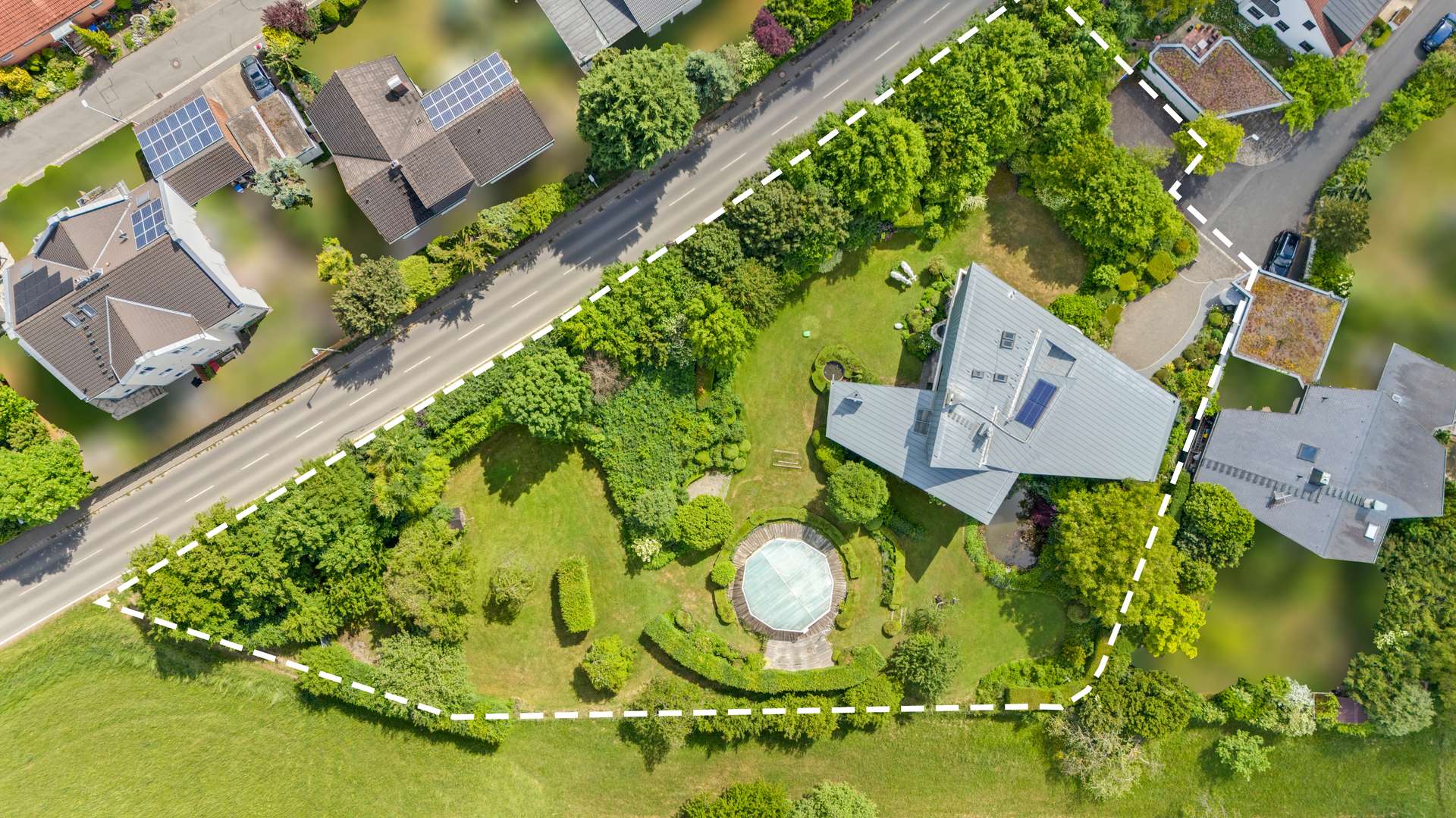 Auf dem ca. 4.247,30m² großen Grundstück wurde dieses Ensemble für Wohnen und Arbeiten entworfen. Das Hauptgebäude bietet 357,83m² Wohnfläche, ergänzt durch eine Einliegerwohnung (153,71m²) und einen separaten Bürotrakt (132,22m²) – jeweils mit eigenem Zugang und flexibler Nutzung. Die luxuriöse Poolanlage mit Gegenstromanlage, elektrischer Glasabdeckung und Sonnenterrasse ist ein echtes Highlight.