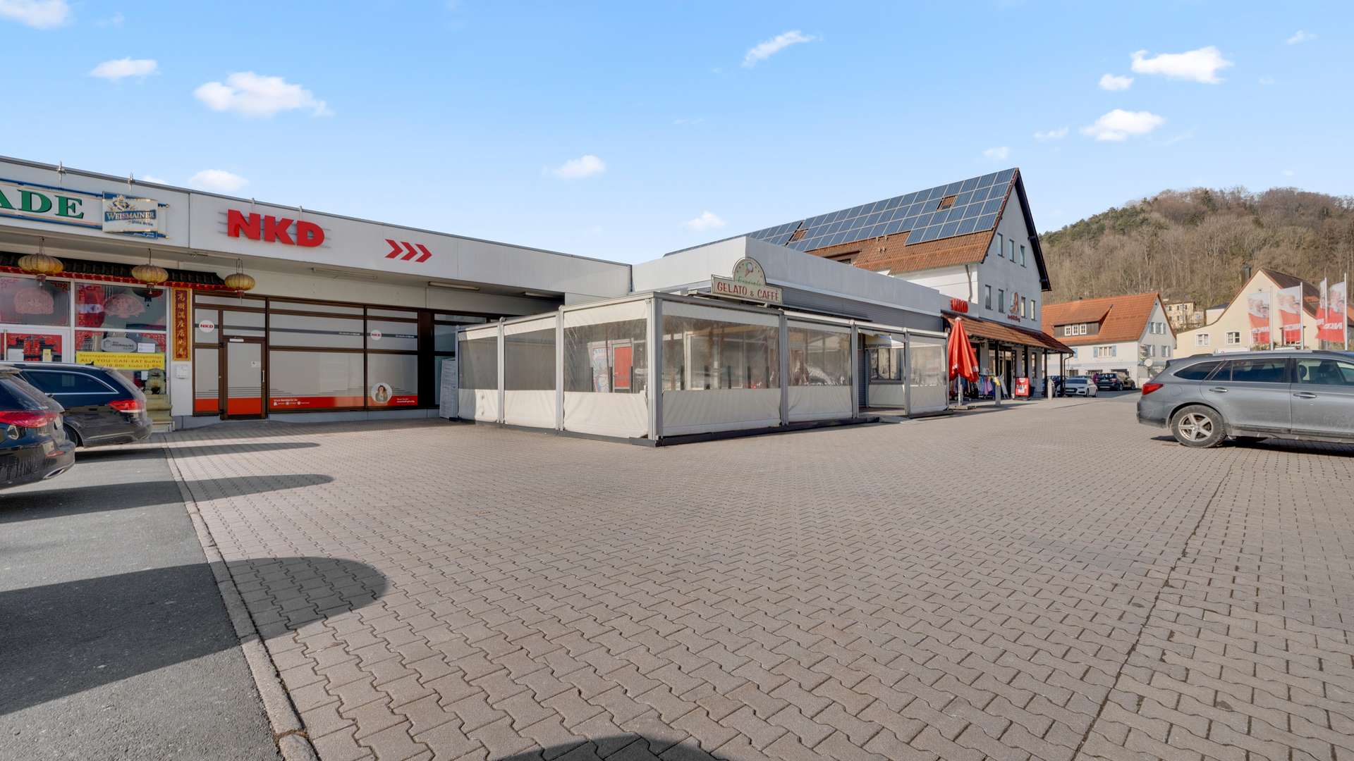 Der stark frequentierte Gewerbeteil des Gebäudes erstreckt sich ebenerdig und ist durch die großen Parkflächen perfekt erreichbar. Hier befinden sich verschiedene Geschäftseinheiten, darunter ein China-Restaurant, eine Eisdiele und eine große Einzelhandels-/ Verkaufsfläche mit Lagerbereich. Das angeschlossene Wohn- und Geschäftshaus verteilt sich auf drei Etagen und umfasst im Erdgeschoss eine Apotheke, eine Steuerberater- und Anwaltskanzlei und im 1. Obergeschoss eine Arztpraxis. Im Dachgeschoss befinden sich zwei Wohneinheiten mit einer Gesamtwohnfläche von 224,37m². Der Dachboden bietet aufgrund seiner großzügigen Fläche und Deckenhöhe weiteres Ausbaupotenzial. Ein teilunterkellerter Bereich unter der Eisdiele ergänzt die funktionale Struktur des Gebäudes. Auf dem Gelände stehen ca. 46 Kfz-Stellplätze sowie eine vermietete Garage zur Verfügung, was die Attraktivität für Gewerbe- und Wohnmieter gleichermaßen stark erhöht.