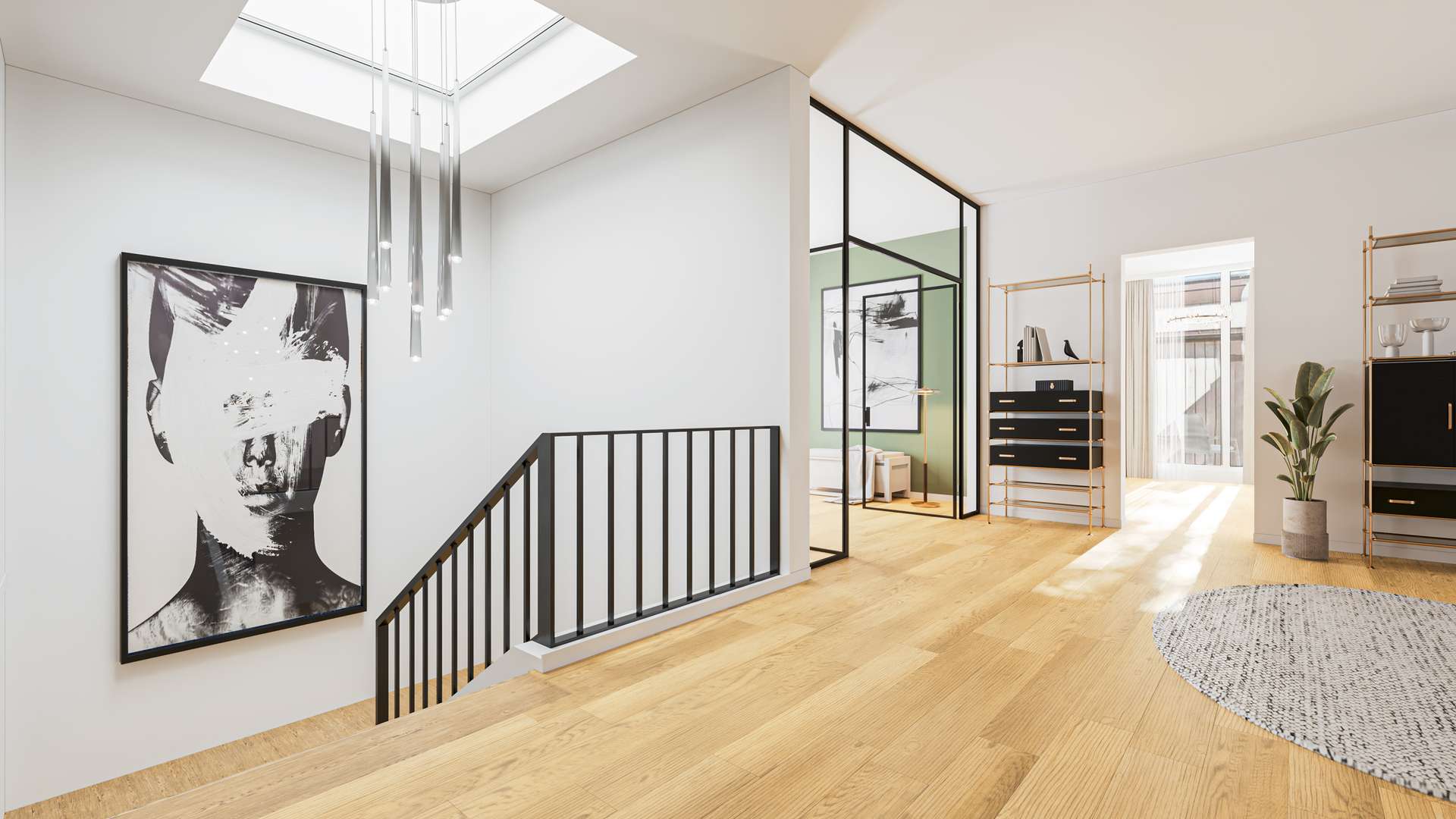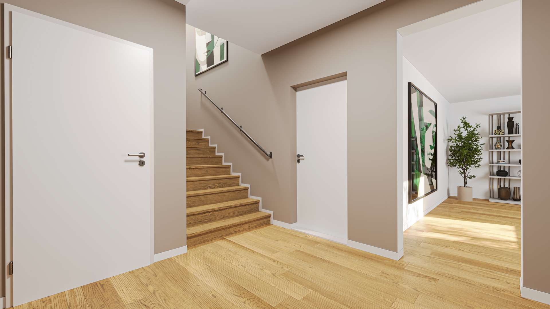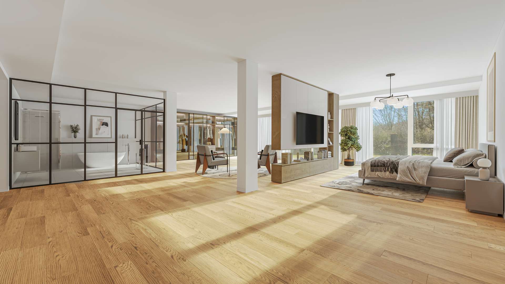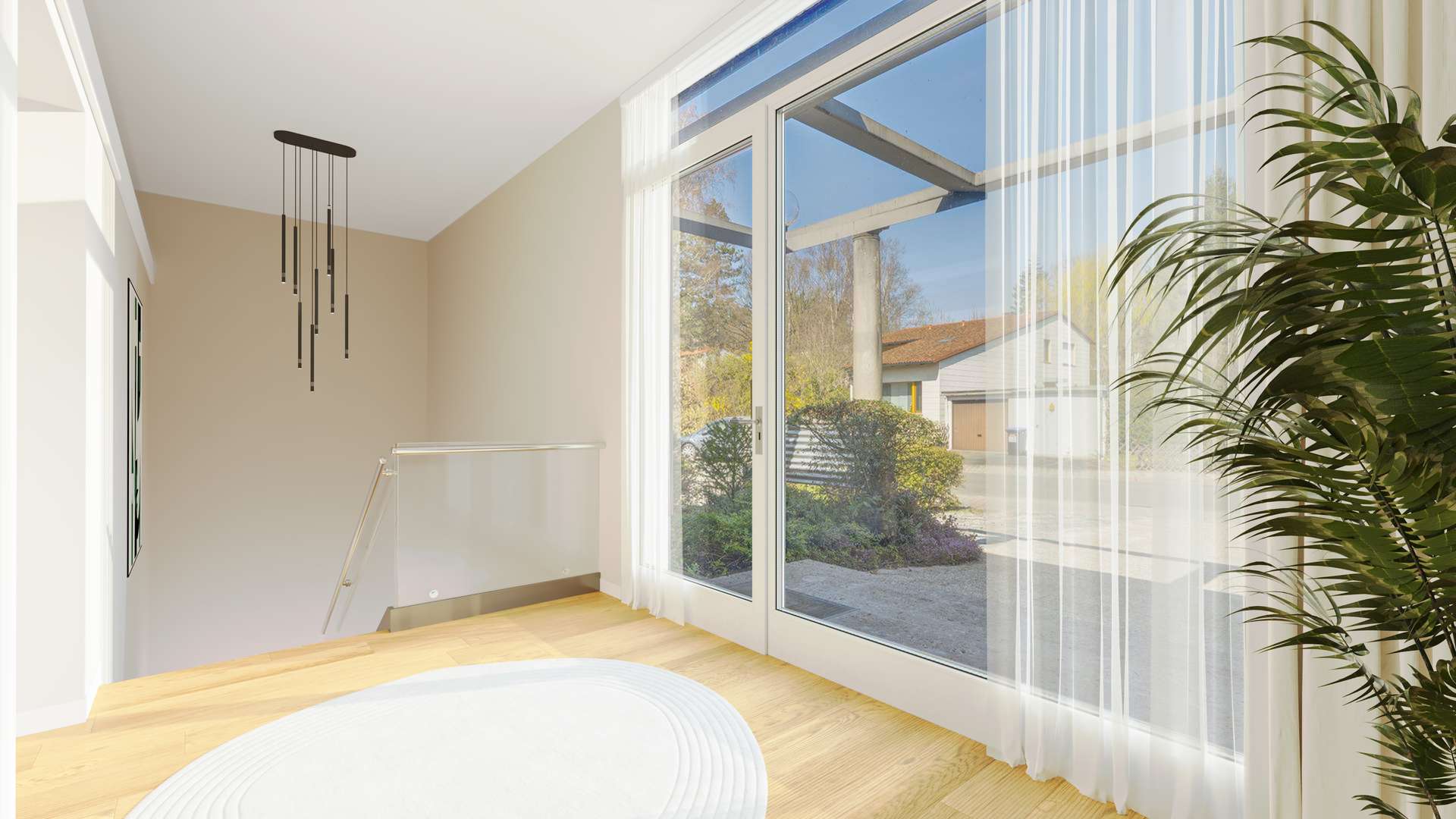 Im Haupthaus empfängt Sie im Erdgeschoss eine weitläufige Diele mit direktem Zugang zu Küche, Wohnbereich, Gäste-WC, Garage und Gartengeschoss. Das Herzstück bildet der rund 85 m² große Wohn- und Essbereich mit offenem Kamin, raumhohen Glasfronten auf allen Seiten und drei direkten Zugängen zur Ostterrasse, dem umlaufenden Südbalkon und der überdachten Westterrasse. Die Küche mit 22 m² bietet reichlich Platz für eine Inselküche und grenzt ebenfalls an die Terrasse. Die integrierte Doppelgarage führt über eine Einschubtreppe in den Spitzboden, der als zusätzliche Hobbyfläche genutzt werden kann. Im Gartengeschoss befinden sich drei private Schlafsuiten – darunter ein Elternbereich mit Schlafzimmer, Ankleide, Bad, separatem WC und Gartenzugang sowie zwei Kinderbereiche mit jeweils eigenem Bad und direktem Zugang zum Südgarten. Ein Hauswirtschaftsraum, ein Hobbyraum und ein Weinkeller runden das Raumangebot ab.