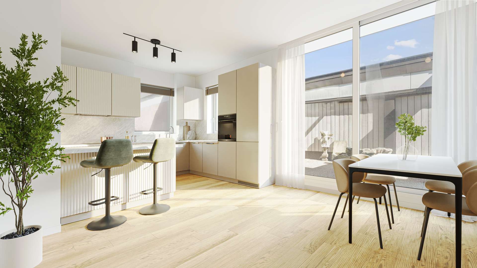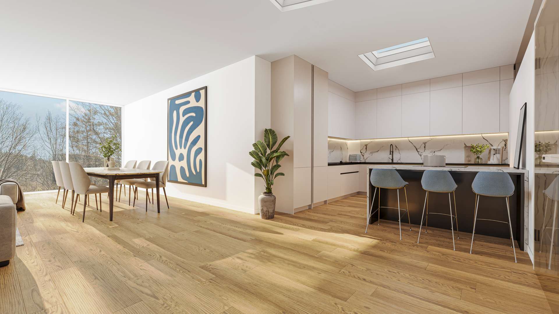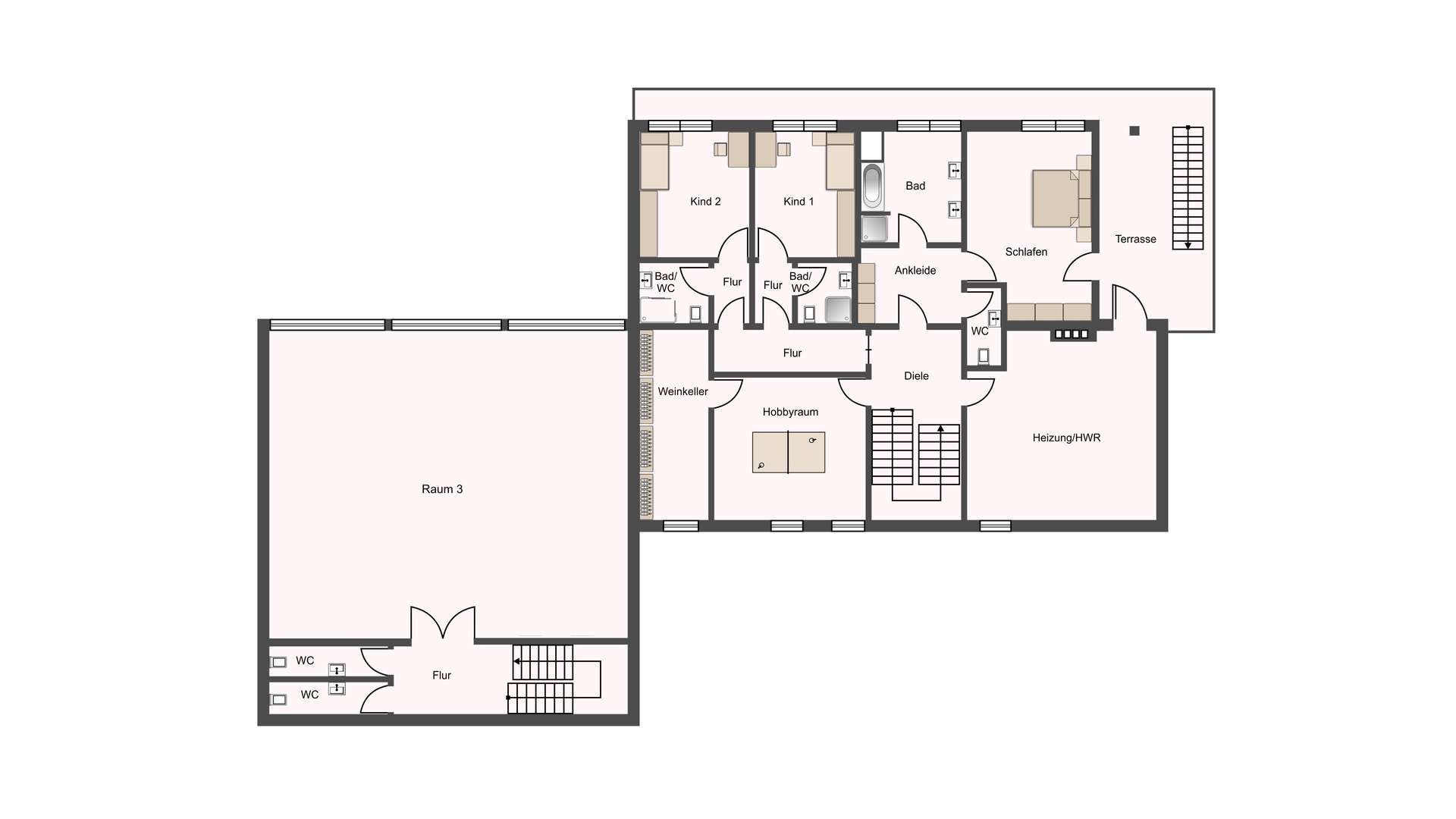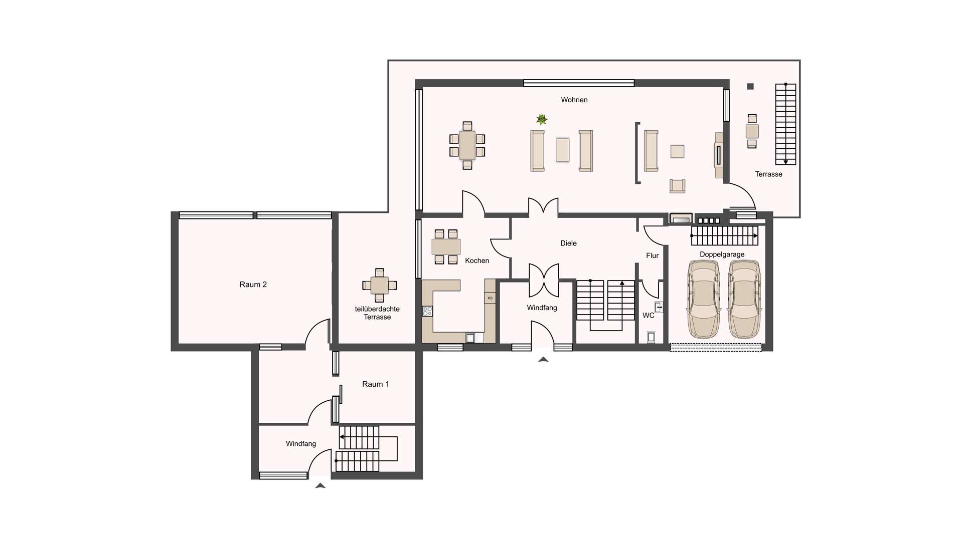 Im Haupthaus empfängt Sie im Erdgeschoss eine weitläufige Diele mit direktem Zugang zu Küche, Wohnbereich, Gäste-WC, Garage und Gartengeschoss. Das Herzstück bildet der rund 85 m² große Wohn- und Essbereich mit offenem Kamin, raumhohen Glasfronten auf allen Seiten und drei direkten Zugängen zur Ostterrasse, dem umlaufenden Südbalkon und der überdachten Westterrasse. Die Küche mit 22 m² bietet reichlich Platz für eine Inselküche und grenzt ebenfalls an die Terrasse. Die integrierte Doppelgarage führt über eine Einschubtreppe in den Spitzboden, der als zusätzliche Hobbyfläche genutzt werden kann. Im Gartengeschoss befinden sich drei private Schlafsuiten – darunter ein Elternbereich mit Schlafzimmer, Ankleide, Bad, separatem WC und Gartenzugang sowie zwei Kinderbereiche mit jeweils eigenem Bad und direktem Zugang zum Südgarten. Ein Hauswirtschaftsraum, ein Hobbyraum und ein Weinkeller runden das Raumangebot ab.