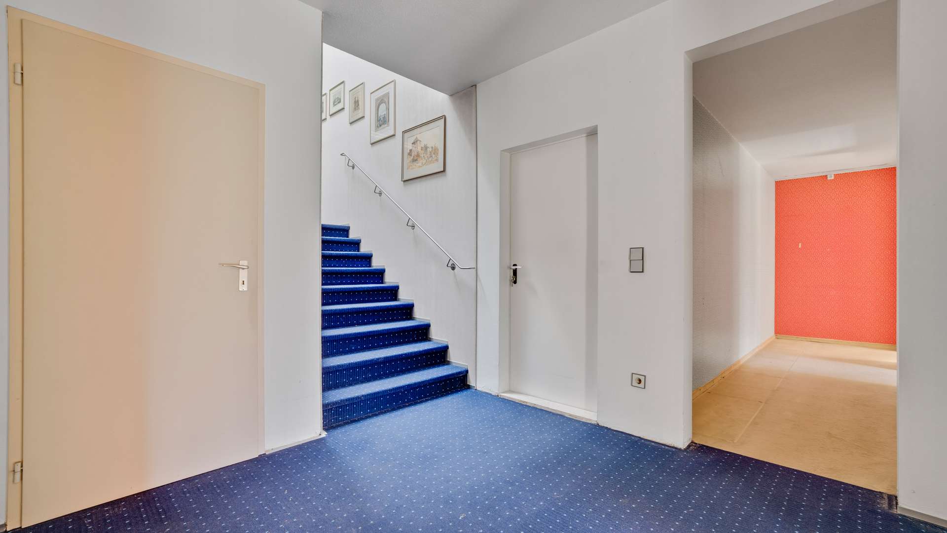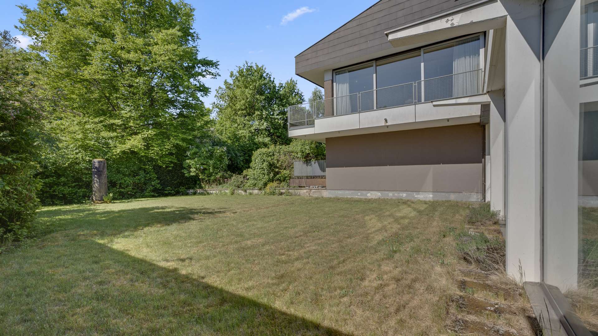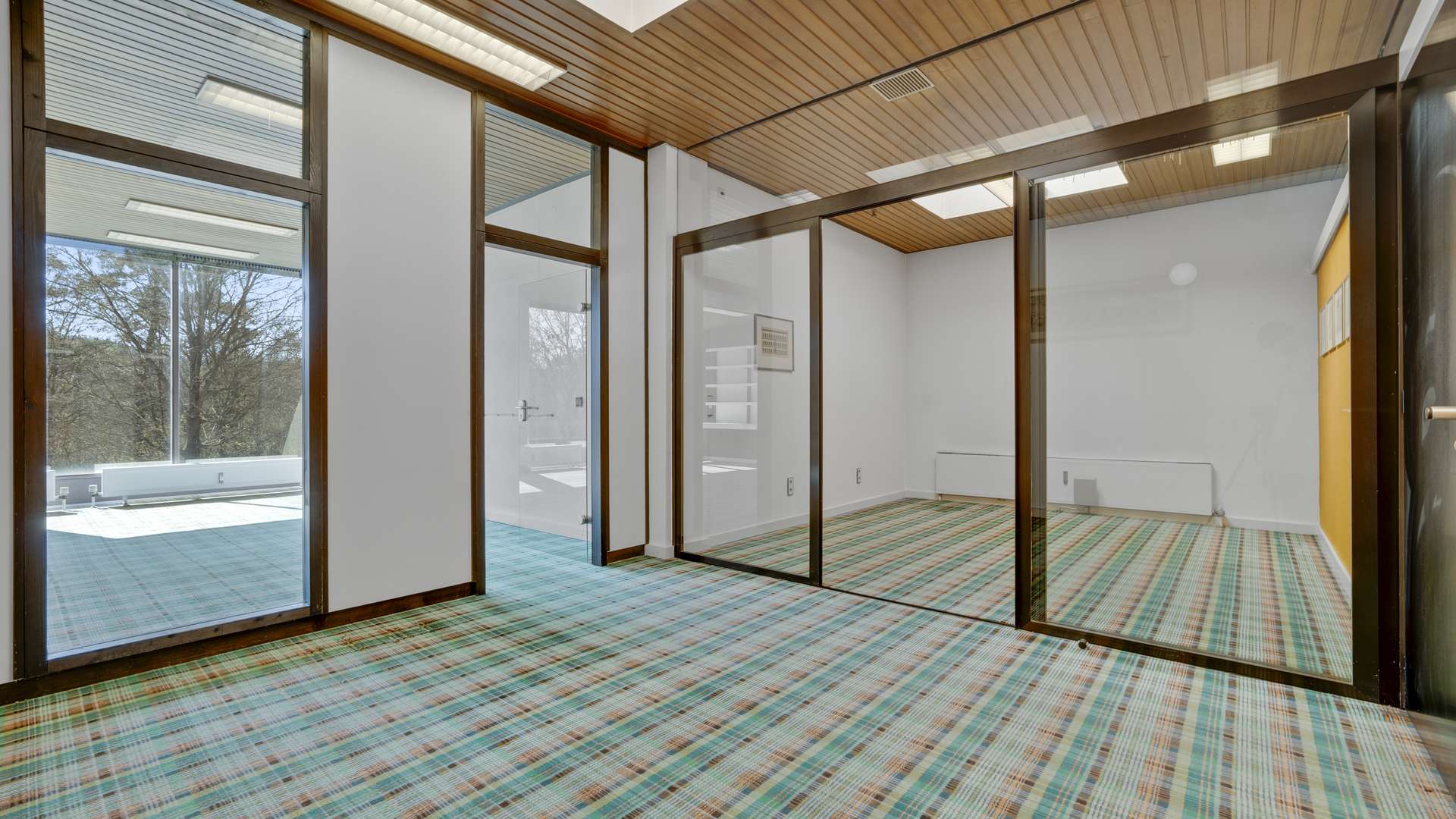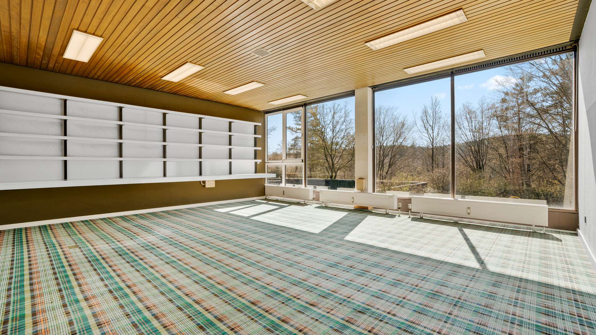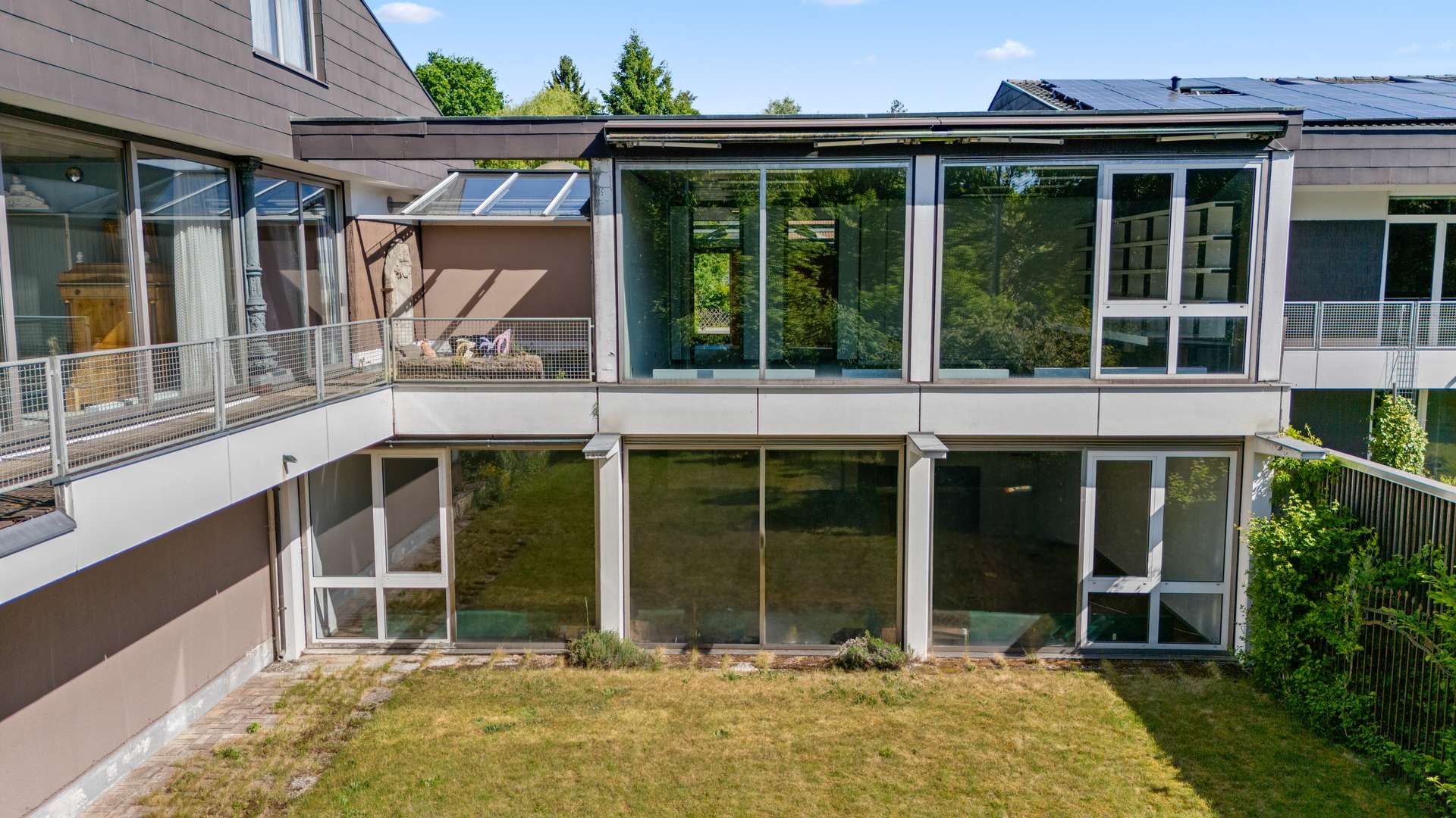 Das zweite Gebäude wurde ursprünglich als Bürogebäude genutzt und ist inzwischen als Wohnhaus genehmigt. Es verfügt über eine Gesamtfläche von 216,63 m² und bietet eine großzügige Grundstruktur mit viel natürlichem Licht. Im Erdgeschoss befinden sich ein großer Raum mit rund 48 m² Fläche und kompletter Fensterfront sowie ein weiterer Raum mit etwa 13 m². Im Gartengeschoss liegen zusätzliche Flächen von rund 113 m², ebenfalls mit raumhohen Fenstern und Blick in den grünen Südgarten. Die Räume stehen bereit für einen individuellen, flexiblen Innenausbau nach den Vorstellungen der neuen Eigentümer.