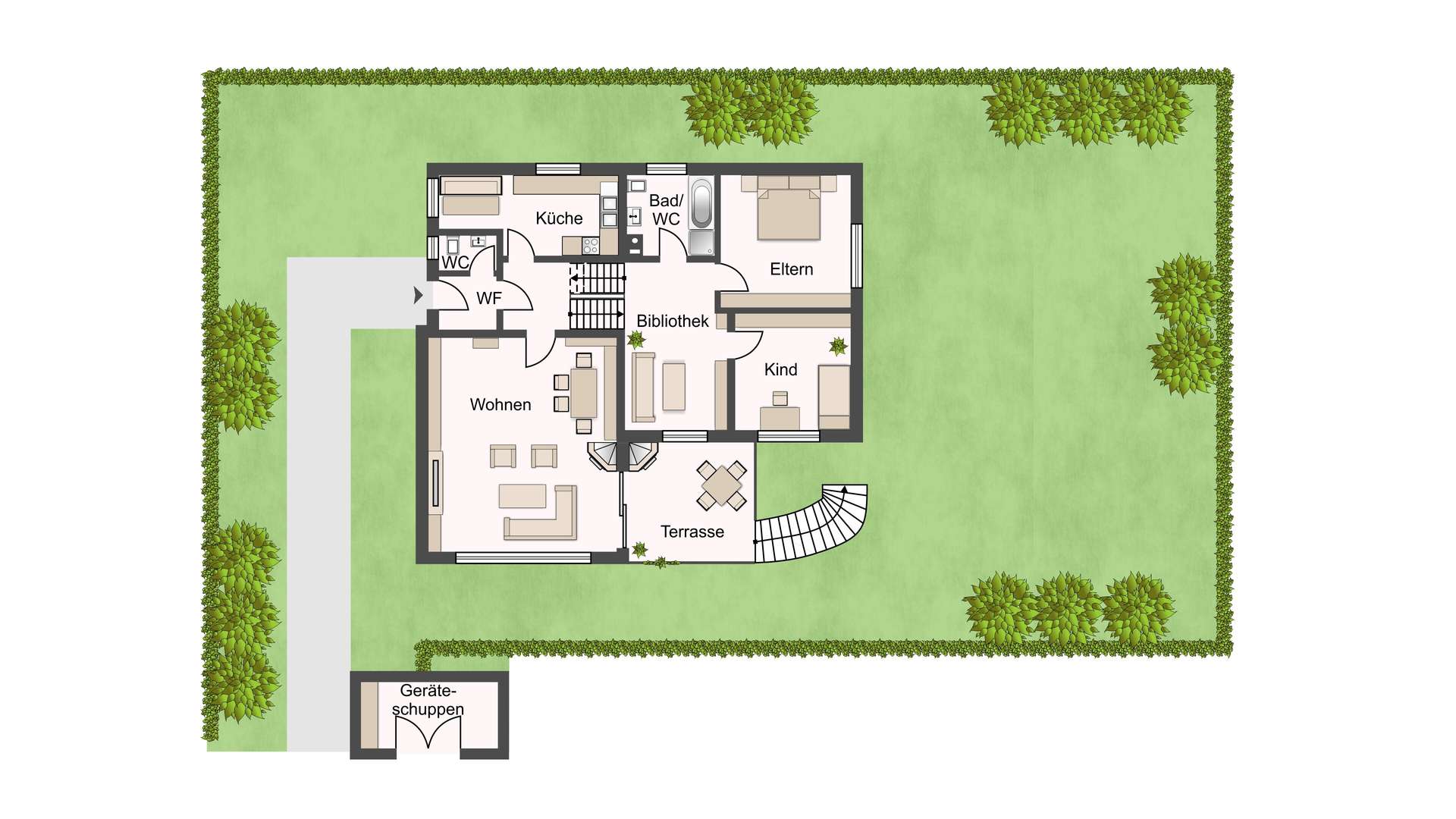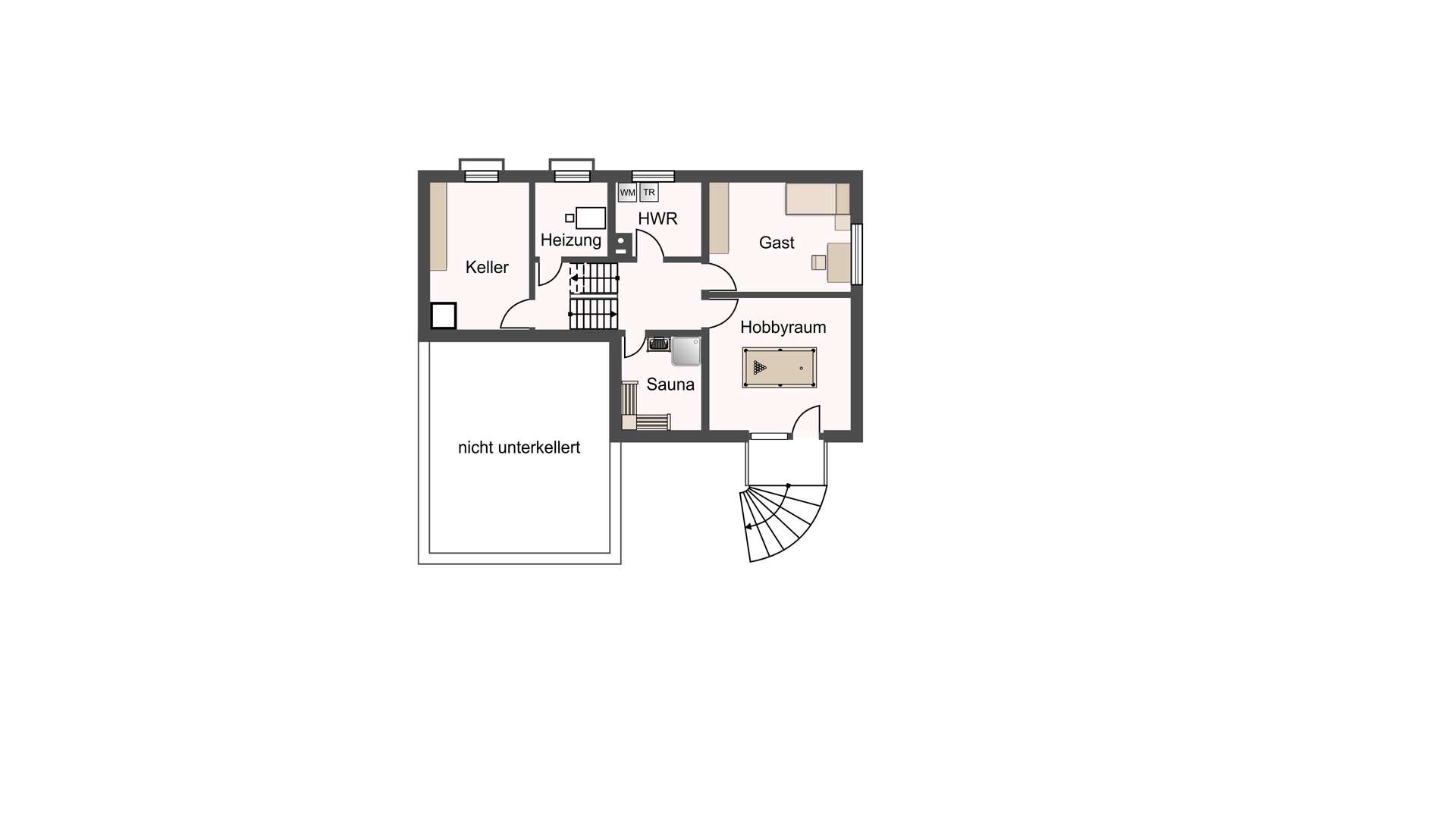 Die untere Wohnebene bietet mit Gästezimmer, Hauswirtschaftsraum, großem Hobbyraum mit Terrassenzugang und einem Saunabereich viel Flexibilität – ideal für Gäste, Wellness oder Arbeiten von zu Hause. Im darunterliegenden Keller befinden sich weitere Stauraumflächen und der Technikbereich. Jeder Raum im Haus ist durchdacht gestaltet und betont mit besonderen Details den hochwertigen Wohnkomfort.