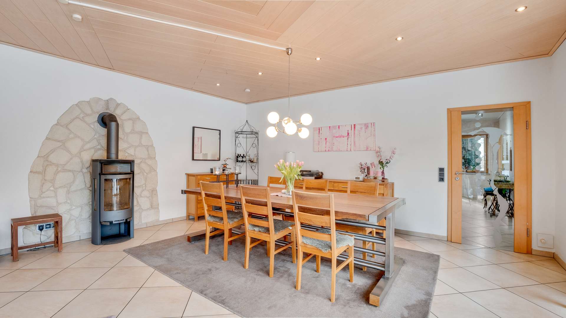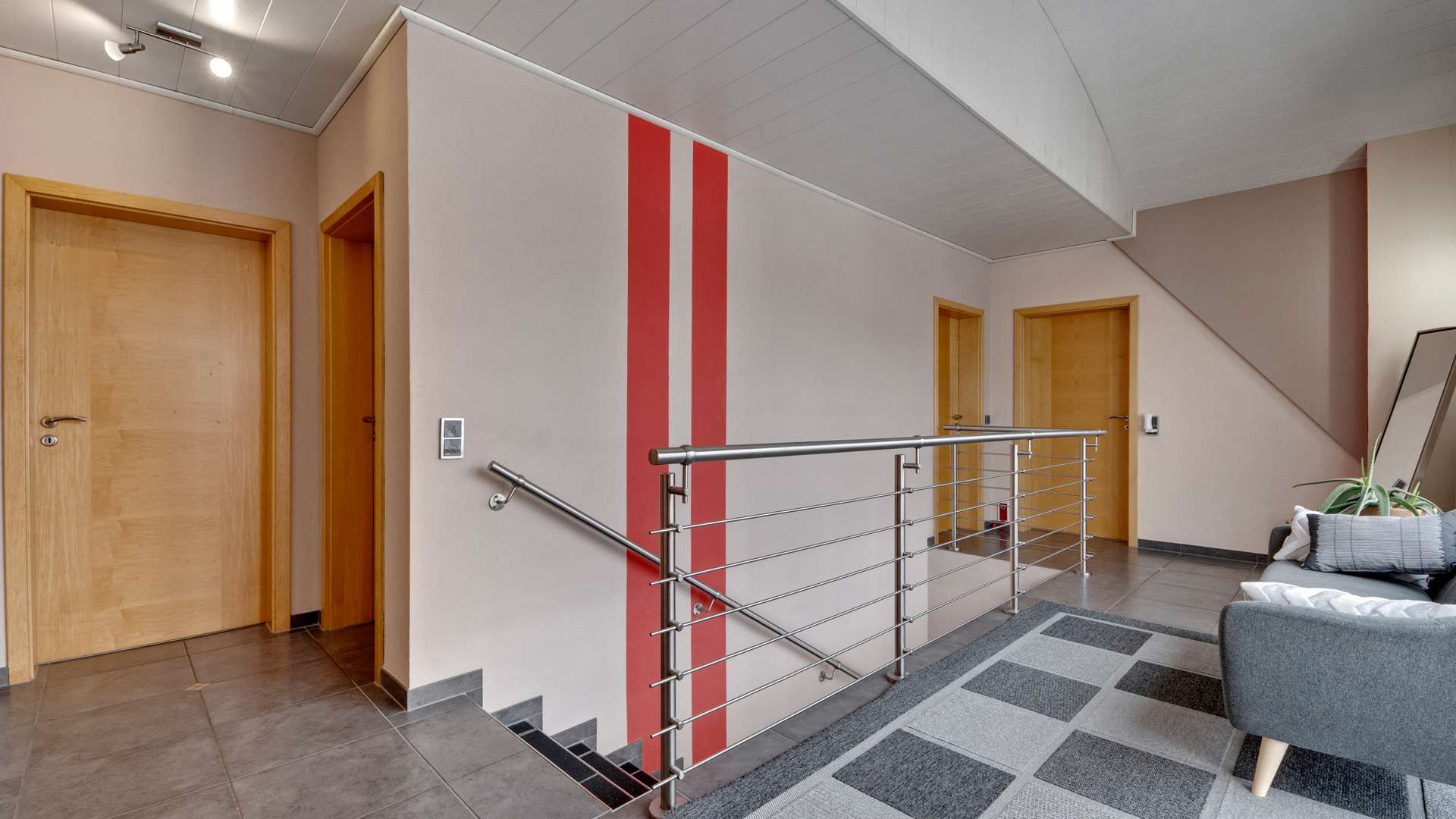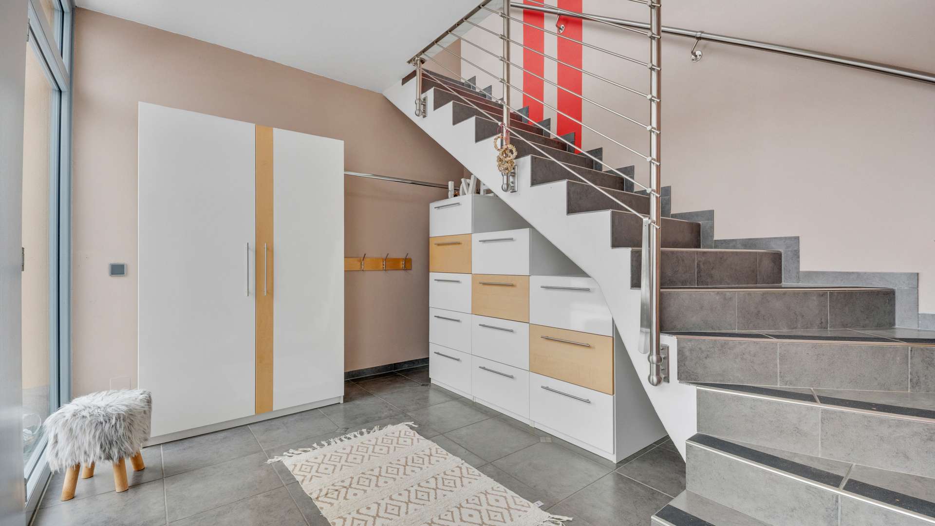 Die Innenräume begeistern mit Funktionalität und Großzügigkeit. Im Erdgeschoss empfängt Sie ein heller Windfang (Nebeneingang) sowie eine offene Diele mit moderner Treppe (Haupteingang). Der offene Wohn-/Essbereich ist dank bodentiefer Fenster lichtdurchflutet, ausgestattet mit stilvollem Kaminofen und direktem Zugang zur Terrasse. Die Einbauküche bietet moderne Elektrogeräte und viel Arbeitsfläche. Ebenfalls im Erdgeschoss: ein ruhiges Arbeitszimmer mit Zugang nach draußen und ein Badezimmer mit Wanne und Dusche sowie ein heller Flur. Im Dachgeschoss erwarten Sie ein Gästezimmer mit sichtbaren Holzbalken, ein separates WC, ein Hauswirtschaftsraum mit französischem Balkon sowie ein modernes Badezimmer mit bodengleicher Dusche und Wanne. Das großzügige Schlafzimmer sowie beide Kinderzimmer verfügen über bodentiefe Fenster mit französischem Balkon bzw. Zugang zur beeindruckenden Dachterrasse mit Edelstahlgeländer. Die Ankleide bietet optimalen Stauraum und rundet das komfortable Raumangebot ab. Die Dachterrasse ist über eine Wendeltreppe direkt mit dem Garten verbunden – ideal für flexible Wohnkonzepte.