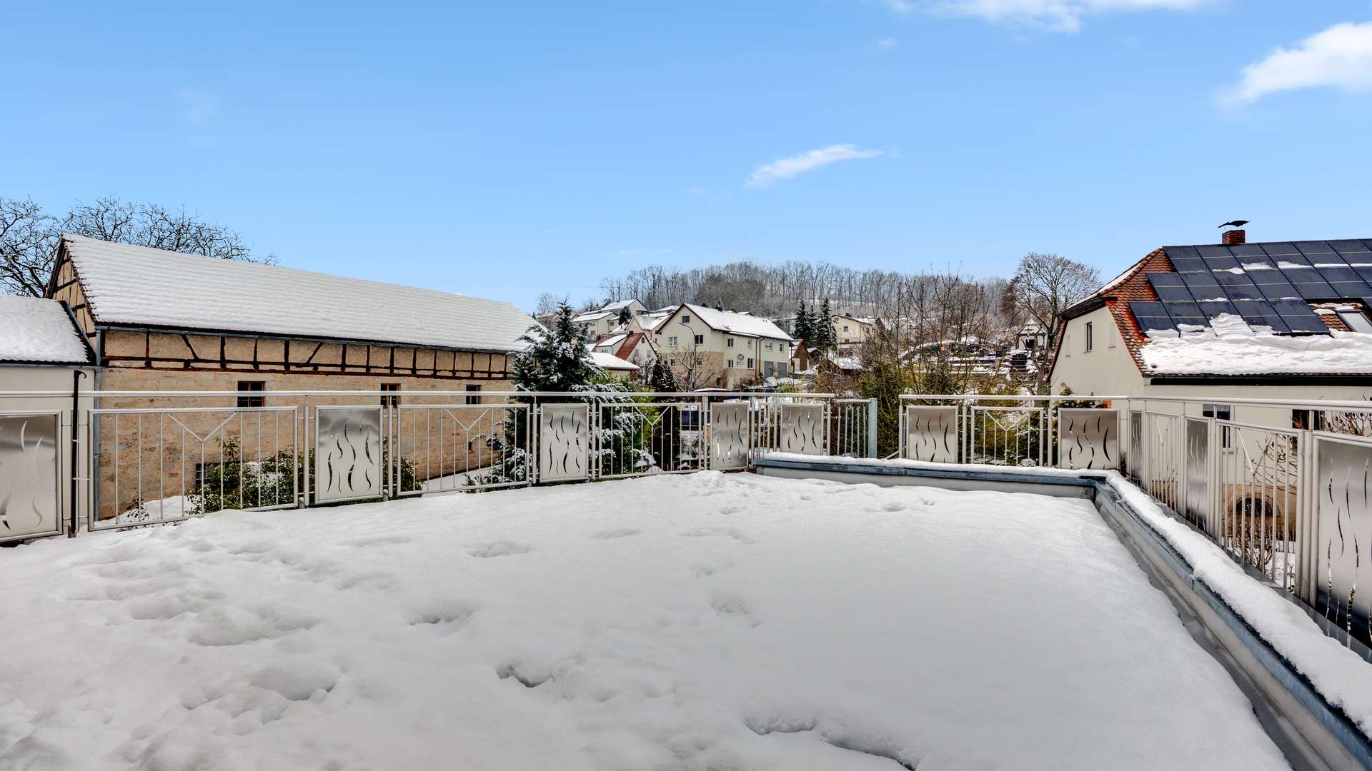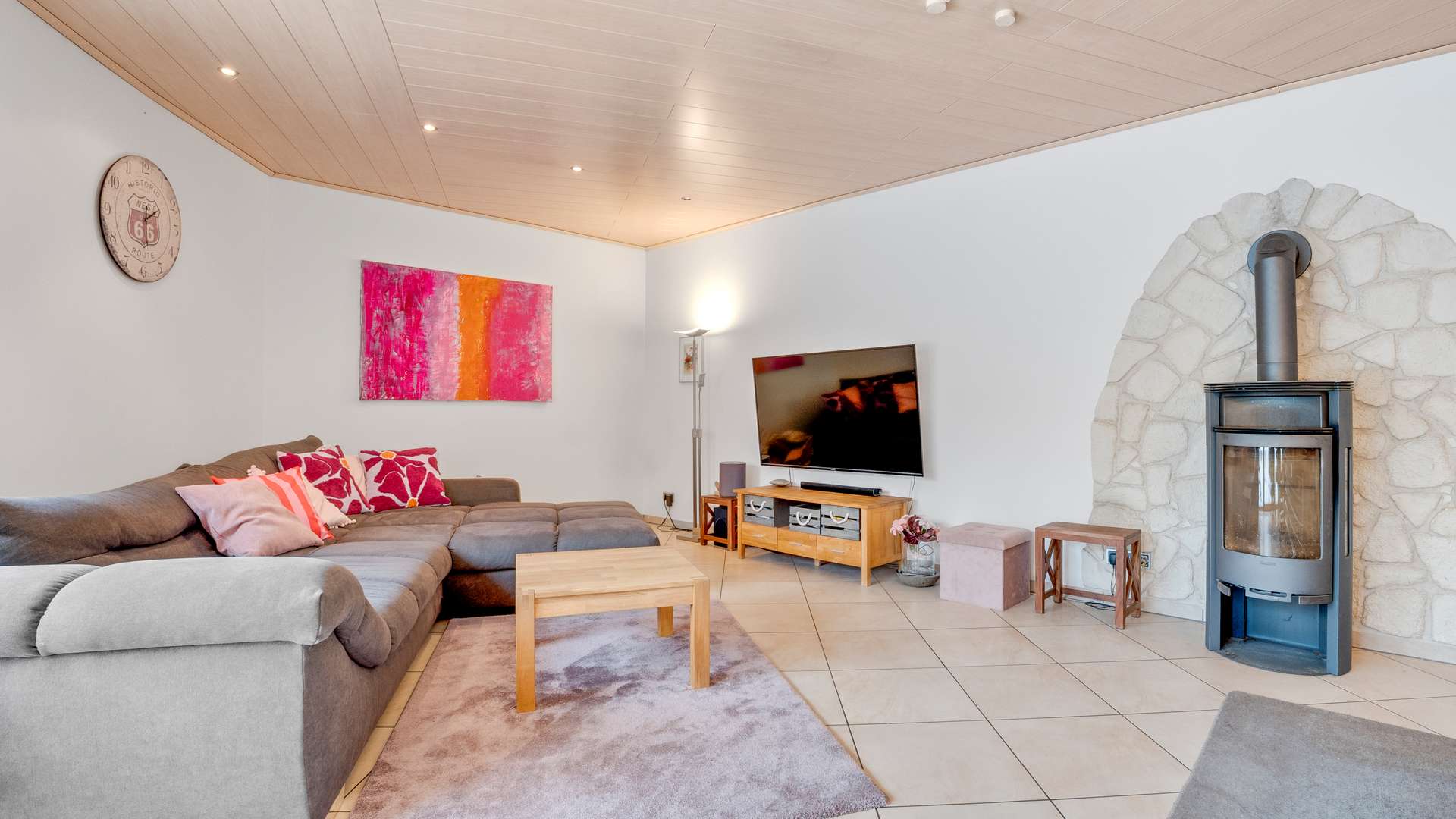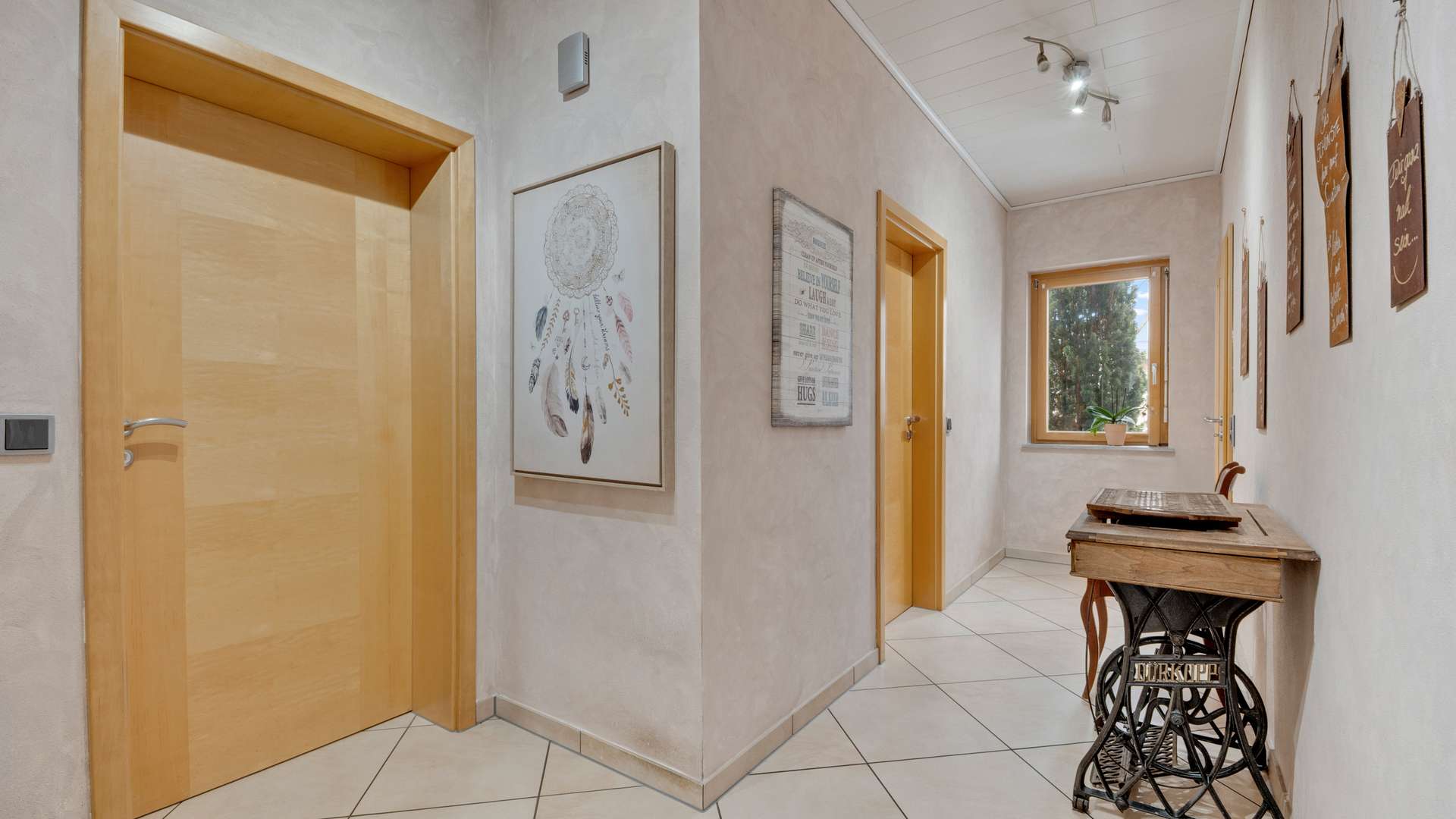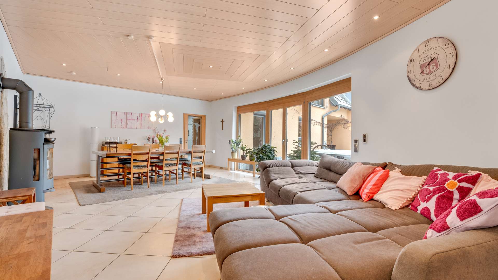 Die Innenräume begeistern mit Funktionalität und Großzügigkeit. Im Erdgeschoss empfängt Sie ein heller Windfang (Nebeneingang) sowie eine offene Diele mit moderner Treppe (Haupteingang). Der offene Wohn-/Essbereich ist dank bodentiefer Fenster lichtdurchflutet, ausgestattet mit stilvollem Kaminofen und direktem Zugang zur Terrasse. Die Einbauküche bietet moderne Elektrogeräte und viel Arbeitsfläche. Ebenfalls im Erdgeschoss: ein ruhiges Arbeitszimmer mit Zugang nach draußen und ein Badezimmer mit Wanne und Dusche sowie ein heller Flur. Im Dachgeschoss erwarten Sie ein Gästezimmer mit sichtbaren Holzbalken, ein separates WC, ein Hauswirtschaftsraum mit französischem Balkon sowie ein modernes Badezimmer mit bodengleicher Dusche und Wanne. Das großzügige Schlafzimmer sowie beide Kinderzimmer verfügen über bodentiefe Fenster mit französischem Balkon bzw. Zugang zur beeindruckenden Dachterrasse mit Edelstahlgeländer. Die Ankleide bietet optimalen Stauraum und rundet das komfortable Raumangebot ab. Die Dachterrasse ist über eine Wendeltreppe direkt mit dem Garten verbunden – ideal für flexible Wohnkonzepte.