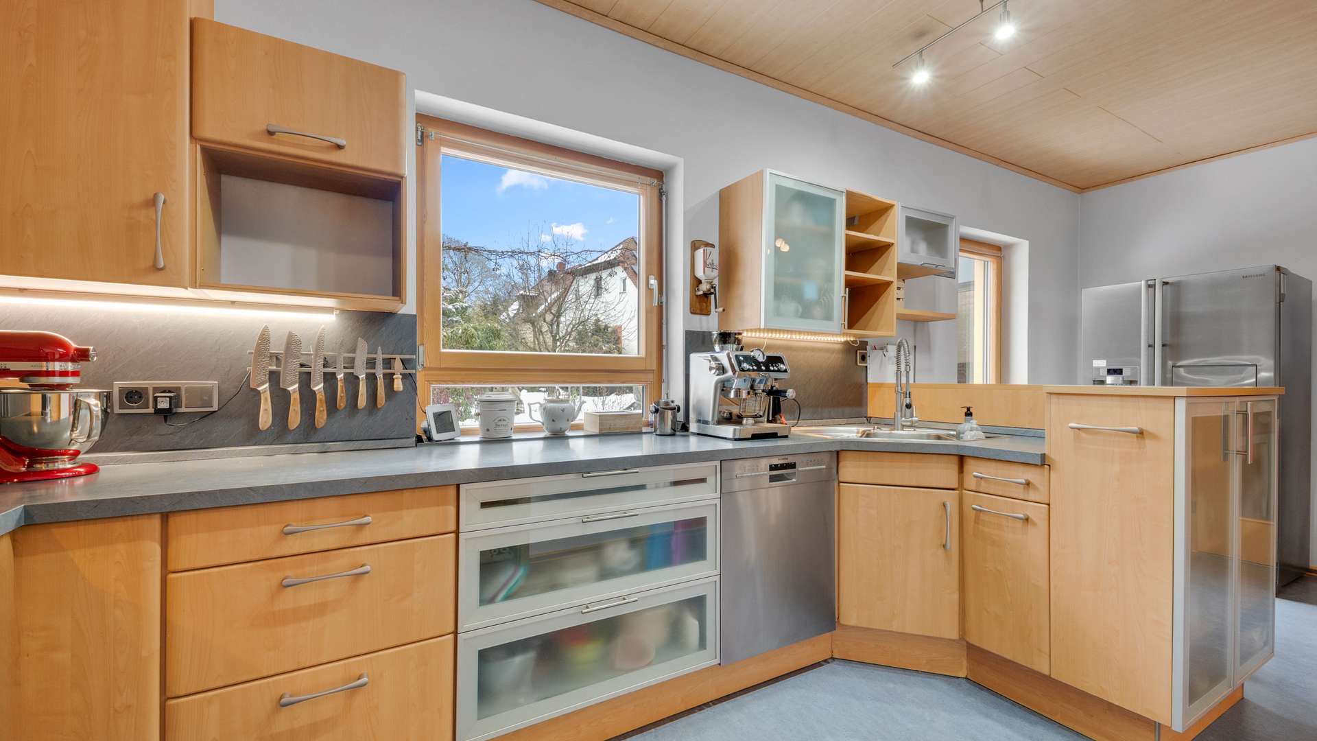 Die Bauweise überzeugt durch massive Poroton-Außenwände (36,5cm), gedämmter Bodenplatte und solide Stahlbetondecken. Das Dach ist mit 20cm Mineralwolle zwischen den Sparren gedämmt und mit schwarzen Betondachsteinen eingedeckt. Die Tonnendachgauben aus Titanzink setzen architektonische Akzente. Die hochwertigen Holz-Alu-Fenster mit Doppelverglasung und elektrischen Rollläden im Wohn-/Esszimmer sorgen für angenehmes Raumklima und Komfort. Die moderne Gas-Brennwertheizung (2023) mit Warmwasserspeicher (2022) und Solarthermie-Anlage trägt zu hoher Energieeffizienz bei. Im Erdgeschoss wird über eine Fußbodenheizung geheizt, im Dachgeschoss über Heizkörper mit Einzelraumregelung. Ein Kaminofen inkl. Außenkamin aus Edelstahl wurde 2015 installiert. Internet via DSL (100MBit) und eine Satellitenschüssel ist vorhanden. Die Elektrik entspricht modernstem Standard – mit FI-Schalter und 3-fach abgesichertem Herdanschluss.