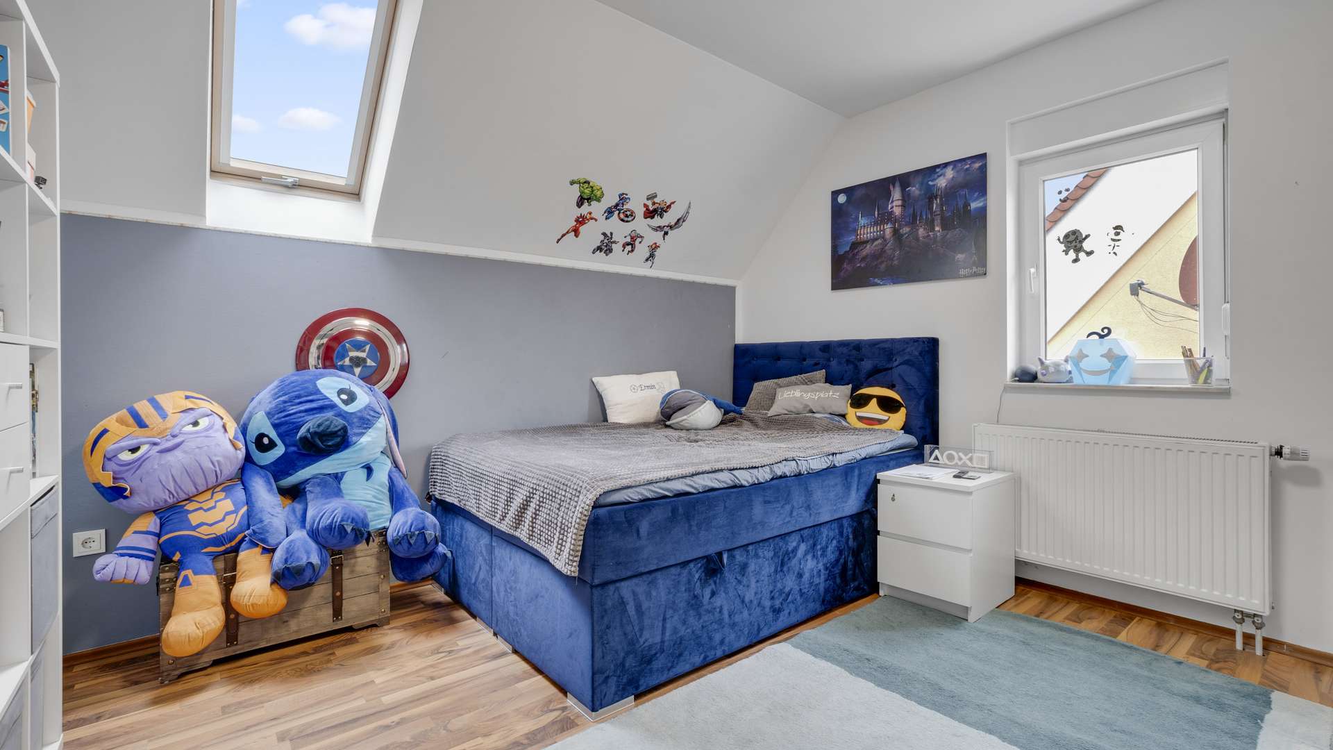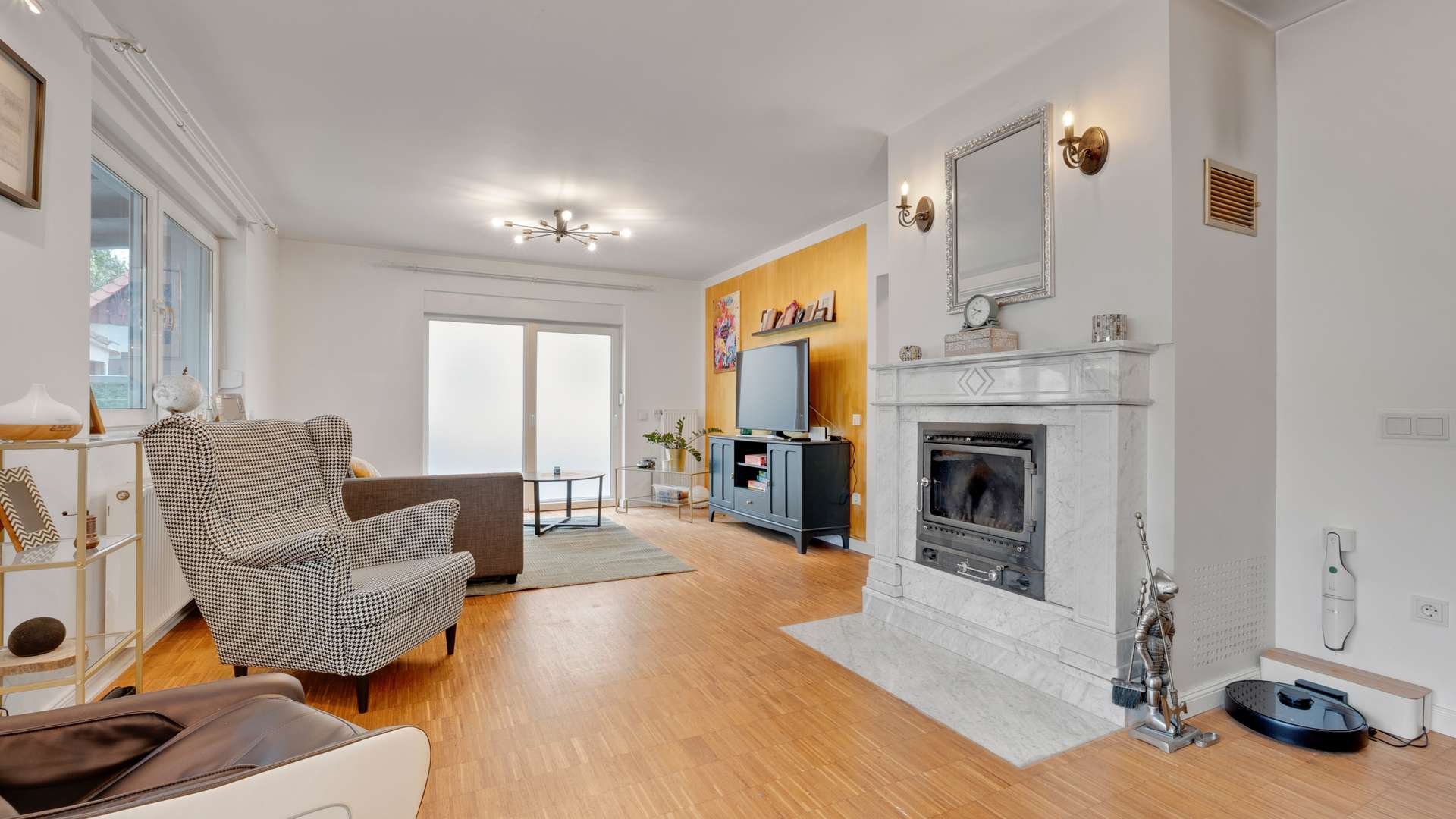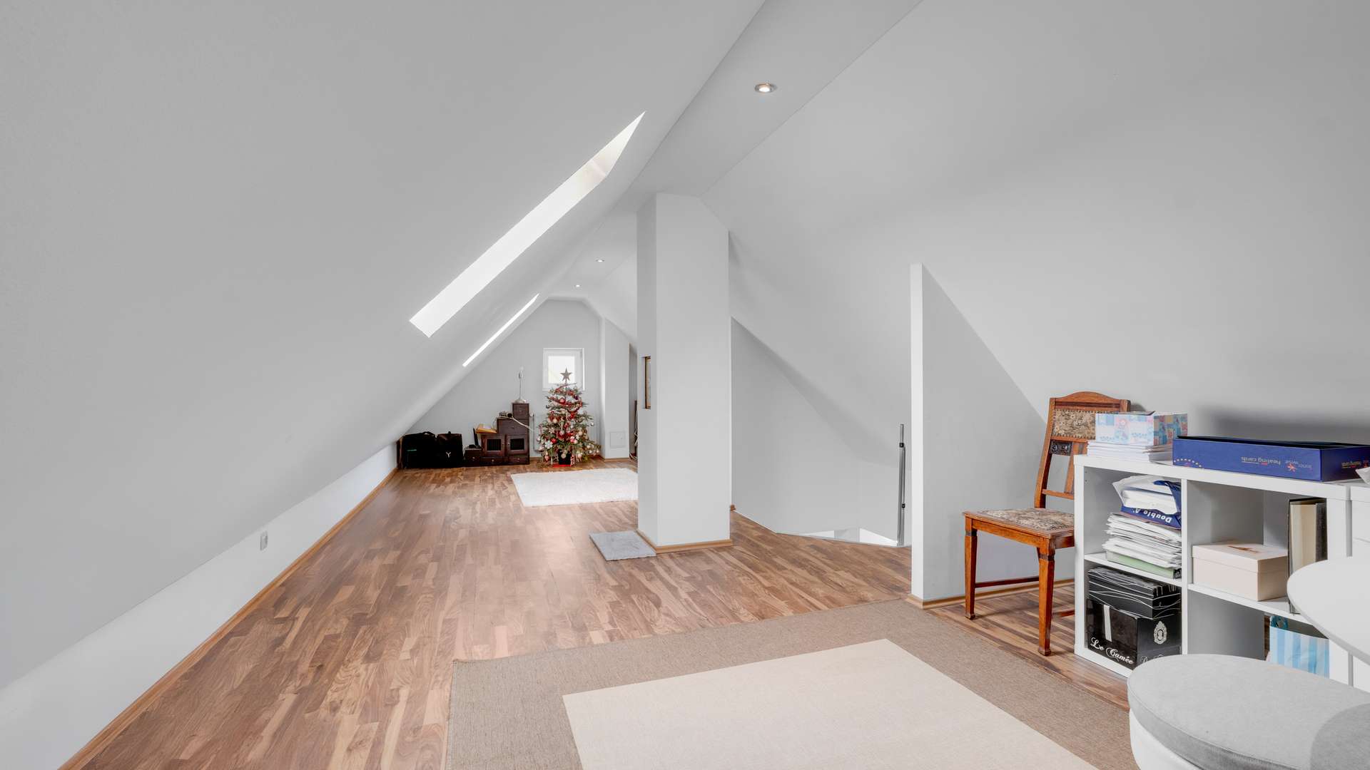Im Erdgeschoss erwartet Sie ein großzügiger, lichtdurchfluteter Wohn- und Essbereich mit 39m², hochwertigem Kamin mit Marmorverkleidung und direktem Zugang zur überdachten 41m² großen Südterrasse mit Feuerstelle. Die offene Inselküche mit hochwertigen Materialien ist im Kaufpreis enthalten. Ergänzt wird das Erdgeschoss durch einen Windfang, ein Gäste-WC mit vorbereitetem Abfluss für eine Dusche sowie Marmorfensterbänke und eine Raumhöhe von 2,51m. Im Obergeschoss befinden sich drei Schlafzimmer – darunter ein 20m² großes Elternschlafzimmer – sowie ein komfortables Badezimmer mit Dusche, Badewanne und Handtuchheizkörper. Der vollständig ausgebaute Spitzboden eignet sich ideal als Kinder- oder Lesezimmer. Im beheizten Keller mit 35,79m² Nutzfläche finden Sie neben dem Wäscheraum auch einen WC-Anschluss und edle Granitfliesen.