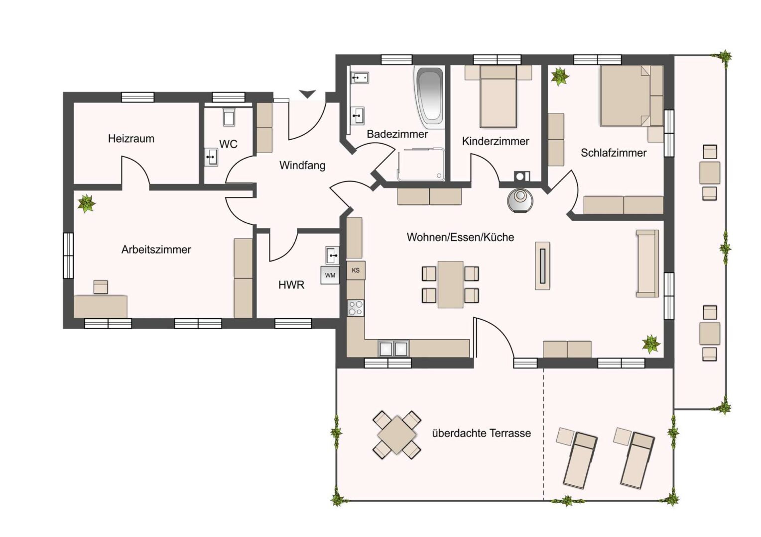 Im Inneren eröffnet sich ein lichtdurchfluteter Wohntraum: Der zentrale Wohn- und Essbereich mit offener Küche misst großzügige 49,42m² und beeindruckt durch zahlreiche Fensterfronten mit direktem Zugang zur 63,40m² großen, teils überdachten Terrasse. Diese ist hochwertig gepflastert und bietet einen wunderbaren Blick in den Garten mit vollkommener Privatsphäre. Die Küche überzeugt mit hochwertigen Markengeräten, Bora-Kochfeld und Quarzkompositspüle in edler Betonoptik. Zwei Schlafzimmer mit 16,65m² und 10,32m² bieten individuelle Rückzugsmöglichkeiten. Das stilvolle Hauptbadezimmer verfügt über eine fugenfreie 140x90cm große Regendusche und eine Hoesch-Badewanne. Ein separates Gäste-WC mit Designerwaschbecken sowie ein großzügiger Hauswirtschaftsraum mit eigener Einbauküche und Anschluss für Waschmaschine und Trockner sorgen für durchdachten Komfort. Ein weiteres Highlight ist das 22,27m² große Arbeitszimmer mit breiter Fensterfront – ideal als separates Homeoffice oder für gewerbliche Nutzung.