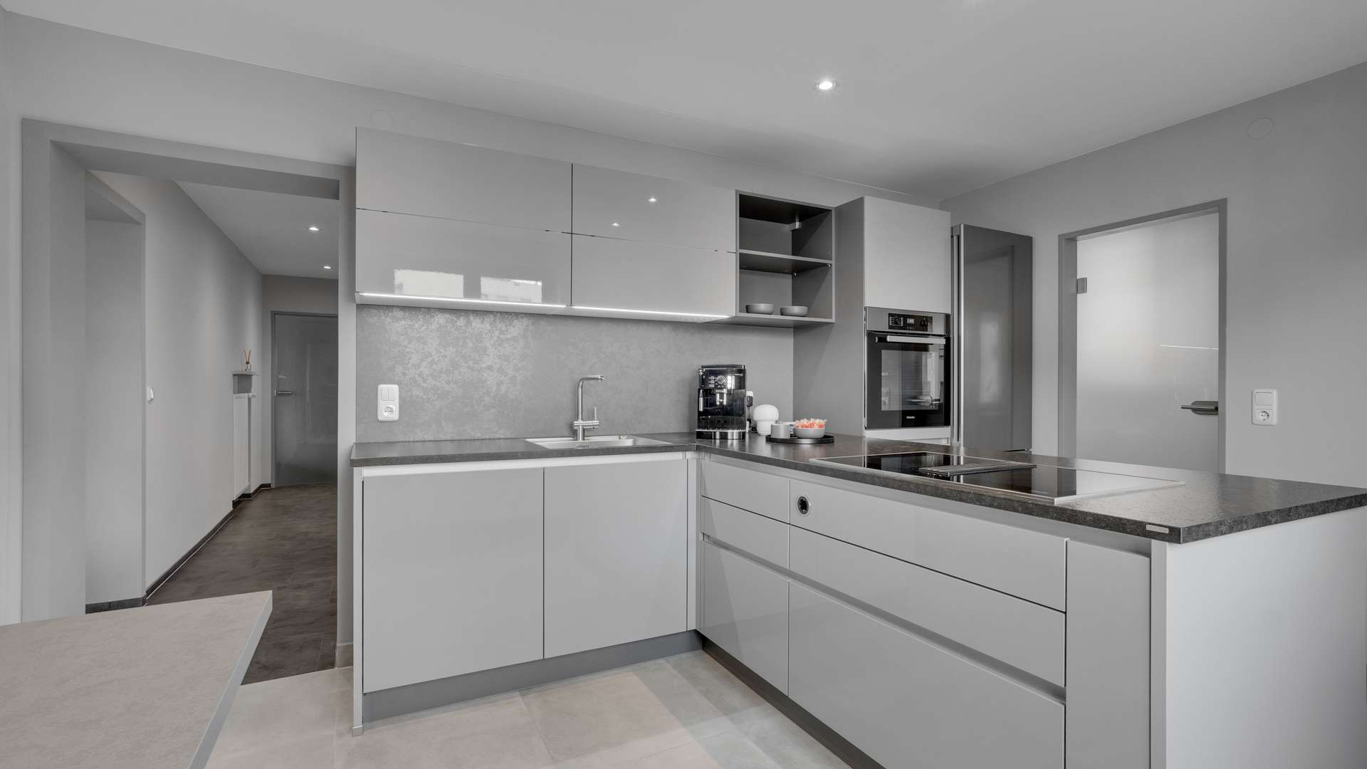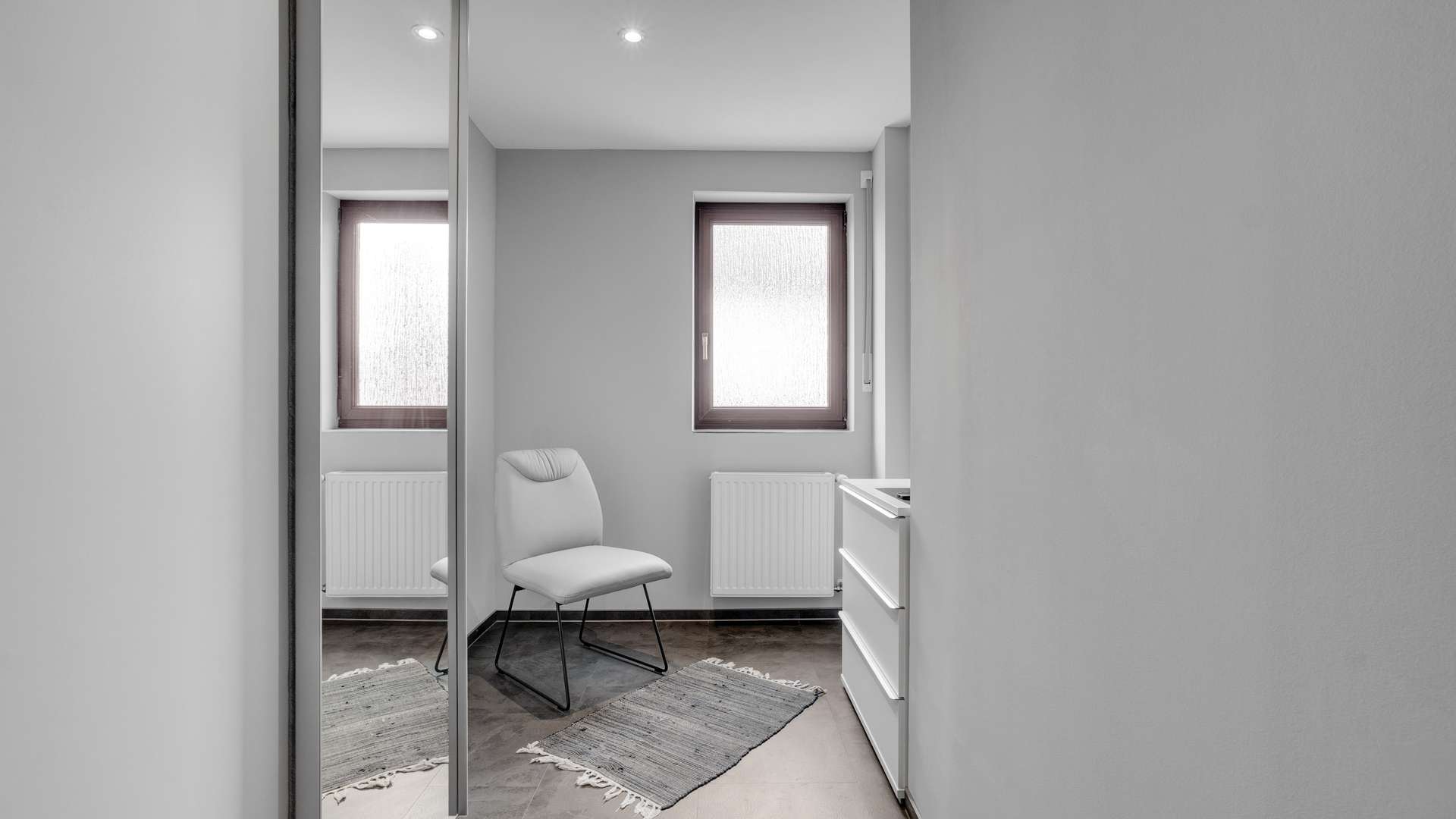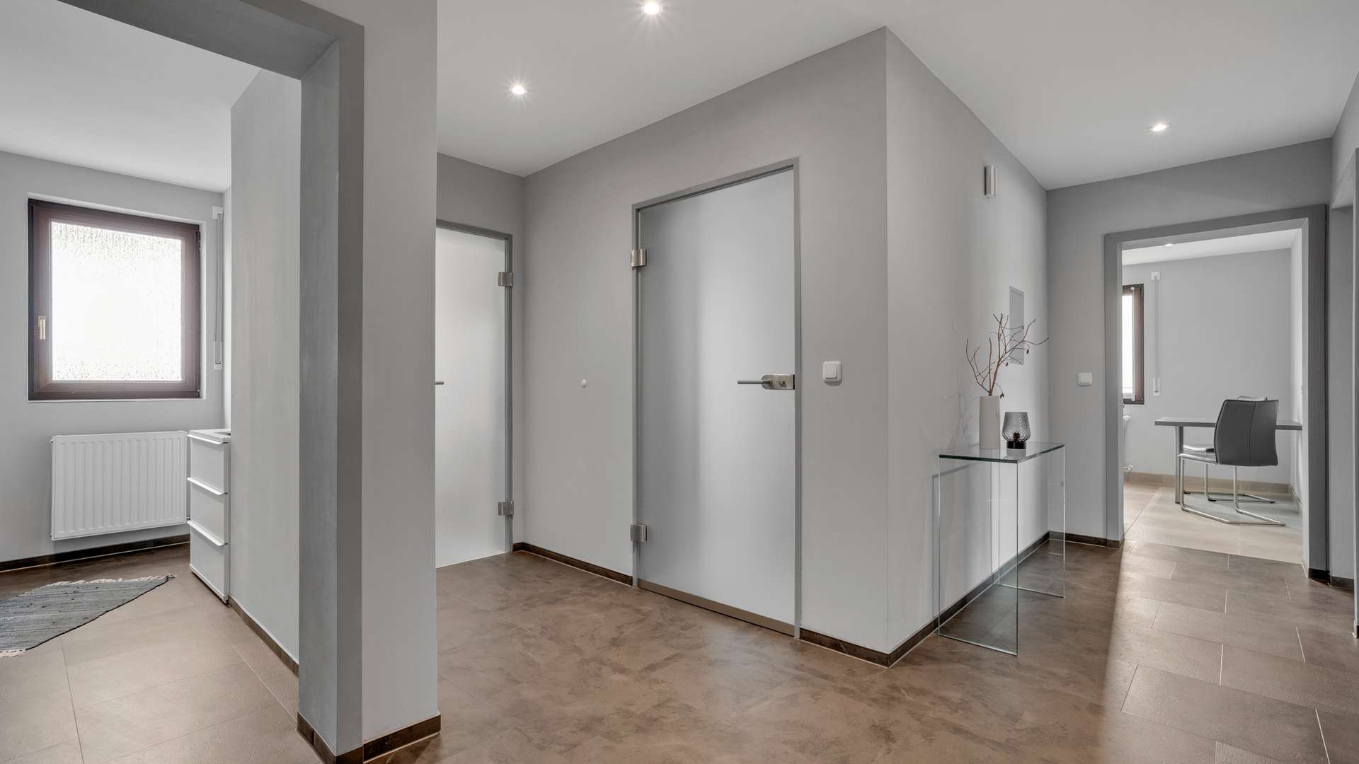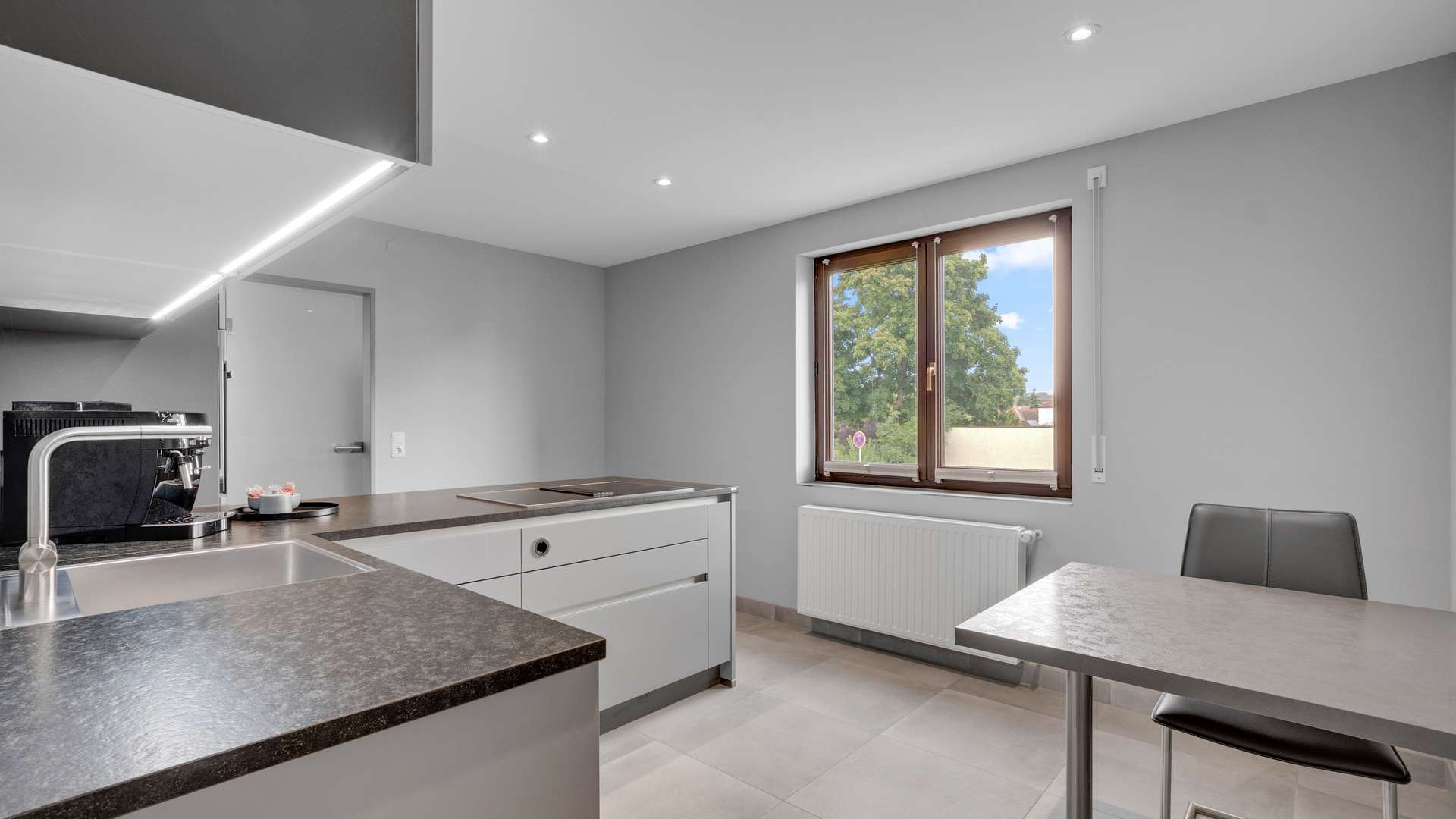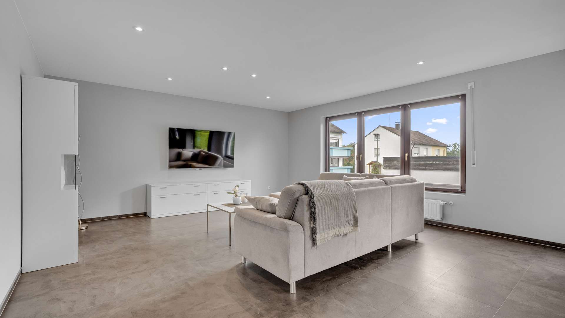 Wohnung 1 begeistert mit offenem Wohn- und Essbereich (39,74 m²), großen Fensterflächen und Zugang zur Südterrasse mit herrlichem Gartenblick. Im Wohn- und Schlafzimmer sorgen Klimaanlagen für angenehme Temperaturen. Eine Ankleide mit ca. 6 m² ergänzt das Raumangebot. Die hochwertige Hertel-Küche mit Steinarbeitsplatte, Speisekammer und modernen Geräten erfüllt höchste Ansprüche. Das barrierefreie Bad mit Regendusche, Fußbodenheizung und separatem WC überzeugt durch modernes Design. Milchglastüren, edler Fliesenboden und LED-Spots runden das Ambiente ab.