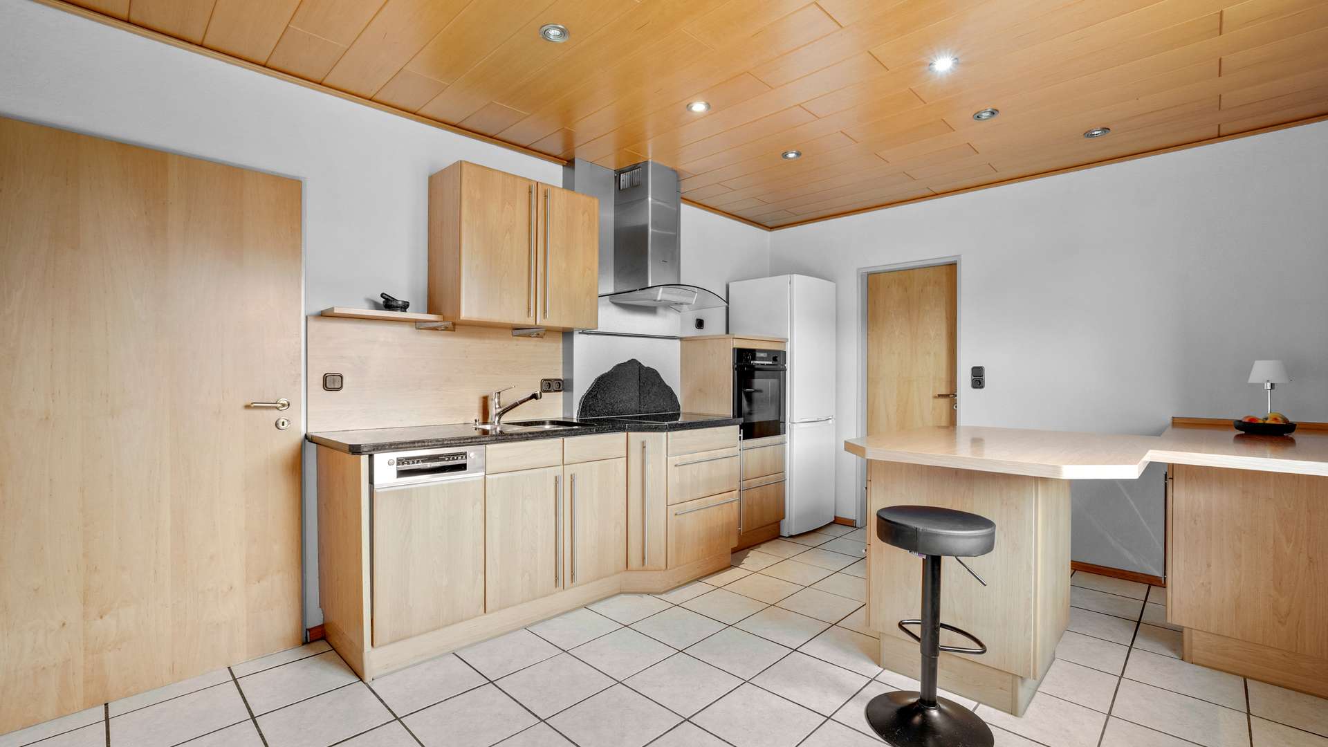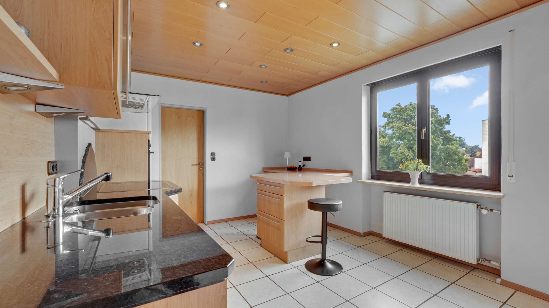 Wohnung 2 im Obergeschoss bietet einen großzügigen Wohn- und Essbereich mit Balkonzugang, Arbeitszimmer und Abstellraum. Auch hier sind im Arbeits- und Wohnbereich Klimaanlagen vorhanden. Die Küche ist mit Granitarbeitsplatte, Speisekammer und neuwertiger Spülmaschine (2023) ausgestattet. Das Bad mit Eckwanne, bodengleicher Dusche und Fußbodenheizung sowie die Böden wurden 2005 hochwertig modernisiert. Im Dachgeschoss befinden sich zwei zusätzliche Schlafzimmer und ein ausbaufähiger Dachboden.