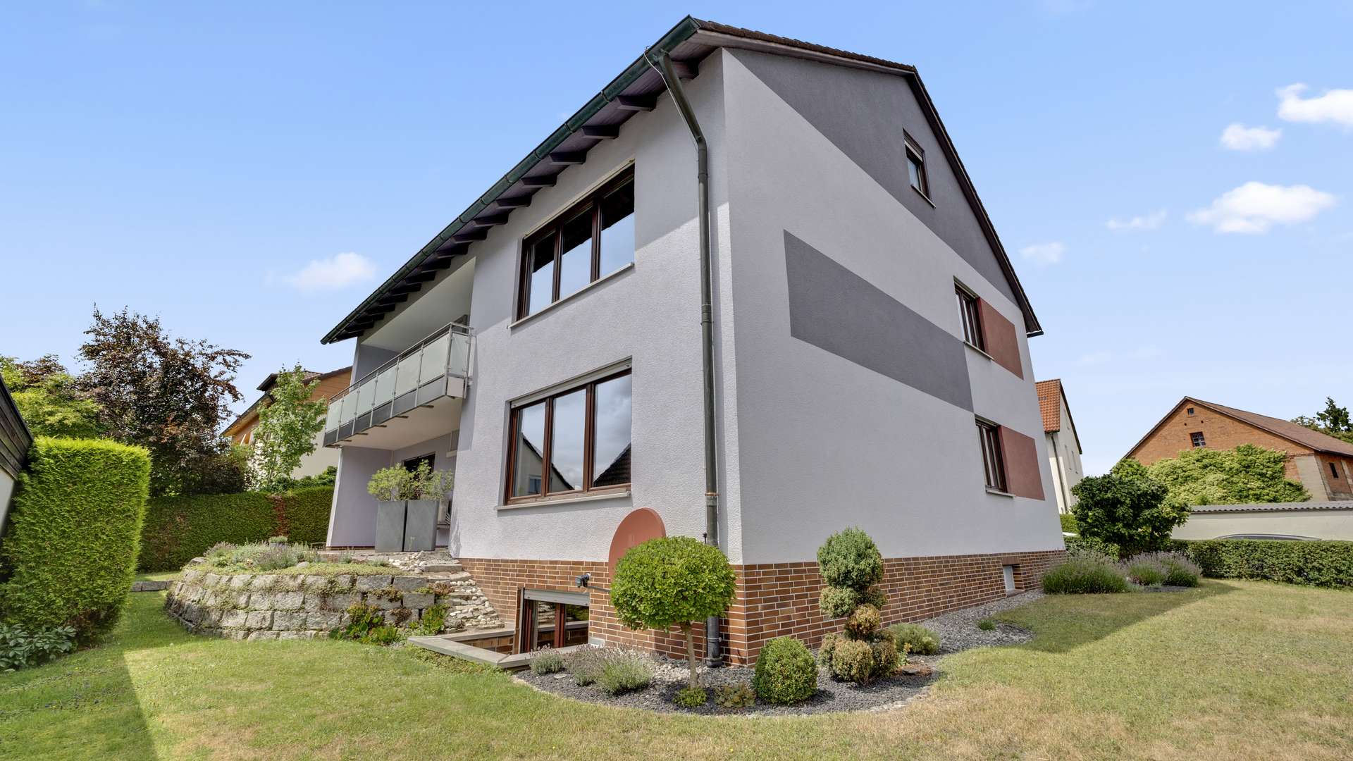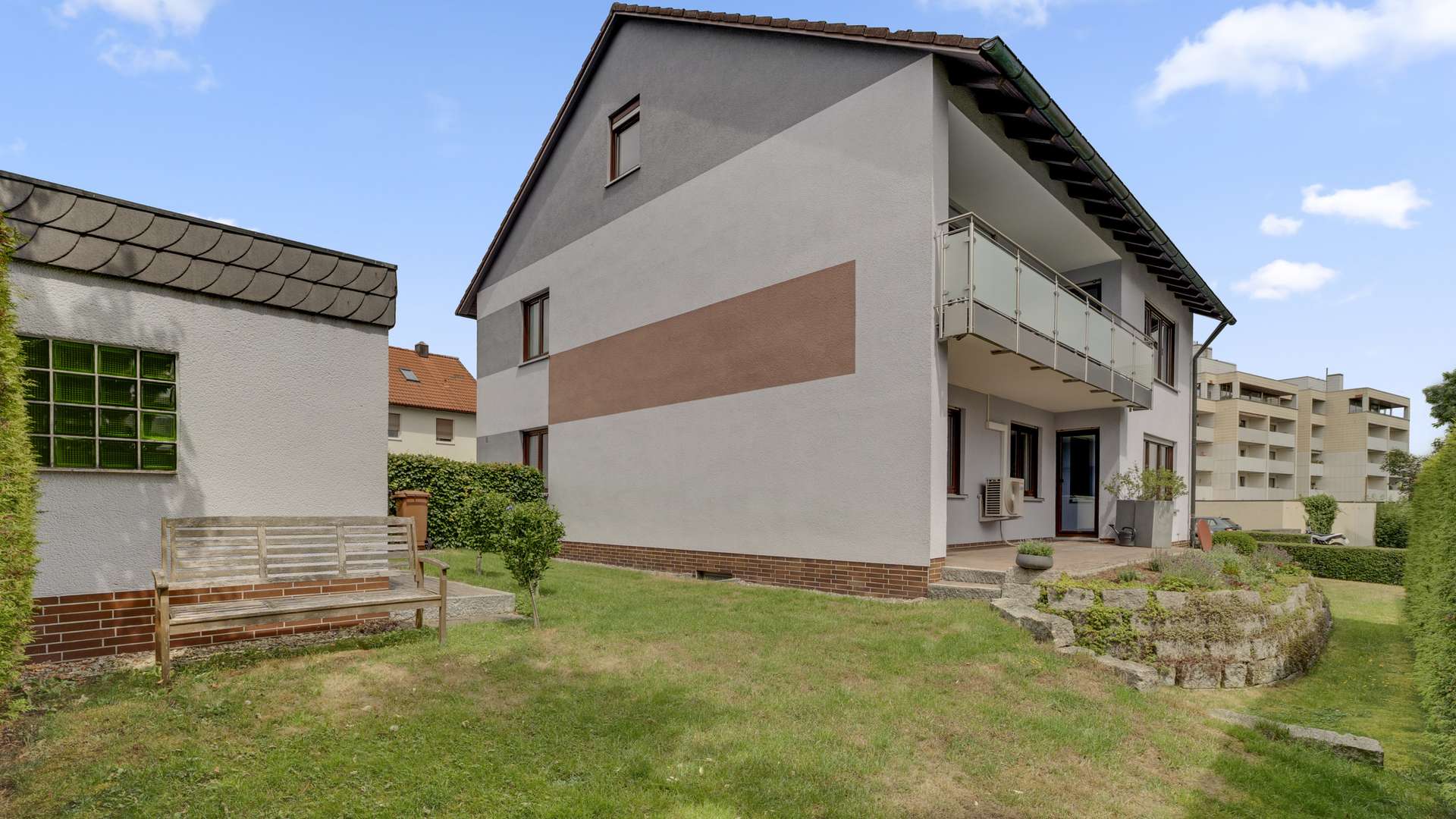 Das 1976 erbaute Haus umfasst drei vollwertige Wohnetagen sowie ein unterkellertes Sockelgeschoss. Wohnung 1 mit 115,38 m² liegt im Erdgeschoss, Wohnung 2 mit 156,73 m² erstreckt sich über Ober- und Dachgeschoss. Das 551 m² große Grundstück präsentiert sich mit liebevoll angelegten Beeten, formschöner Ligusterhecke und üppiger Bepflanzung als grüne Oase. Eine große Garage mit Abstellraum sowie zwei zusätzliche Stellplätze bieten Platz für Fahrzeuge und Lagermöglichkeiten. Die funktionale Gliederung des Hauses erlaubt vielfältige Nutzungskonzepte und bietet jeder Generation ihren eigenen Rückzugsraum.