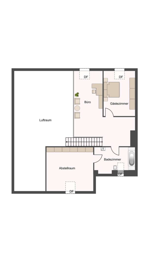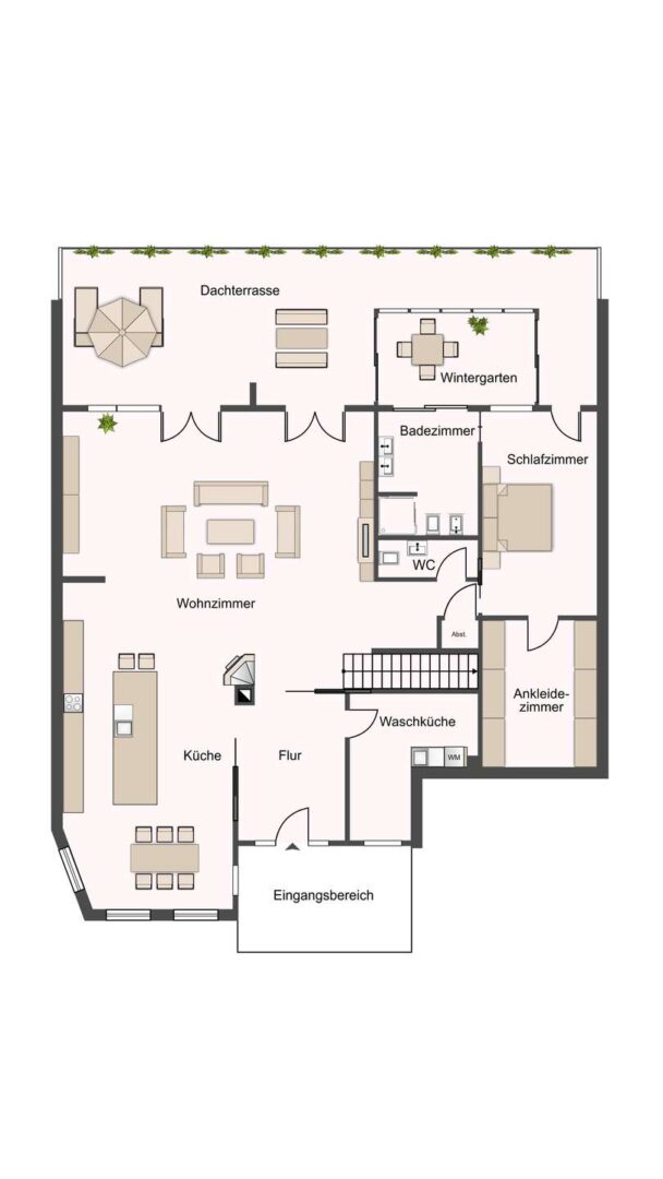 Bereits beim Betreten der Wohnung empfängt Sie ein privater Eingangsbereich mit kleinem Vorgarten – ein seltenes Privileg in einem Penthouse. Der einladende Flur lässt sich durch hochwertige Schiebetüren flexibel öffnen oder schließen. Im Mittelpunkt steht der ca. 90 m² große Wohn- und Essbereich, geprägt von beeindruckender Architektur, einem großen elektrischen Lichtschacht und bodentiefen Fenstern, die den ganzen Tag über für natürliche Helligkeit sorgen. Eine stilvolle Kaminecke lädt in der kühlen Jahreszeit zum Verweilen ein. Die angrenzende Dachterrasse mit ca. 56 m² in Westausrichtung bietet einen herrlichen Rückzugsort im Freien. Die offene Küche ist mit einer edlen Steinplatte, hochwertigen Geräten und integrierter Revox-Soundanlage ausgestattet. Der private Masterbereich überzeugt mit Schlafzimmer, Ankleide, Bad und einem eigenen Wintergarten. Im Obergeschoss befinden sich eine luftige Galerie, ein weiteres großzügiges Zimmer mit Bad sowie ein Abstellraum. Ein separater Hauswirtschaftsraum mit Anschlüssen für Waschmaschine und Trockner ist ebenfalls vorhanden.