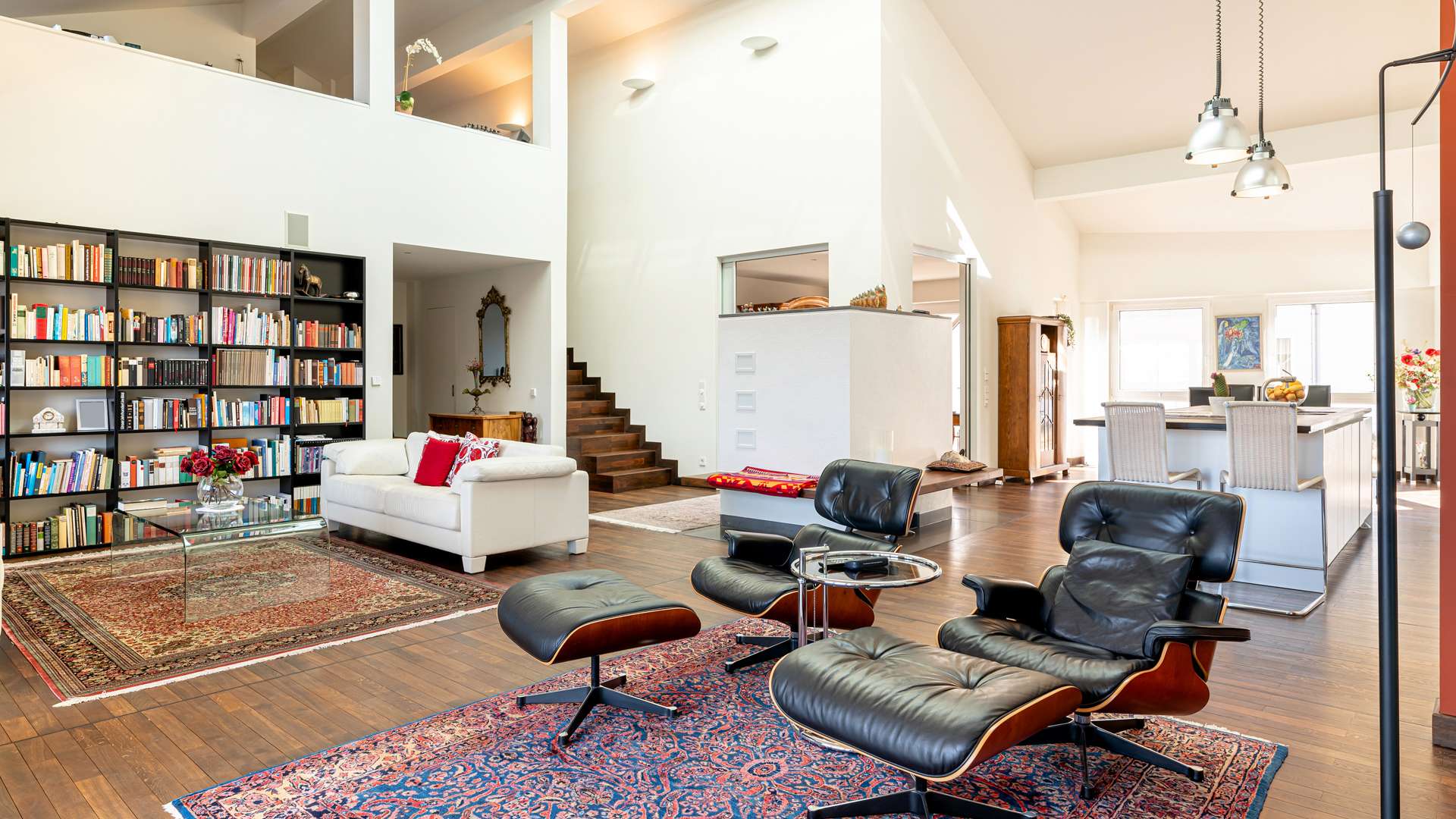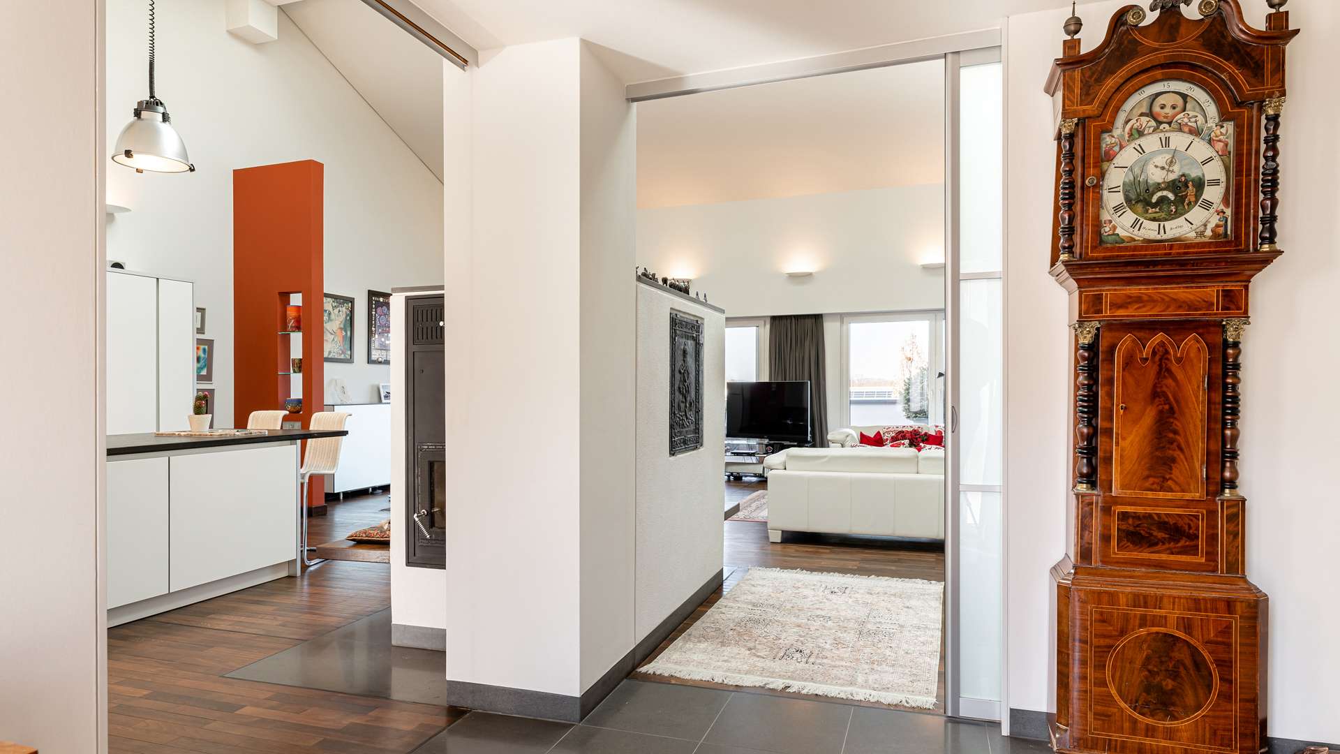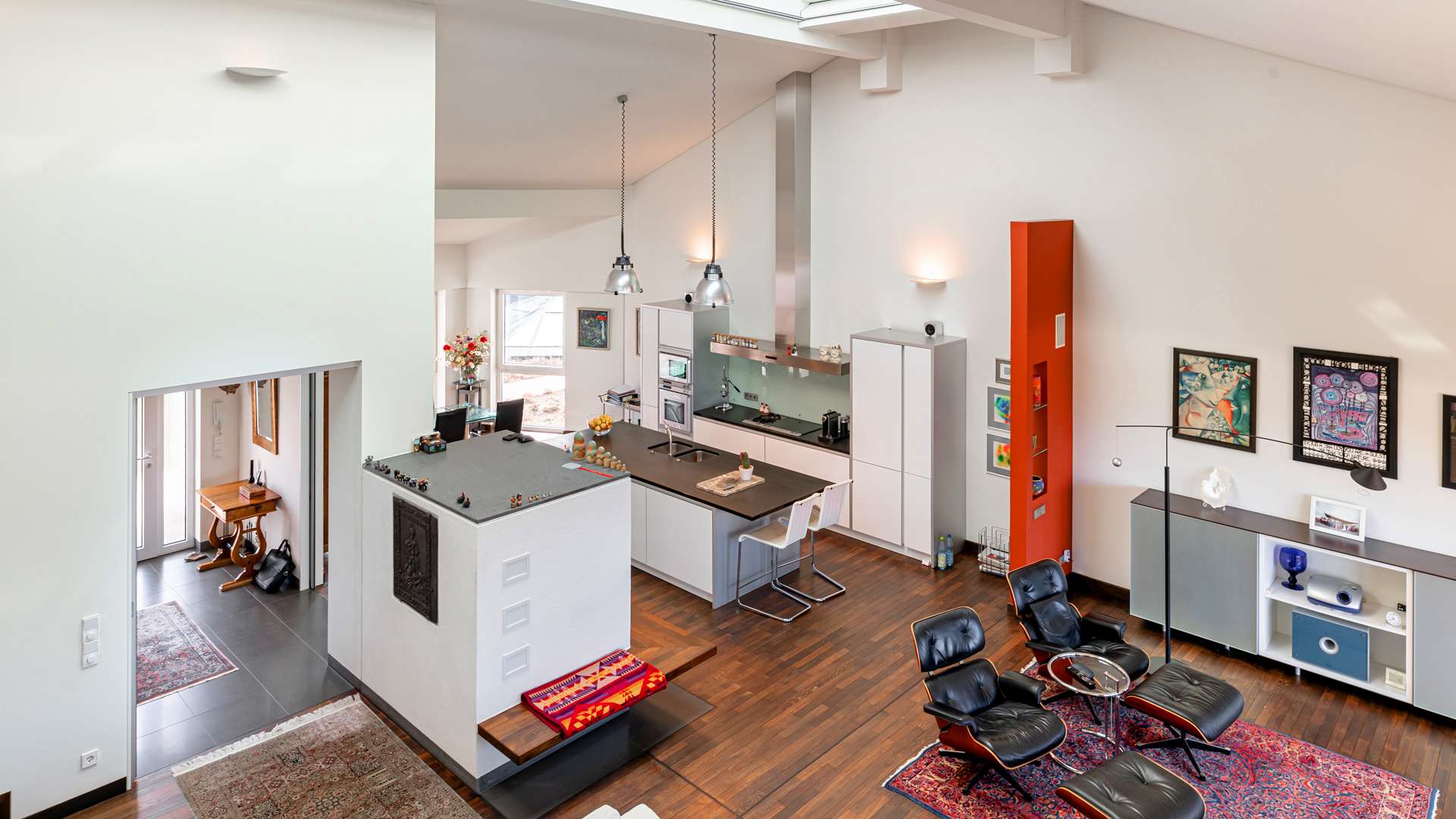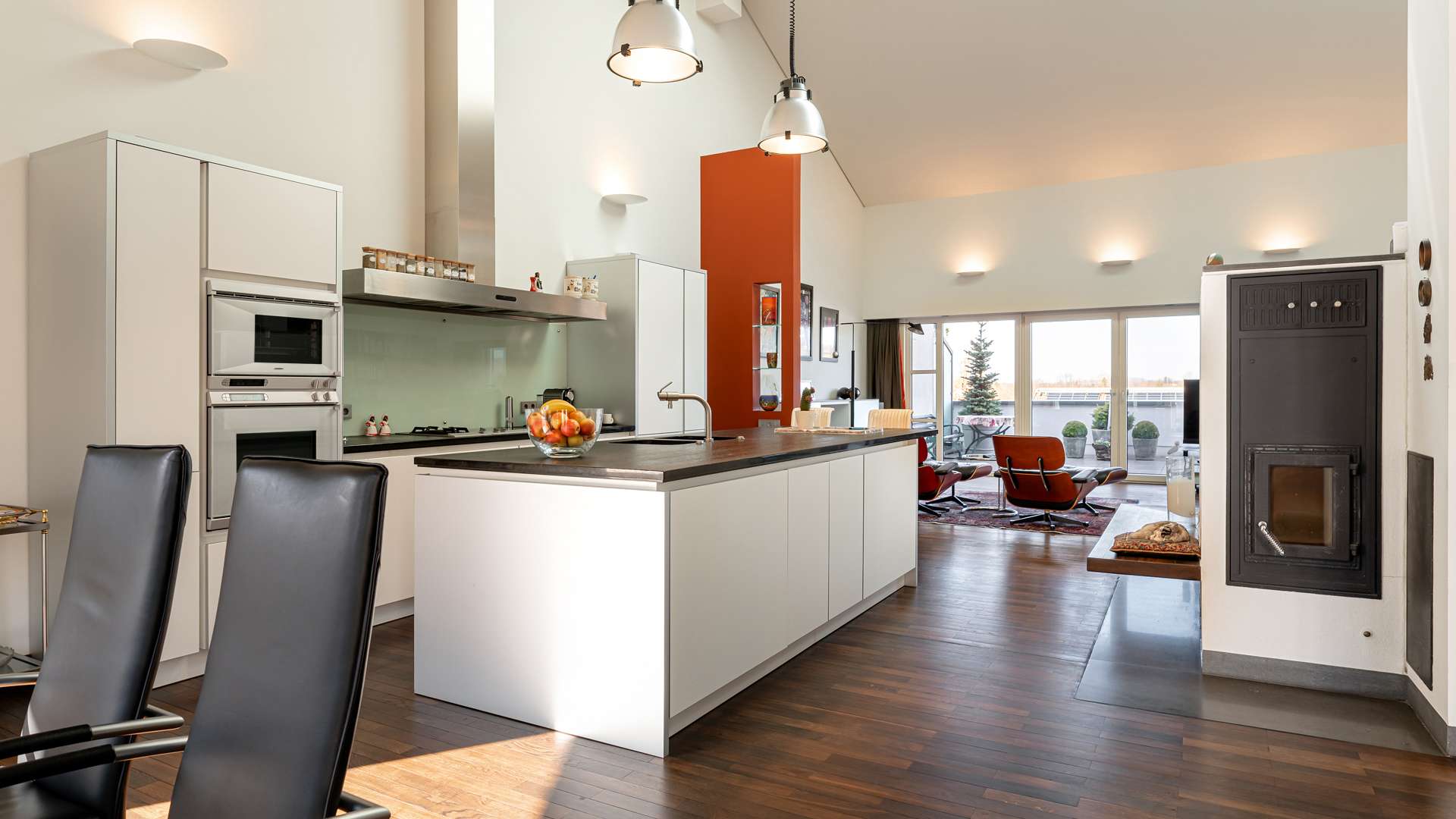 Bereits beim Betreten der Wohnung empfängt Sie ein privater Eingangsbereich mit kleinem Vorgarten – ein seltenes Privileg in einem Penthouse. Der einladende Flur lässt sich durch hochwertige Schiebetüren flexibel öffnen oder schließen. Im Mittelpunkt steht der ca. 90m² große Wohn- und Essbereich, geprägt von beeindruckender Architektur, einem großen elektrischen Lichtschacht und bodentiefen Fenstern, die den ganzen Tag über für natürliche Helligkeit sorgen. Eine stilvolle Kaminecke lädt in der kühlen Jahreszeit zum Verweilen ein. Die angrenzende Dachterrasse mit ca. 56m² in Westausrichtung bietet einen herrlichen Rückzugsort im Freien. Die offene Küche ist mit einer edlen Steinplatte, hochwertigen Geräten und integrierter Revox-Soundanlage ausgestattet. Der private Masterbereich überzeugt mit Schlafzimmer, Ankleide, Bad und einem eigenen Wintergarten. Im Obergeschoss befinden sich eine luftige Galerie, ein weiteres großzügiges Zimmer mit Bad sowie ein Abstellraum. Ein separater Hauswirtschaftsraum mit Anschlüssen für Waschmaschine und Trockner ist ebenfalls vorhanden.