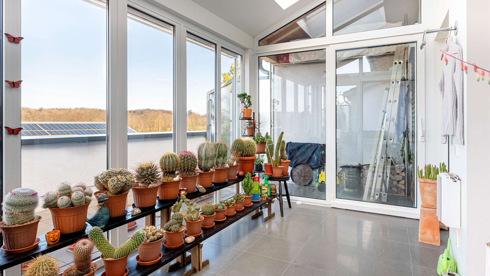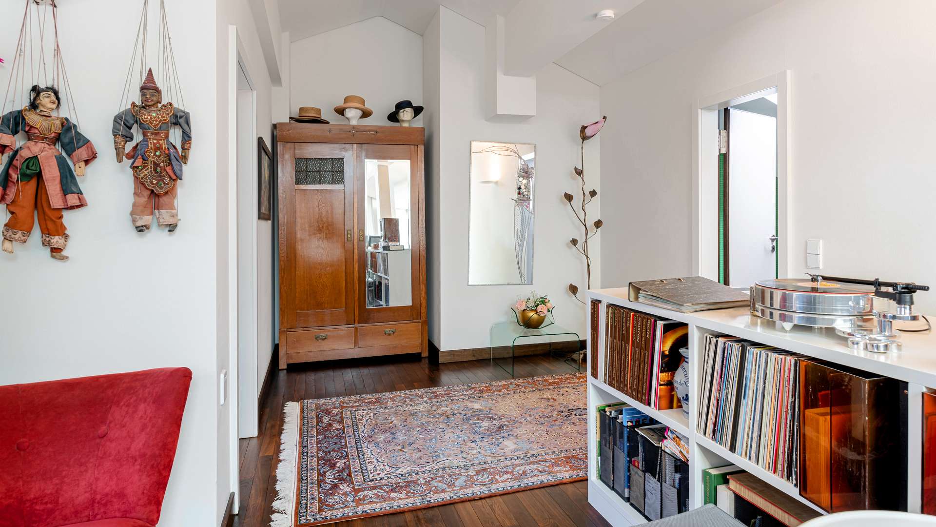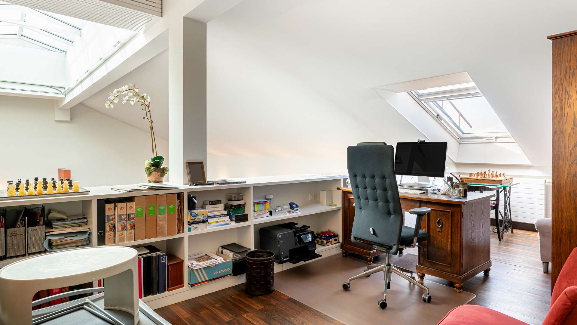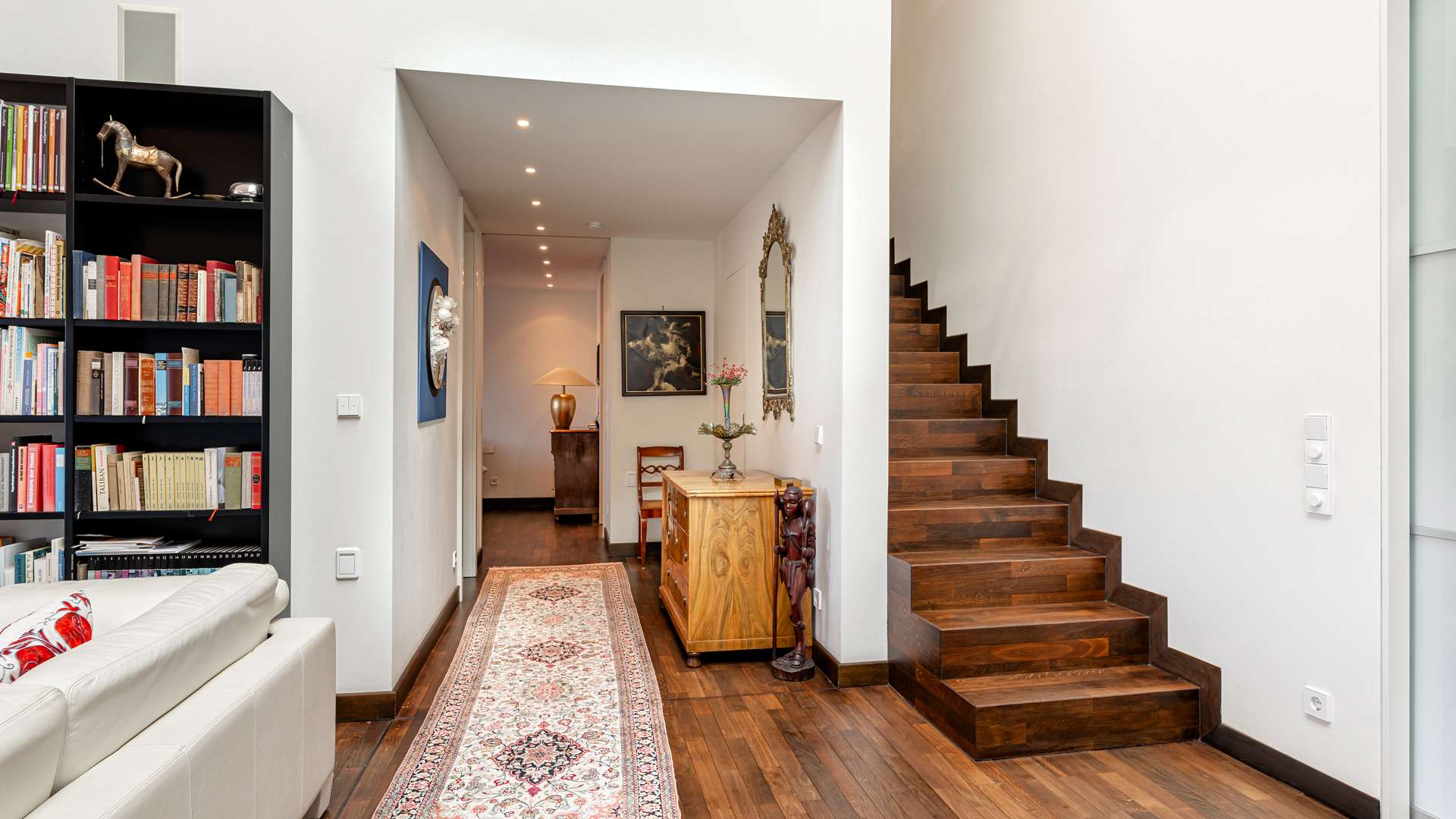 Bereits beim Betreten der Wohnung empfängt Sie ein privater Eingangsbereich mit kleinem Vorgarten – ein seltenes Privileg in einem Penthouse. Der einladende Flur lässt sich durch hochwertige Schiebetüren flexibel öffnen oder schließen. Im Mittelpunkt steht der ca. 90m² große Wohn- und Essbereich, geprägt von beeindruckender Architektur, einem großen elektrischen Lichtschacht und bodentiefen Fenstern, die den ganzen Tag über für natürliche Helligkeit sorgen. Eine stilvolle Kaminecke lädt in der kühlen Jahreszeit zum Verweilen ein. Die angrenzende Dachterrasse mit ca. 56m² in Westausrichtung bietet einen herrlichen Rückzugsort im Freien. Die offene Küche ist mit einer edlen Steinplatte, hochwertigen Geräten und integrierter Revox-Soundanlage ausgestattet. Der private Masterbereich überzeugt mit Schlafzimmer, Ankleide, Bad und einem eigenen Wintergarten. Im Obergeschoss befinden sich eine luftige Galerie, ein weiteres großzügiges Zimmer mit Bad sowie ein Abstellraum. Ein separater Hauswirtschaftsraum mit Anschlüssen für Waschmaschine und Trockner ist ebenfalls vorhanden.
