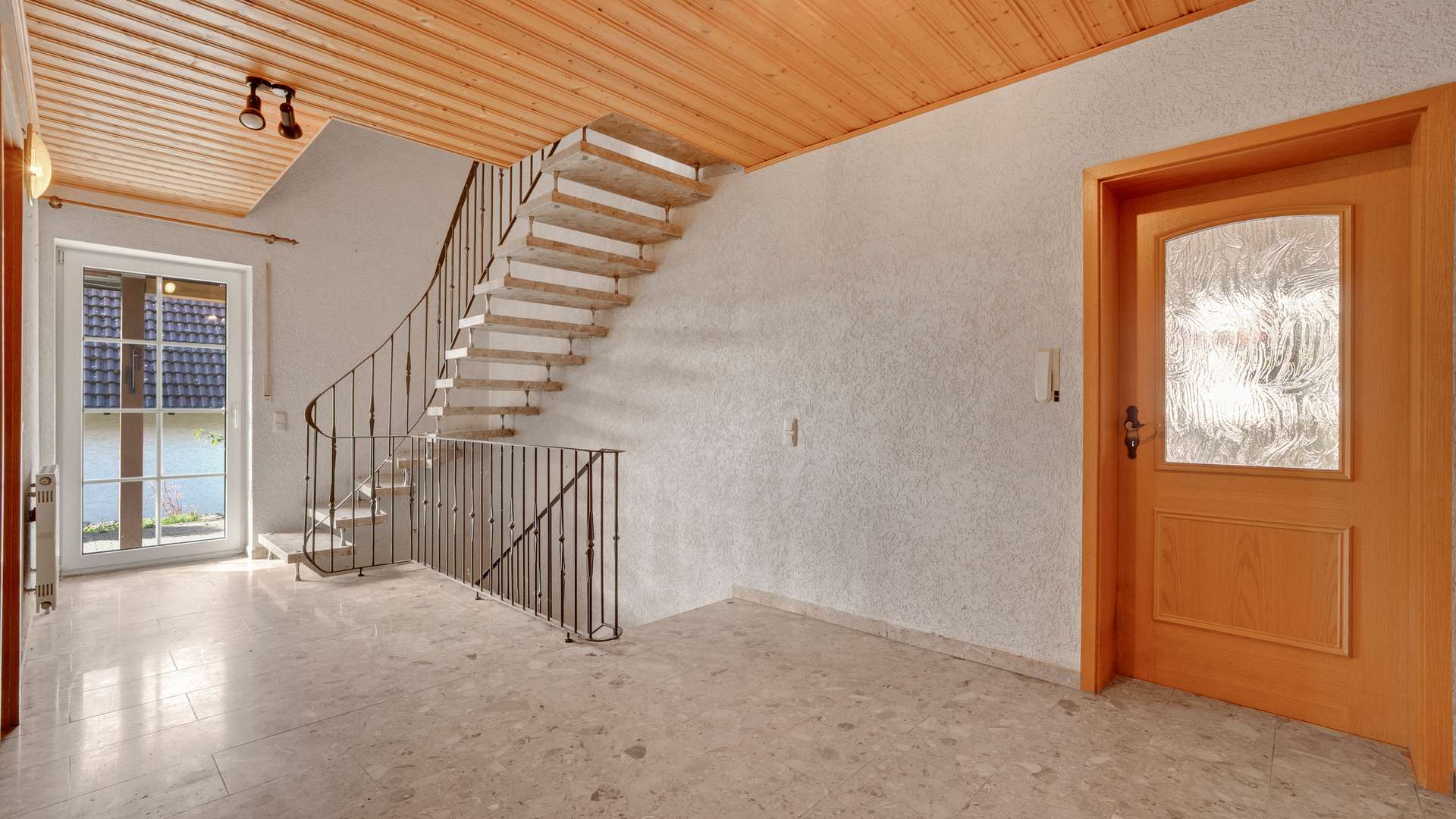 Im Inneren erwarten Sie helle, großzügige Räume mit liebevollen Details. Im Erdgeschoss empfängt Sie ein freundlicher Windfang mit Gäste-WC und ein offener Dielenbereich mit Marmortreppe und Zugang zur sonnigen Terrasse. Die Küche ist funktional ausgestattet mit Markengeräten und Holzverschlägen. Ein Arbeitszimmer mit hochwertigem Fliesenboden und handgefertigter Holzdecke sowie das lichtdurchflutete Wohn- und Esszimmer mit verglastem Erker, Parkettboden und gemütlichem Kachelofen schaffen eine behagliche Atmosphäre. Die über 40m² große Südwest-Terrasse ist teilweise überdacht, mit drei Markisen ausgestattet und bietet einen herrlichen Blick ins Grüne. Im Obergeschoss befinden sich zwei helle Kinderzimmer, ein Schlafzimmer mit eigenem Balkon und Korkboden sowie ein modernes Bad mit Fußbodenheizung, Dusche, Badewanne und großem Fenster. Der großzügige Kniestock ermöglicht optimale Raumnutzung. Im beheizten Keller finden Sie neben dem Hauswirtschaftsraum mit Gartenzugang auch mehrere Abstellräume, ein weiteres Badezimmer sowie einen Raum mit integriertem Kamineinsatz.