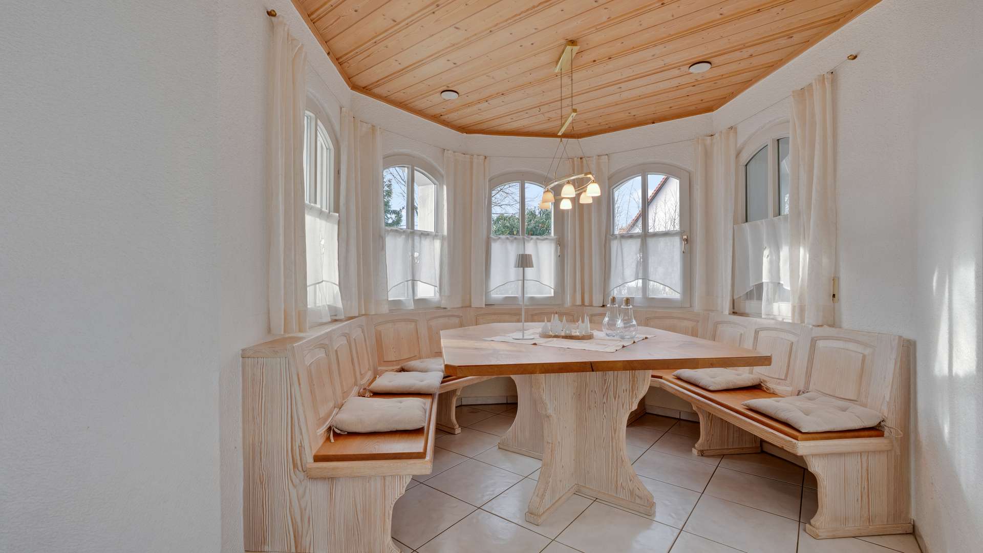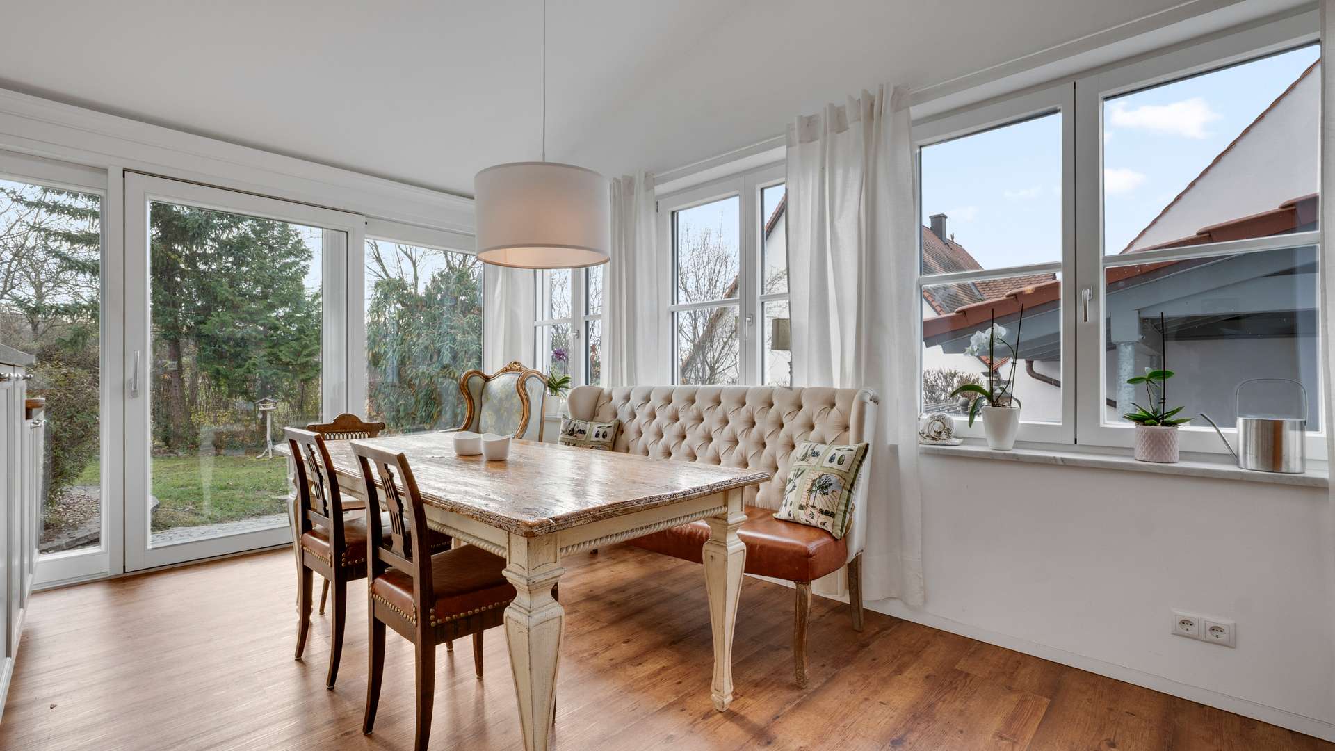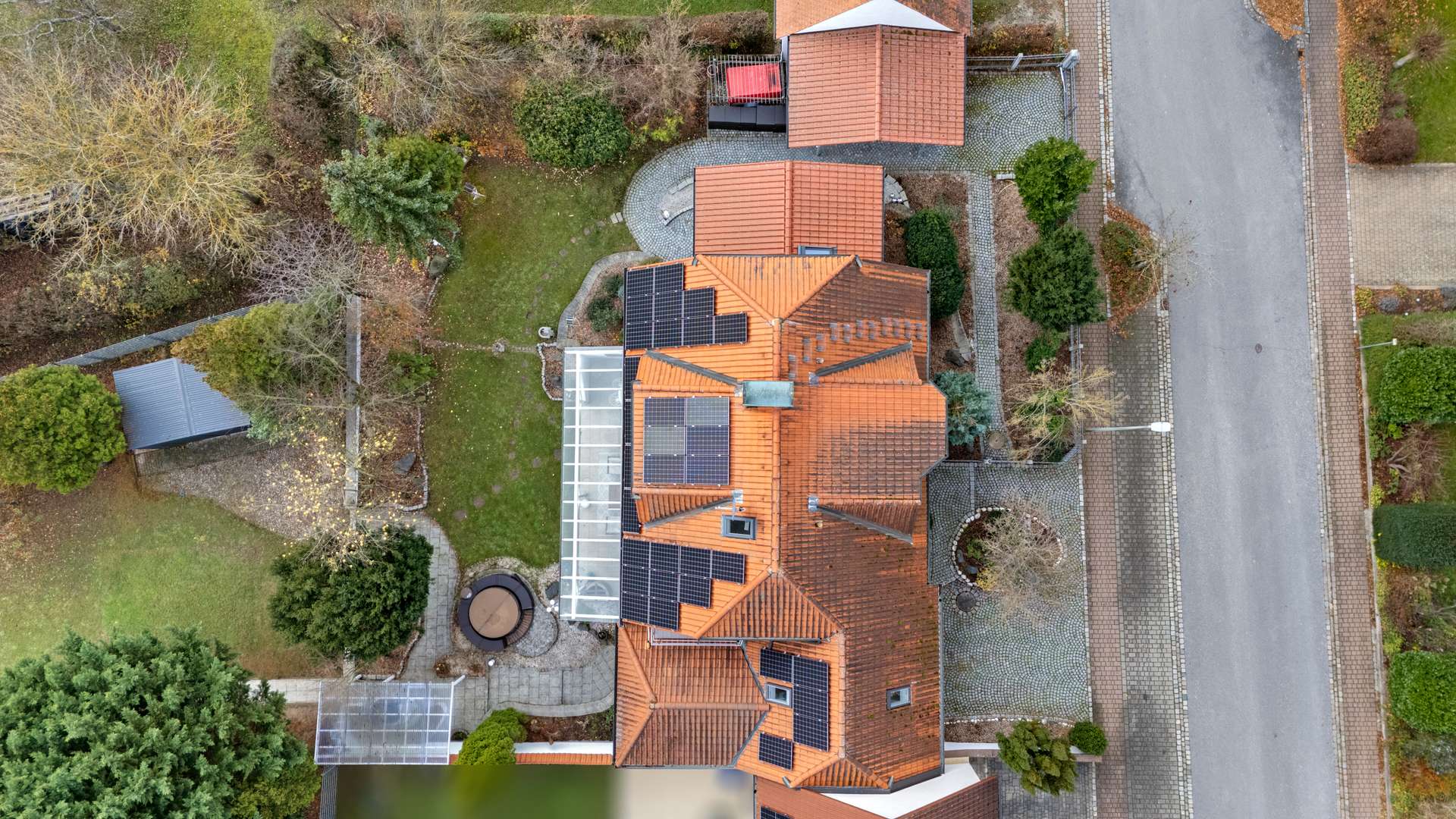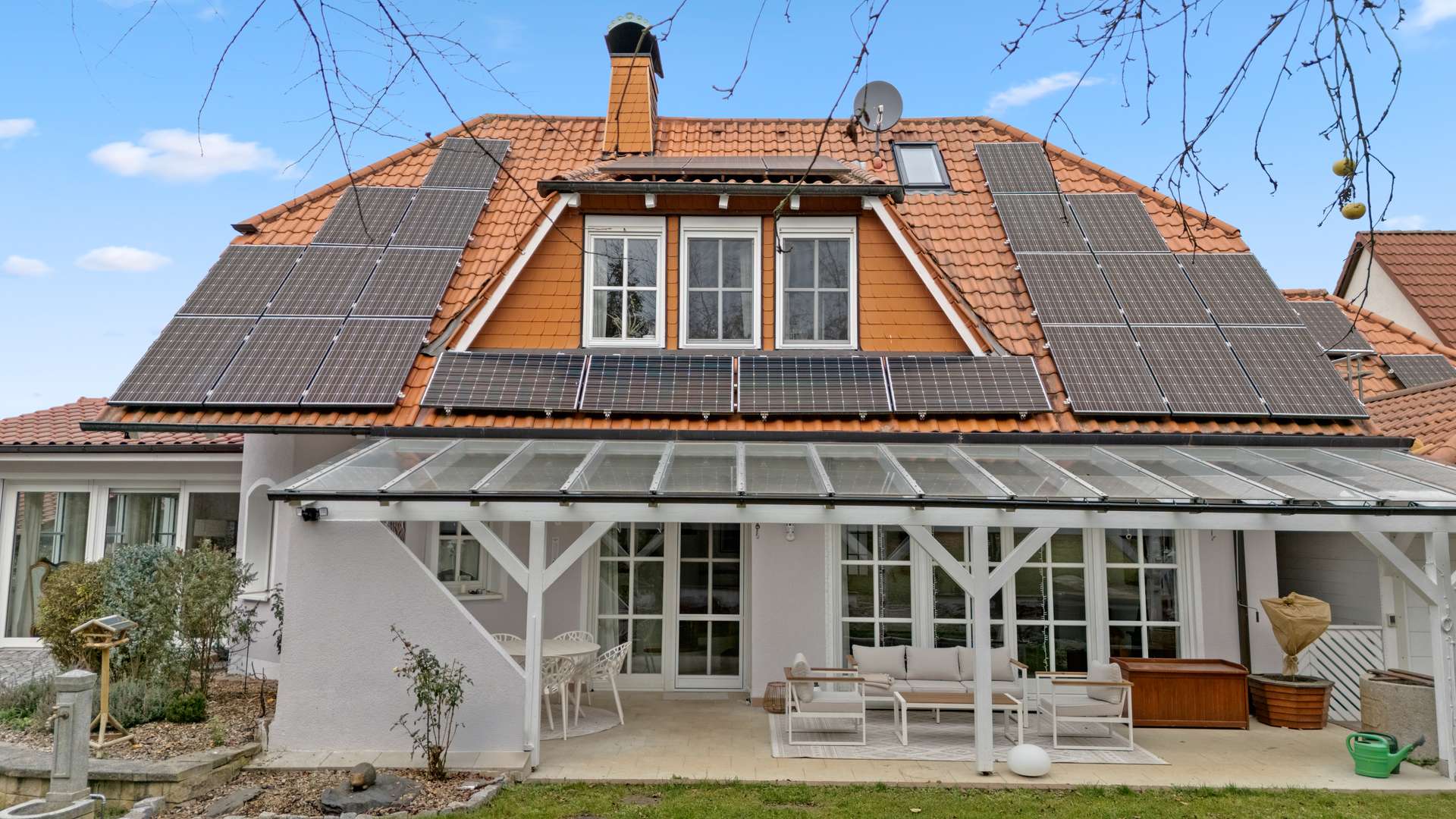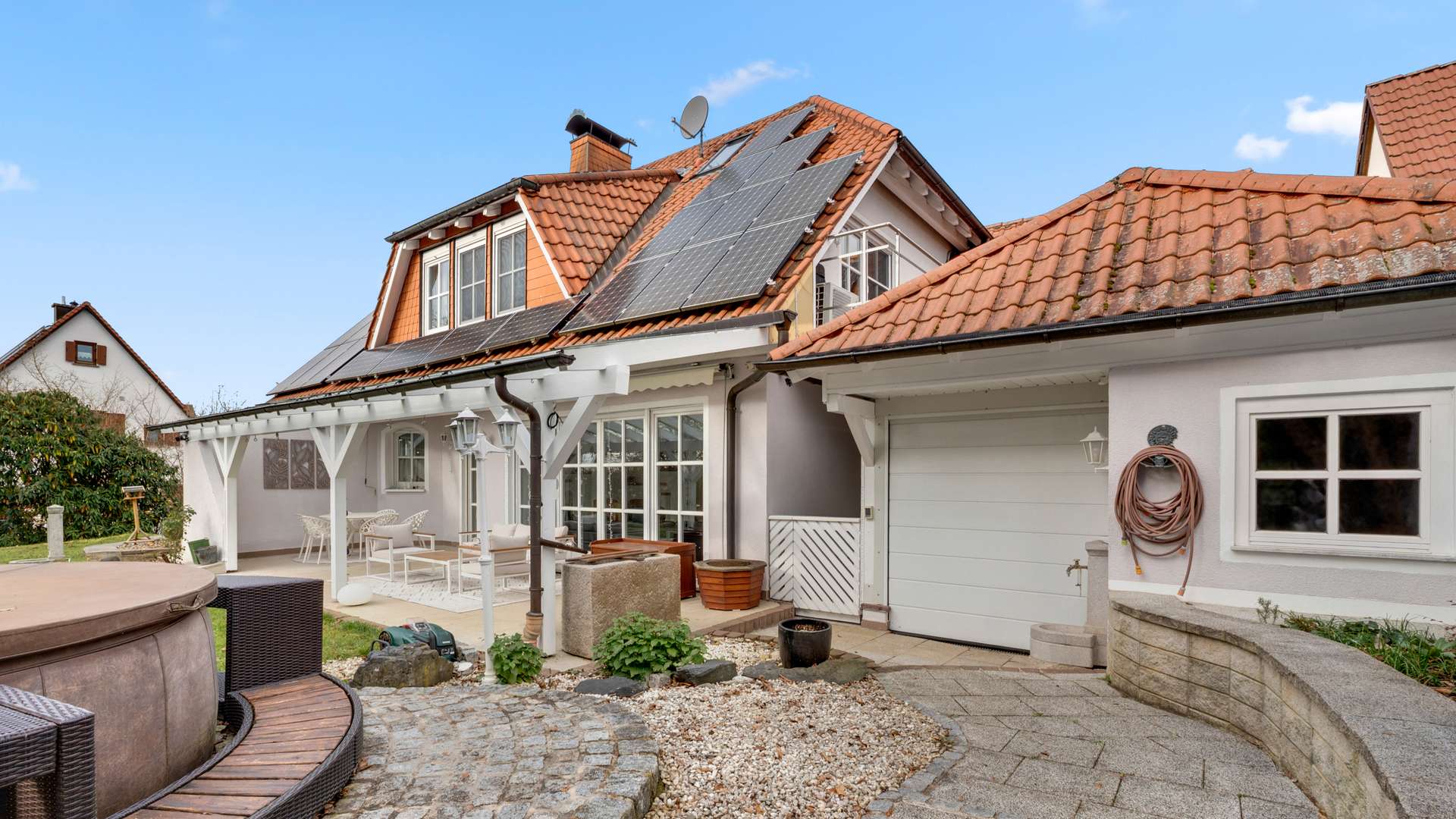 Die solide Bauweise umfasst Hochlochziegelwände (36,5cm), Stahlbetondecken sowie eine Drainage am Pachtgrundstück. Der Anbau entstand in energieeffizienter Holzständerbauweise nach KfW-Standard. Die Erdwärmepumpe mit sechs 70m tiefen Erdsonden sorgt gemeinsam mit einem Kamin mit Wassertaschen und Warmwasserspeicher für nachhaltige Heizleistung. Im EG gibt es Fußbodenheizung mit Raumthermostaten, im OG Heizkörper mit Einzelraumregelung. Die Fenster bestehen aus hochwertigem Merantiholz mit Doppelverglasung und elektrischen Rollläden, im Anbau aus 3-fach-verglastem Kunststoff mit Raffstores. Eine PV-Anlage (9,24kWp, Baujahr 2016) mit Überschusseinspeisung und Eigenverbrauch senkt die laufenden Kosten. Die Immobilie wurde laufend gepflegt und modernisiert – u. a. Erdwärmeheizung (2015), PV-Anlage (2016), Anbau (2016), Terrasse mit Markise (2025), Fassadenanstrich (2025) und neues Balkongeländer (2024).