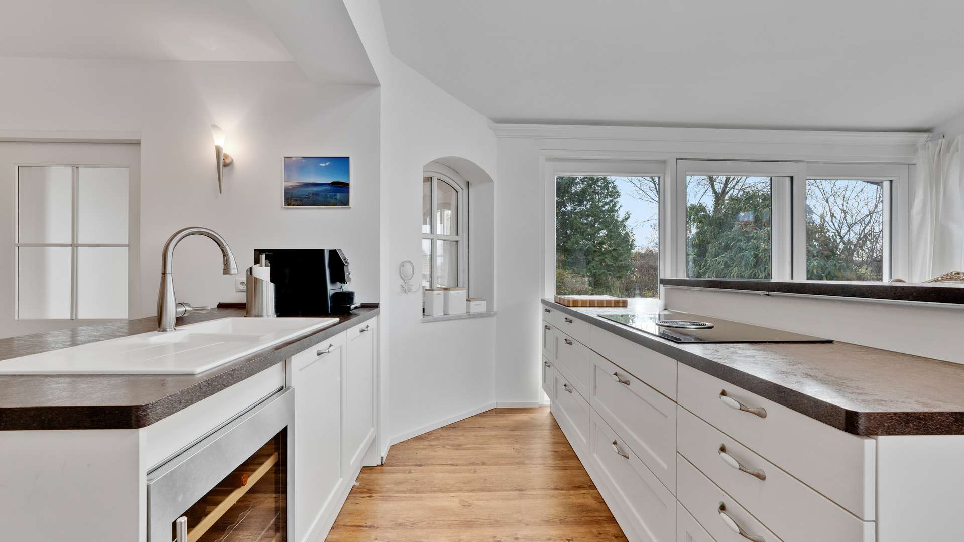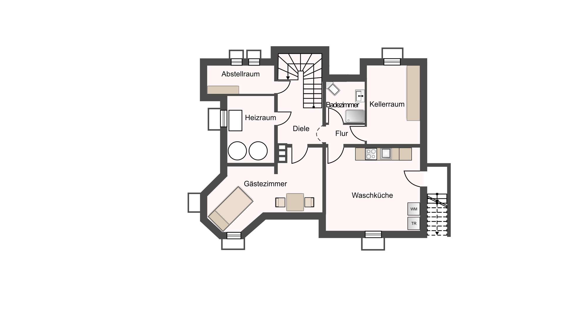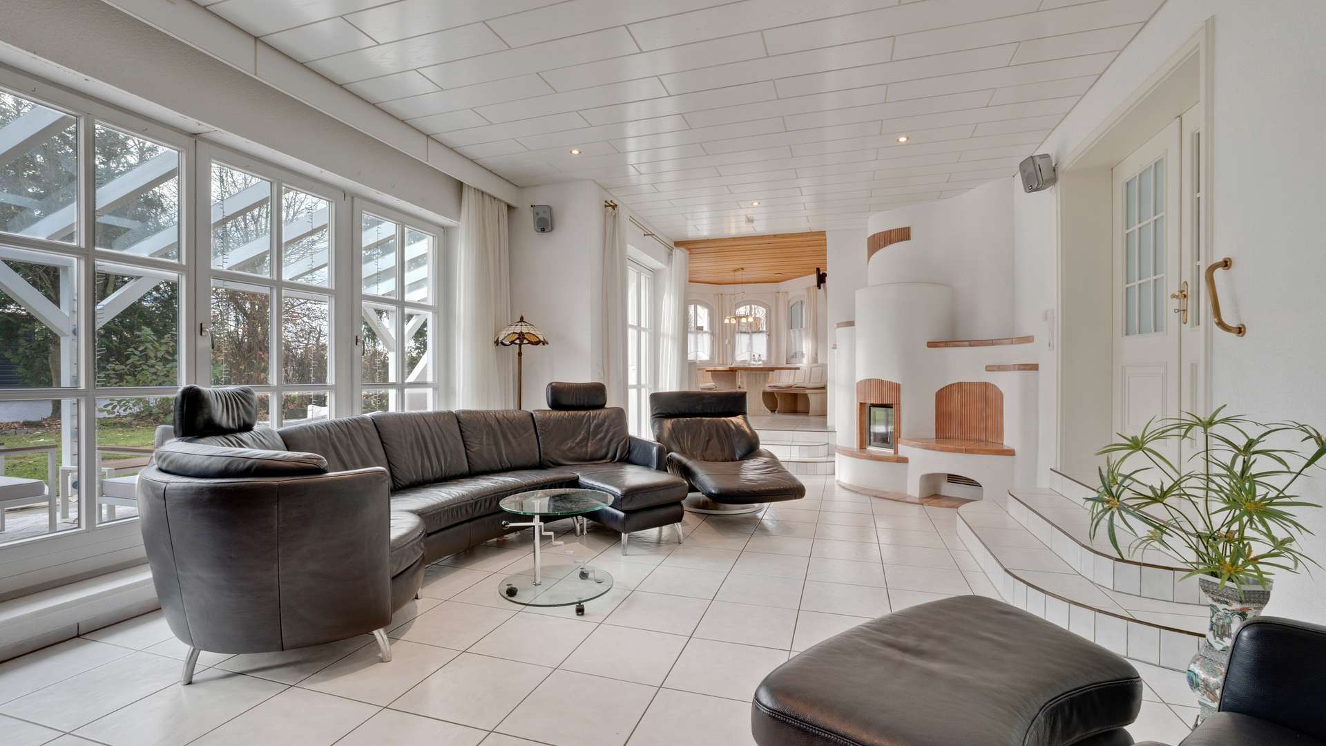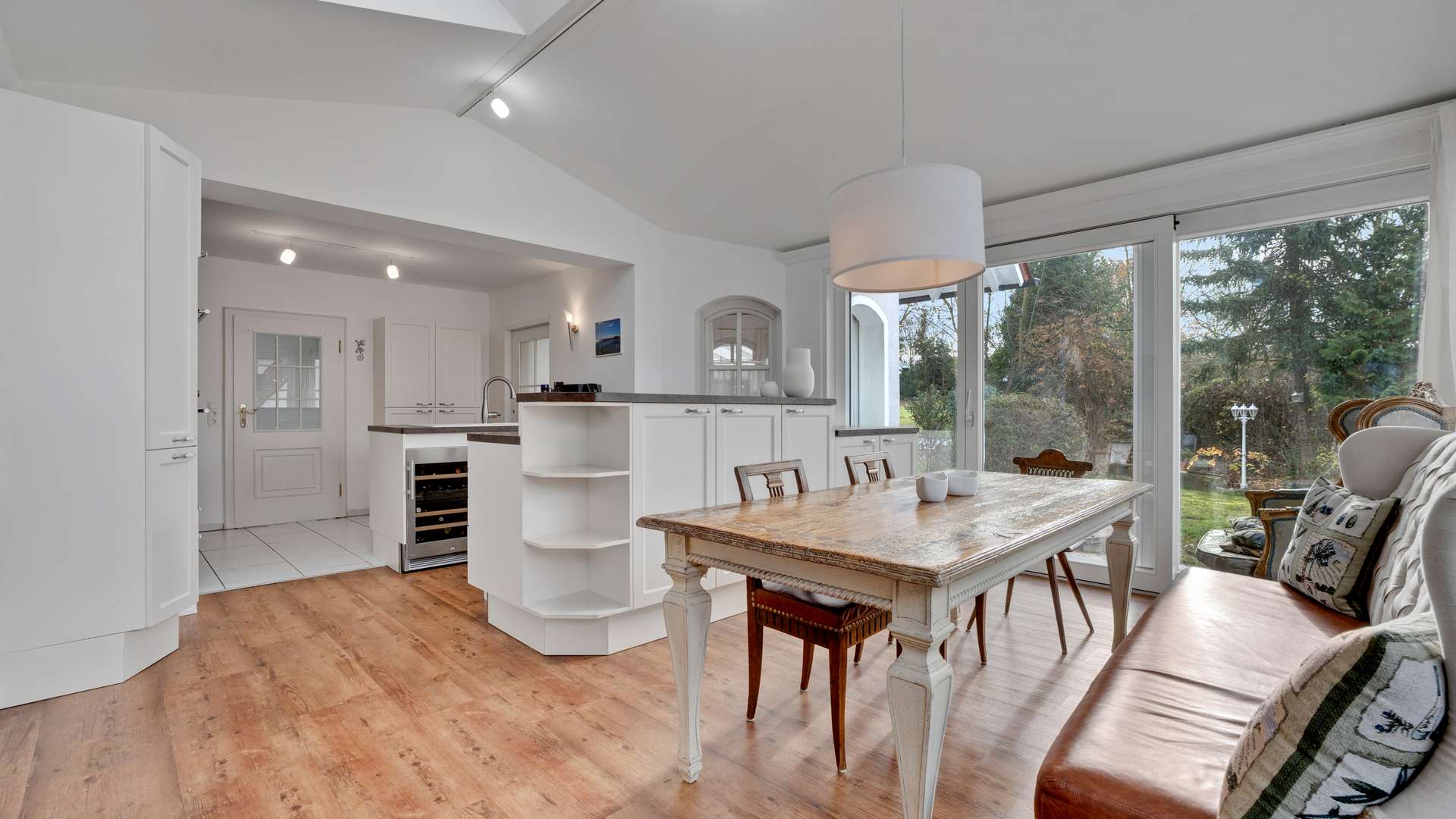Innen überzeugt das Haus mit Großzügigkeit, Licht und hochwertiger Ausstattung. Der Eingangsbereich bietet eine helle Diele mit großem Fenster, Doppelflügeltüren und offenem Treppenaufgang. Das EG beeindruckt mit offenem, lichtdurchflutetem Wohnbereich – bodentiefe Fenster, großer Kamin und Zugang zur überdachten Terrasse schaffen Atmosphäre. Das Esszimmer mit Erker und großer Fensterfront lädt zu gemütlichen Stunden ein. Die moderne Einbauküche mit Kochinsel, hochwertigen Geräten und Gartenzugang kann für 17.000€ übernommen werden. Ebenfalls im EG: Gäste-WC mit goldfarbenen Armaturen, Arbeitszimmer mit Zugang zur gefliesten Doppelgarage mit Werkstatt und Geräteraum. Im OG befinden sich zwei helle Kinderzimmer, eines mit Zugang zum teilausgebauten Dachboden. Das stilvolle Bad bietet Eckbadewanne, bodengleiche Dusche, WC und Waschbecken. Zudem gibt es ein großes Schlafzimmer mit Balkon, ein weiteres Arbeitszimmer und eine separate Ankleide. Im DG liegt ein weiteres Kinderzimmer mit großem Dachfenster sowie ein Abstellraum. Der Gästebereich im KG umfasst Schlafzimmer, Bad mit Dampfdusche, Waschbecken und WC, Waschküche mit Küche, Technikraum und Stauraum – ideal auch als Hobby- oder Arbeitsbereich.