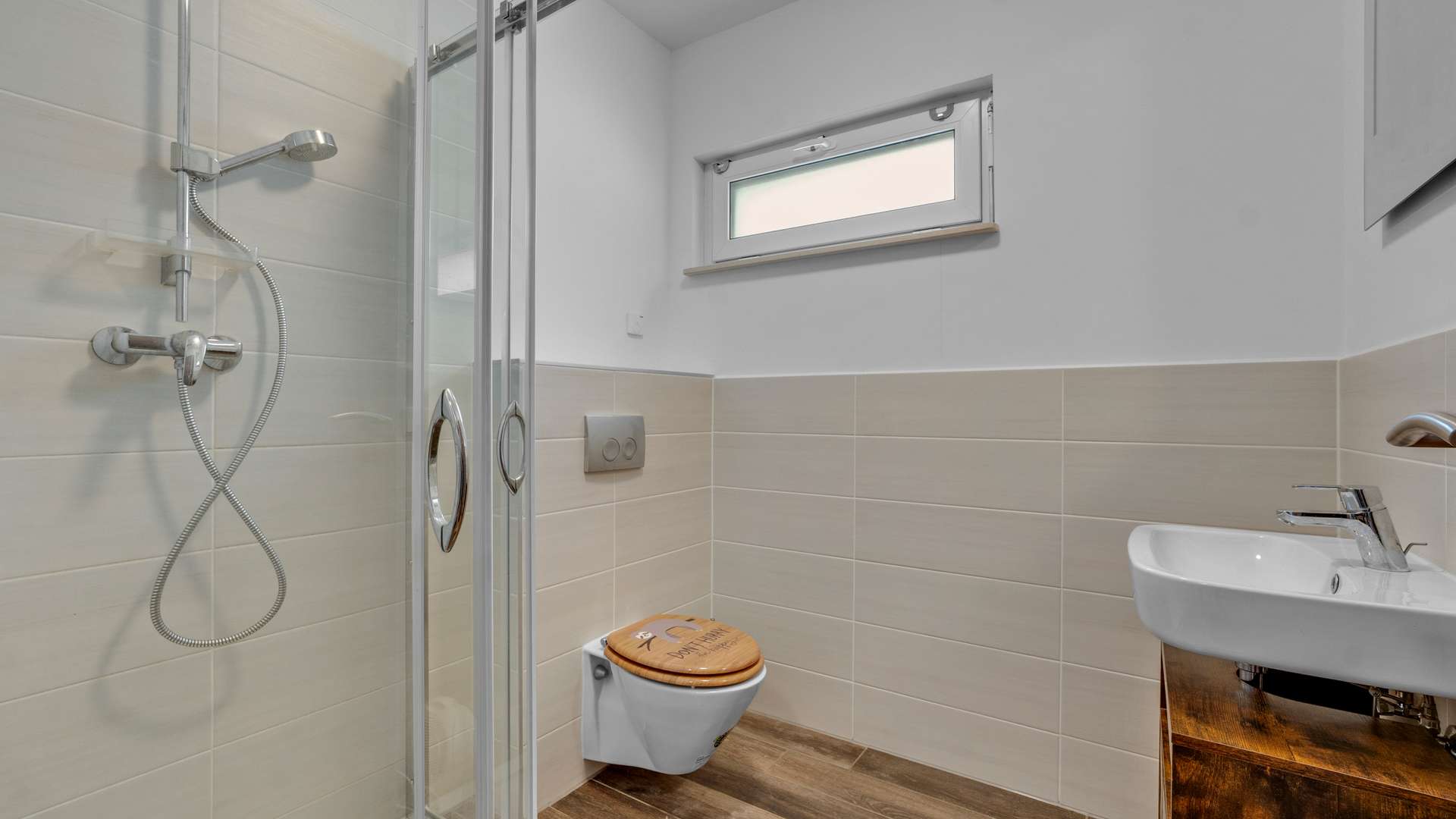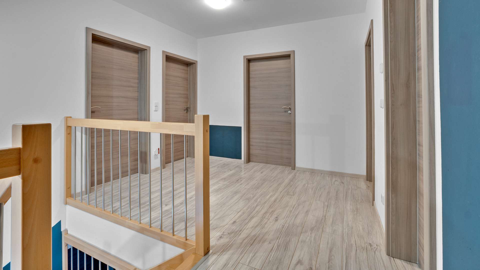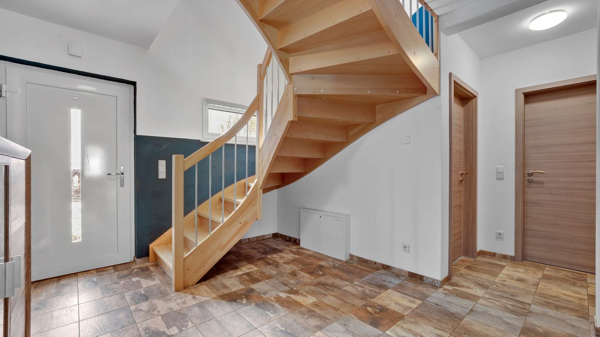 Das Erdgeschoss bietet mit einer Deckenhöhe von 2,51m einen hellen, offenen Wohnbereich. Die großzügige Diele mit gefliestem Boden und offener Holztreppe führt in ein Tageslichtbad mit Dusche, ein separates Arbeitszimmer mit bodentiefen Fenstern und Gartenzugang sowie in den großzügigen Wohn-/Essbereich mit Schwedenofen und traumhafter Aussicht in den Garten. Die angrenzende Küche ist offen gestaltet und durch eine praktische Speisekammer mit Fenster ergänzt. Der Technikraum dient auch als Hauswirtschaftsraum mit Stellplatz für Waschmaschine und Trockner. Im Obergeschoss befinden sich drei helle Schlafzimmer – zwei Kinderzimmer und ein Elternschlafzimmer – sowie ein flexibel nutzbares Gästezimmer. Die zentrale Diele verbindet die Räume effizient. Das große Familienbad überzeugt mit bodengleicher Dusche, Eckbadewanne, Handtuchheizkörper und stilvoller Ausstattung. Auch im Obergeschoss sorgen die großen Fenster für viel Licht und ein angenehmes Raumgefühl.
