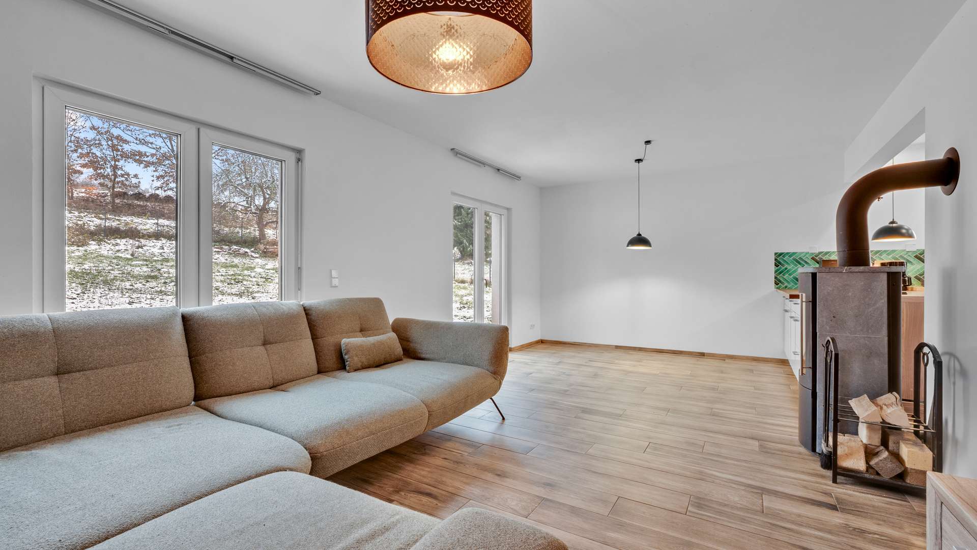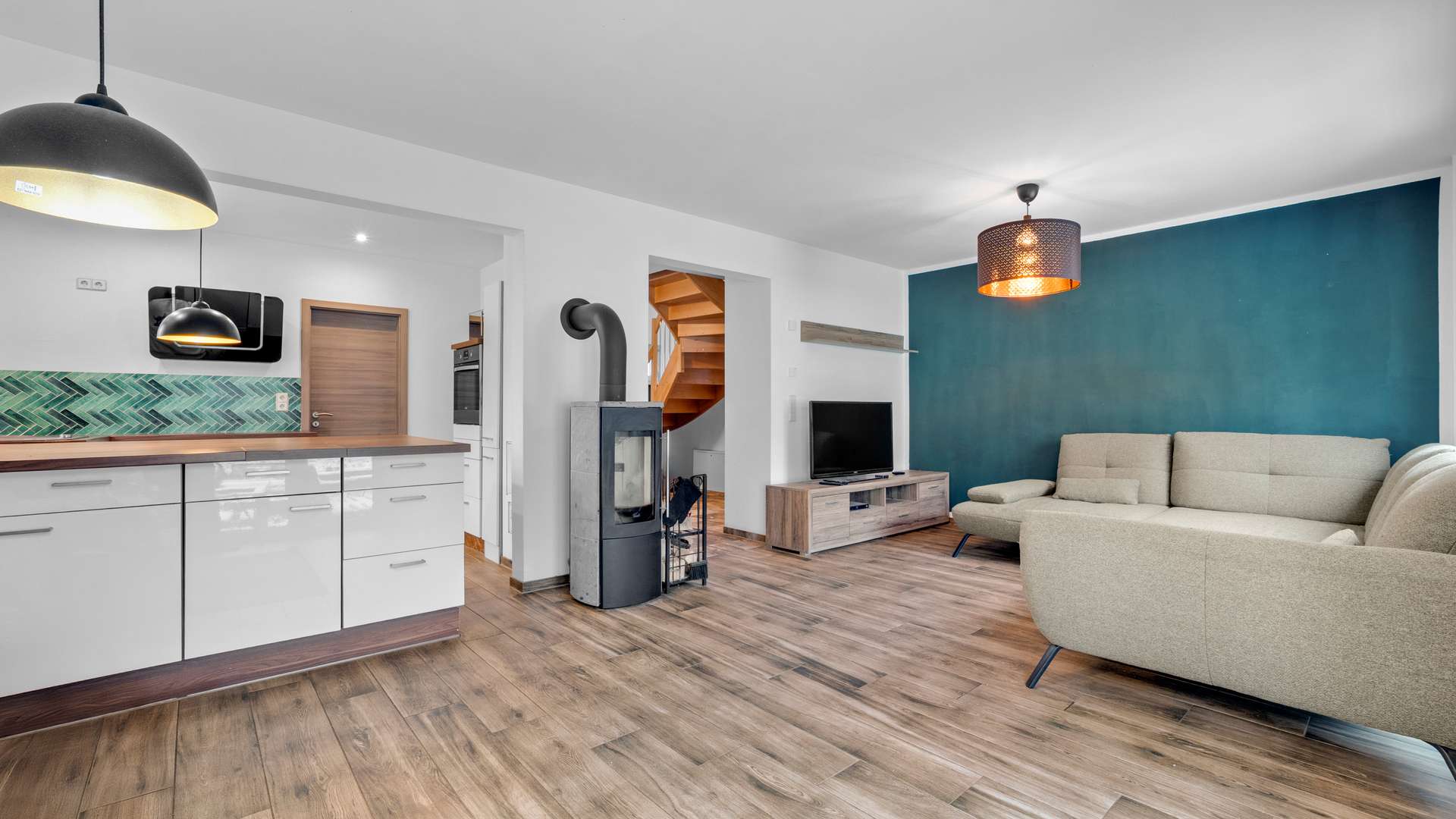 - Offener Wohn-/Essbereich mit Ofen und Gartenzugang