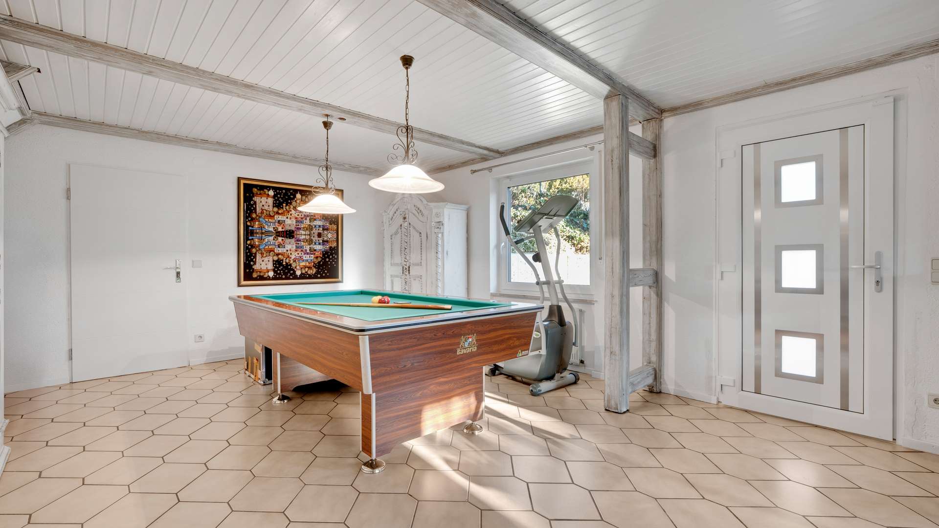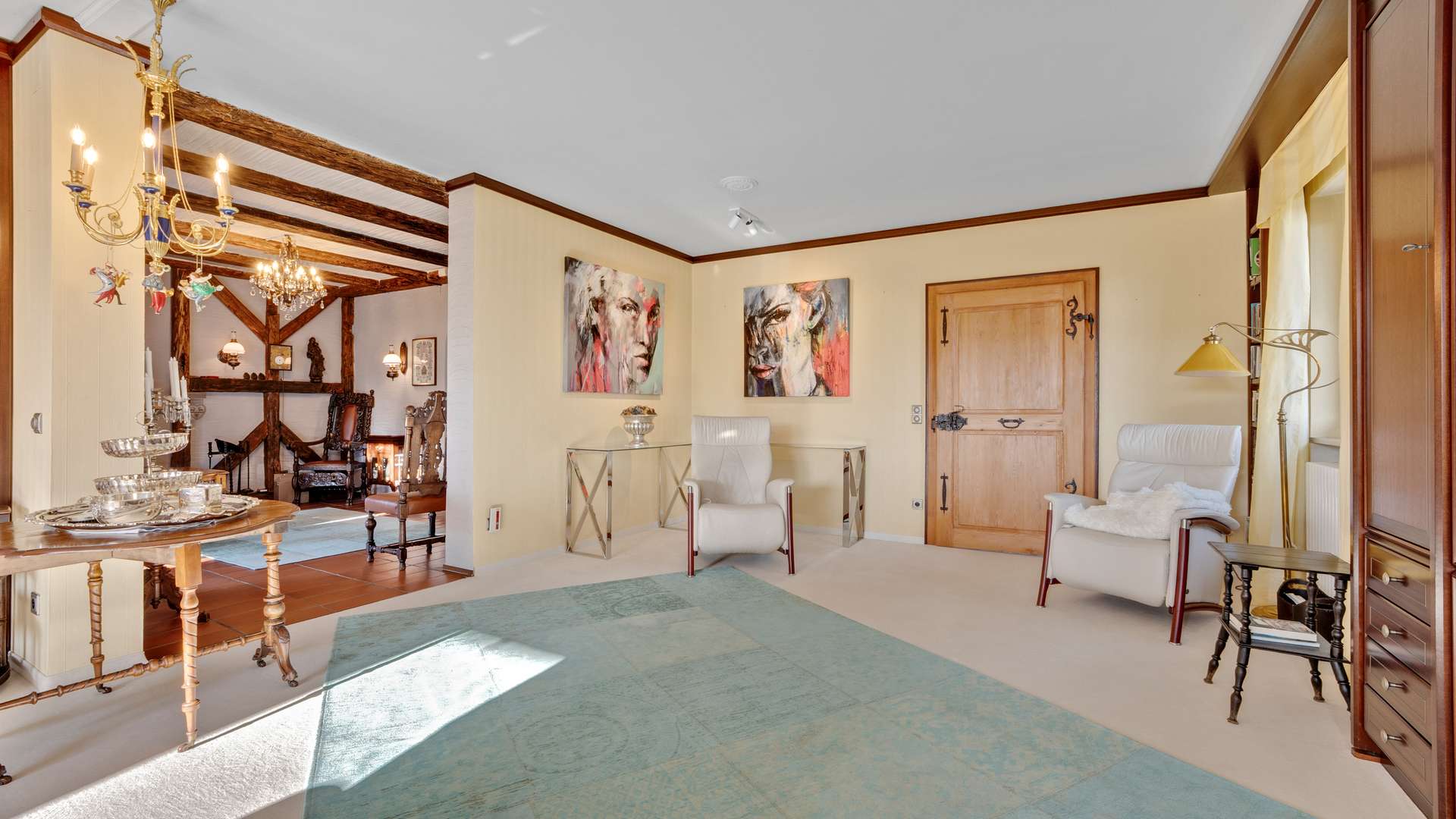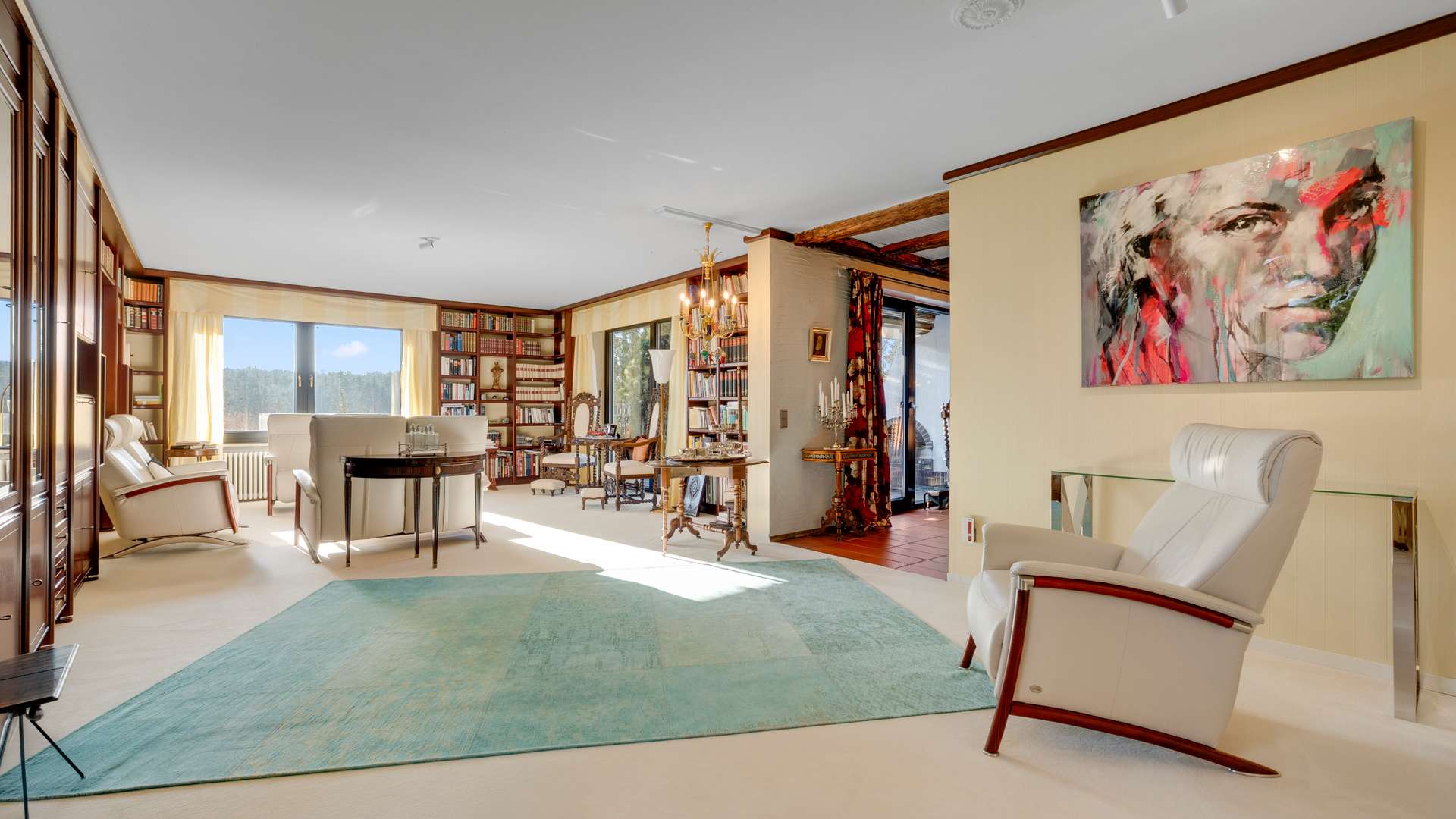 Im Erdgeschoss empfängt eine großzügige Diele mit offener Holztreppe mit eindrucksvollem Geländer. Das ca. 49m² große Wohnzimmer beeindruckt mit Helligkeit, Weitläufigkeit und traumhafter Aussicht. Das angrenzende Kaminzimmer mit Zugang zur ca. 53m² großen Terrasse lädt zum Verweilen ein. Der Essbereich und die moderne Küche mit Siemens-Geräten bieten beste Voraussetzungen für kulinarische Stunden. Ein Gästezimmer und ein hochwertiges Badezimmer mit Dusche, Whirlpoolwanne und Bidet komplettieren das Erdgeschoss. Im Dachgeschoss erwarten Sie ein großzügiges Schlafzimmer mit sichtbaren Holzbalken, zwei Kinderzimmer, ein kompaktes Badezimmer mit Dusche sowie ein zentraler Dielenbereich. Das Untergeschoss überzeugt mit einem Hobbyraum inklusive separatem Außenzugang, einem Arbeitszimmer, einem Weinkeller, einer Waschküche und weiterem Stauraum – alles hell, gepflegt und wohnlich ausgestattet. Die Raumhöhen zwischen 2,37m und 2,56m sorgen in allen Bereichen für ein angenehmes Wohngefühl.