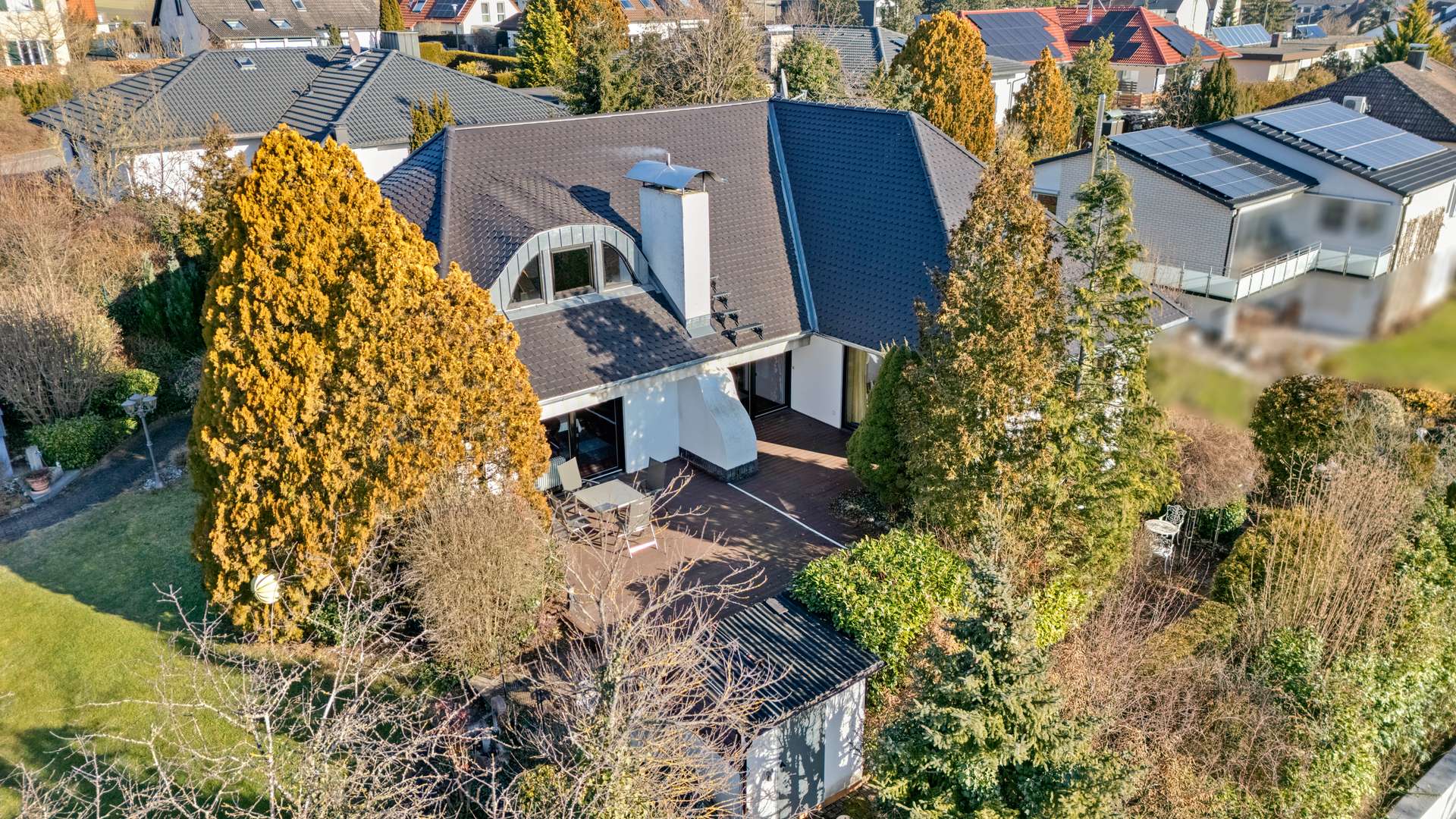 Diese außergewöhnliche Villa vereint stilvolles Wohnen, höchste Privatsphäre und eine traumhafte Lage direkt am Wald – ein Zuhause für alle, die das Besondere suchen. Auf drei Etagen und über 308m² Wohnfläche bietet sie Raum zur Entfaltung, zur Erholung und für generationsübergreifendes Leben. Sofort bezugsfertig und in exzellent gepflegtem Zustand präsentiert sich die Immobilie mit weitläufiger Sonnenterrasse, liebevoll gestaltetem Garten und hochwertiger Ausstattung. Absolute Idylle in ruhiger, familiärer Umgebung trifft hier auf hervorragende Anbindung – ein seltenes Juwel. In den letzten Jahren wurden über 250.000€ in Modernisierungen investiert – ein klares Zeichen für Qualität, Komfort und Werterhalt.