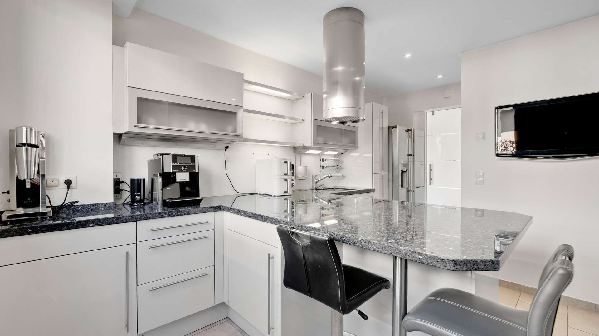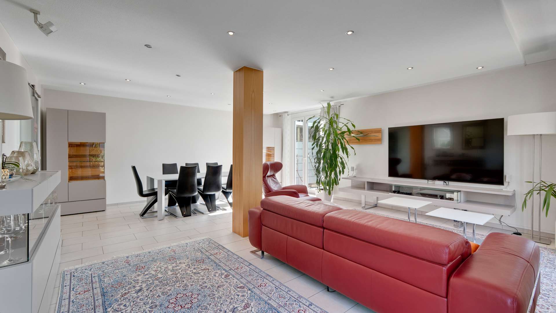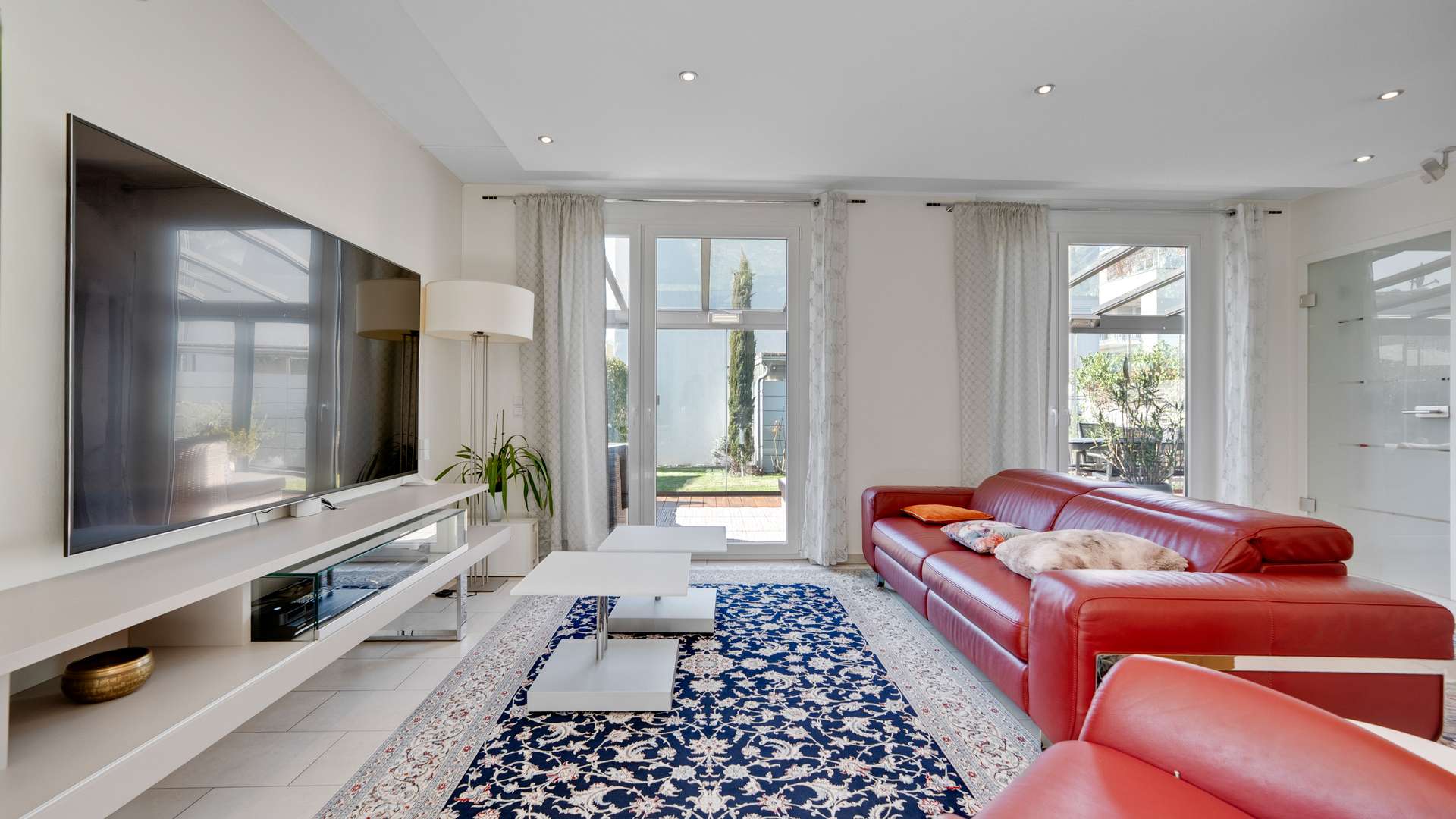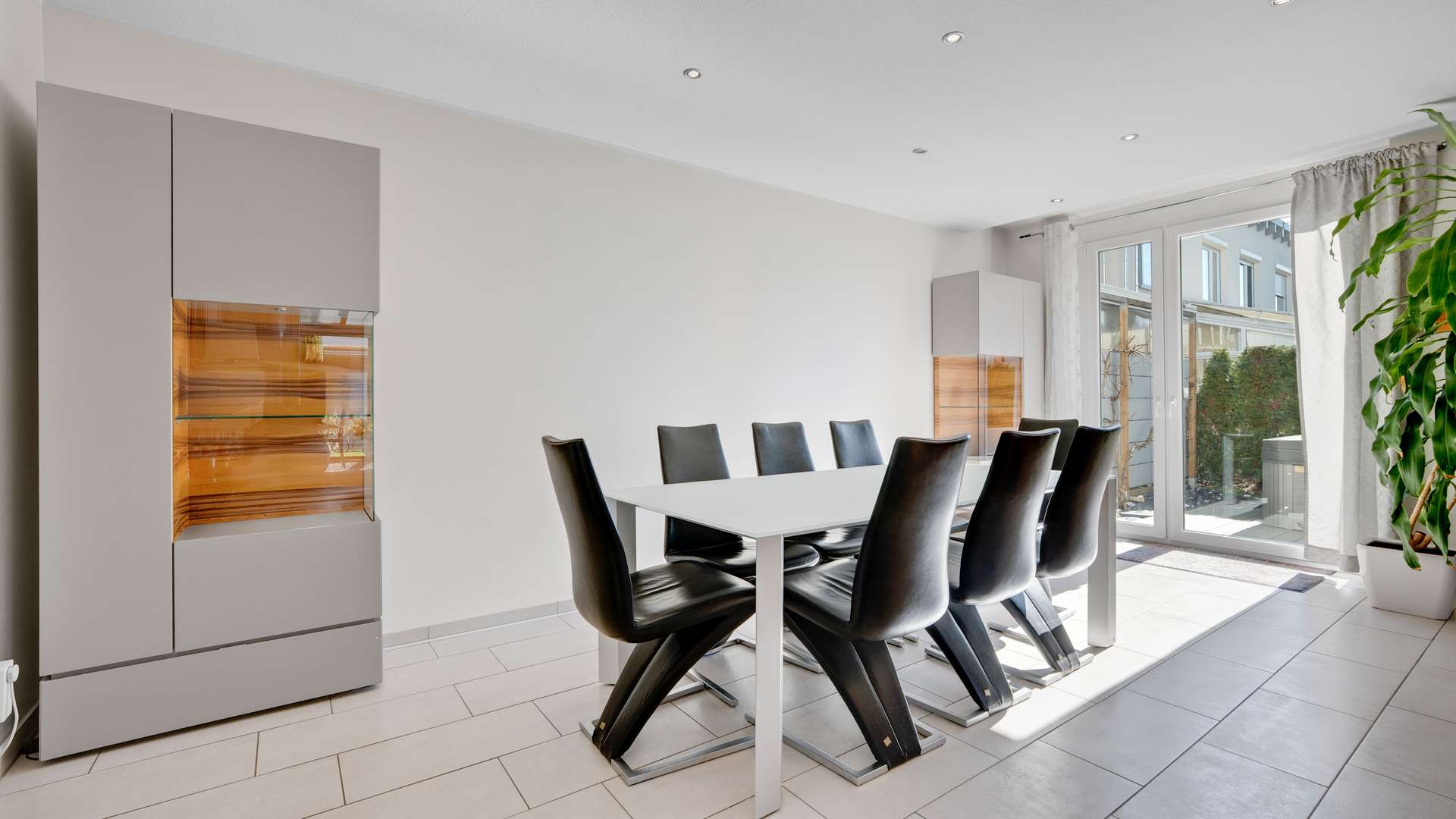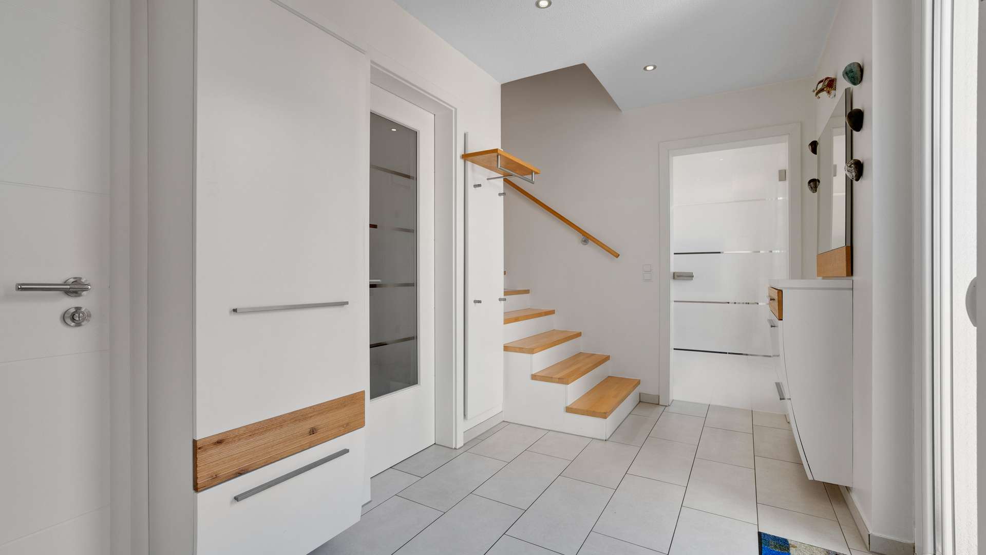 Im Inneren erwartet Sie eine moderne Raumgestaltung. Das Erdgeschoss beeindruckt mit einer edlen Diele, einem WC, einer hochwertigen Küche mit Kochinsel und Granit-Arbeitsplatte sowie dem lichtdurchfluteten Wohn- und Essbereich mit idealer Aufteilung. Die offene Grundrissgestaltung verbindet diese Bereiche mit dem gemütlichen Wintergarten und der Terrasse. Im Obergeschoss überzeugt die familiäre Aufteilung mit einem großzügigen Badezimmer mit Dusche und Badewanne, einem Arbeitszimmer, einem Kinderzimmer sowie einem großen Schlafzimmer mit eigener Ankleide. Klare Linien, hochwertige Böden und raffinierte Details wie LED-Deckenspots und Einbauschränke prägen die Wohnqualität. Das Kellergeschoss rundet das Angebot ab mit dem Wellnessbereich inklusive Sauna und Dusche und einem großzügigen Hobbyraum mit Abstellraum.