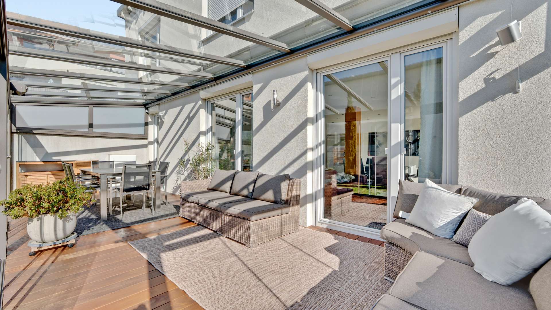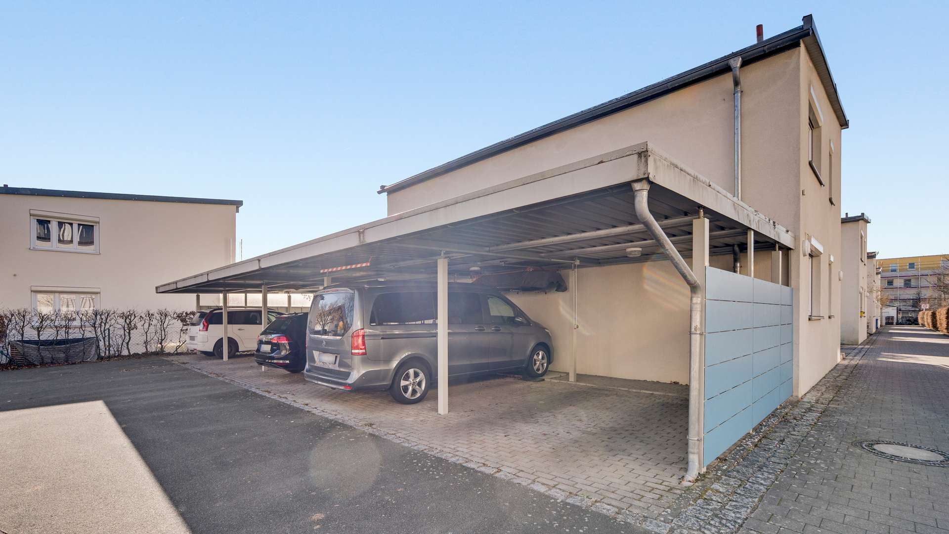 Das 2009 erbaute Haus besticht mit 165,90m² Wohnfläche, verteilt auf zwei Etagen, und einem WU-Beton-Keller. Der durchdachte Grundriss umfasst eine großzügige Aufteilung im Erd- und Obergeschoss sowie zusätzliche Nutzflächen im Kellergeschoss. Das Grundstück von 293m² ist vollständig umfriedet und bietet dank eines blickdichten Kunststoffzauns absolute Privatsphäre. Im Außenbereich finden Sie eine moderne Terrasse mit hochwertigen WPC-Dielen, einem Whirlpool und elegant angelegte Zierpflanzen, immergrüne Bäume und einen gepflegten Rasen. Zwei Stellplätze im Carport (gemeinschaftlich genutzt) inkl. Vorbereitung für eine Wallbox ermöglichen zukunftssicheres Parken direkt am Haus. Ein Stellplatz ist bereits im Preis inklusive, der zweite kann für nur 30.000€ dazu erworben werden. Der 2016 angebaute Wintergarten bildet ein absolutes Highlight mit Infrarotheizung, Beleuchtung und Beschattung (steuerbar per App).