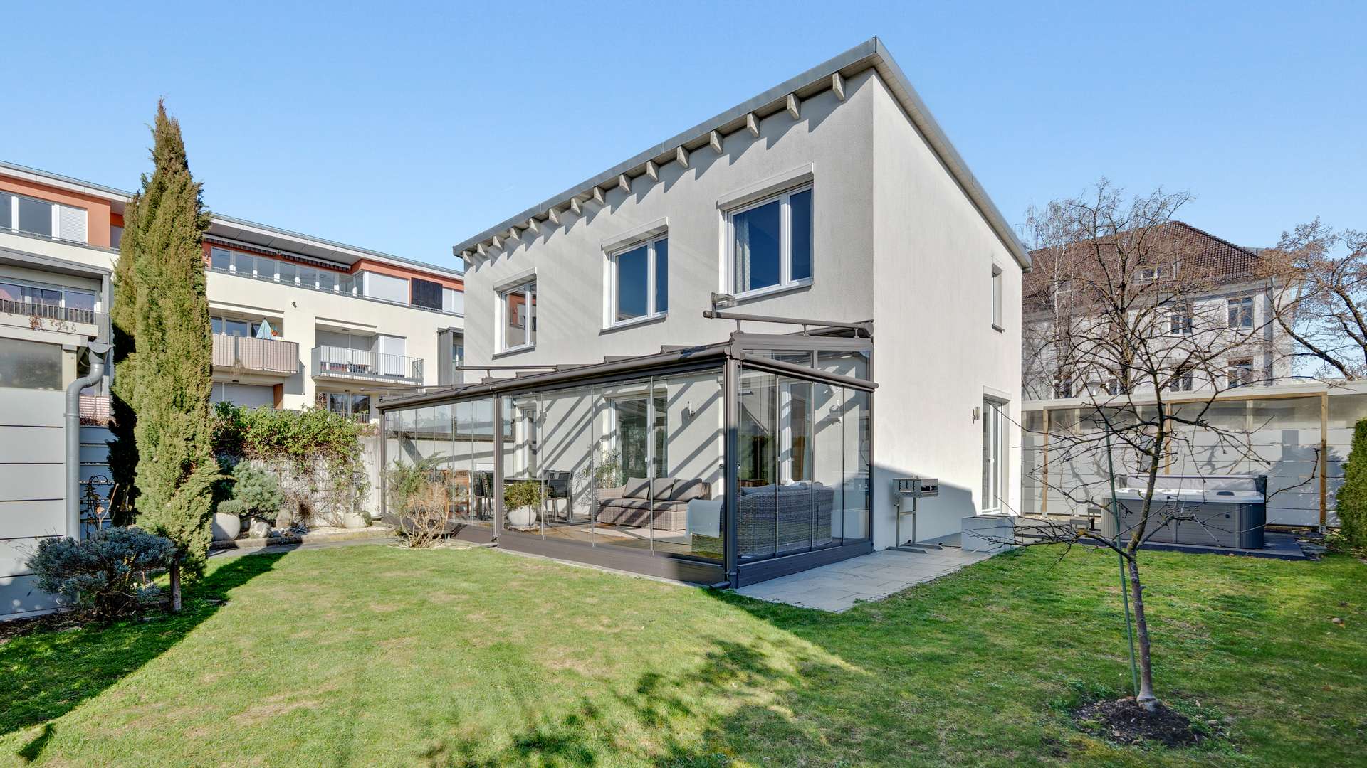 Dieses einzigartige Einfamilienhaus bietet Ihnen die perfekte Kombination aus moderner Bauweise, energieeffizienter Ausstattung und einer unschlagbaren Lage im begehrten Röthelheimpark in Erlangen. Freuen Sie sich auf ein Zuhause, das mit höchstem Wohnkomfort, Nachhaltigkeit und Qualität überzeugt. Die ideale Infrastruktur bietet kurze Wege zu Kitas, Schulen, Naherholung im angrenzenden Waldgebiet sowie dem Siemens-Campus und der A73. Dank Fußbodenheizung im gesamten Wohnbereich, elektrischen Außenrollläden und moderner Gebäudetechnik genießen Sie innovative Standards. Ein heller Wintergarten mit Outdoor-Küche, eine sonnige Terrasse mit Whirlpool und ein liebevoll gestalteter Garten laden zum Wohlfühlen ein – ein wahrer Rückzugsort ohne Neubau-Stress und direkt bezugsbereit.