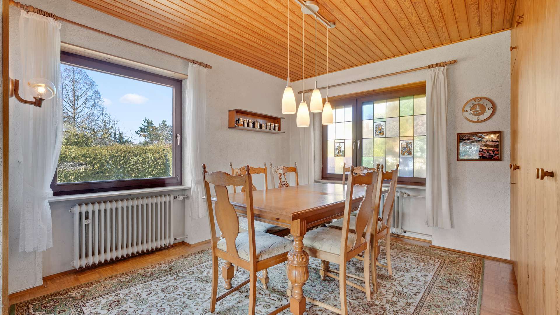 Das solide Mauerwerk aus 30cm Hochlochziegel überzeugt mit hochwertiger Bausubstanz. 1993 wurde das ursprüngliche Flachdach zu einem langlebigen Satteldach mit Tonziegeln umgebaut und mit 25cm Mineralwolldämmung auf der obersten Geschossdecke ergänzt, wodurch eine gute Energieeffizienz gewährleistet ist. Die großzügig verglasten Holzrahmenfenster, die zwischen 1989 und 1993 erneuert wurden, schaffen helle, freundliche Räume und sind mit Rollläden ausgestattet. Das Heizungssystem wurde 2004 auf eine Gas-Niedertemperaturheizung der Marke Viessmann modernisiert, während auch die Warmwasserbereitung über die zentrale Anlage erfolgt.