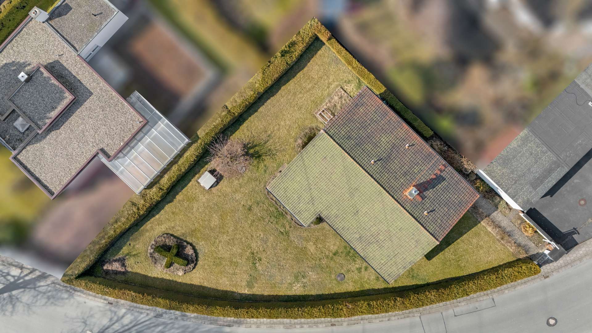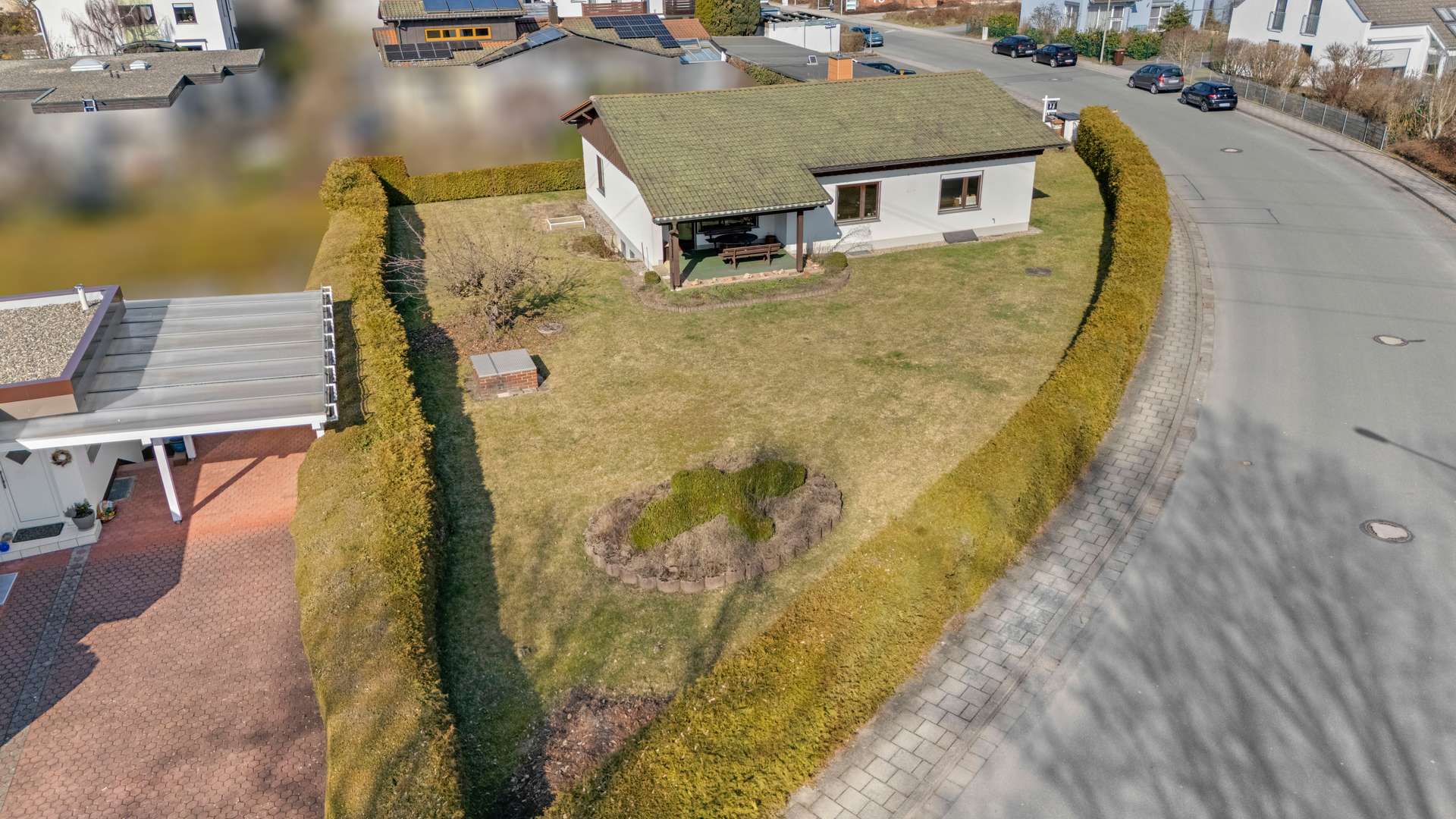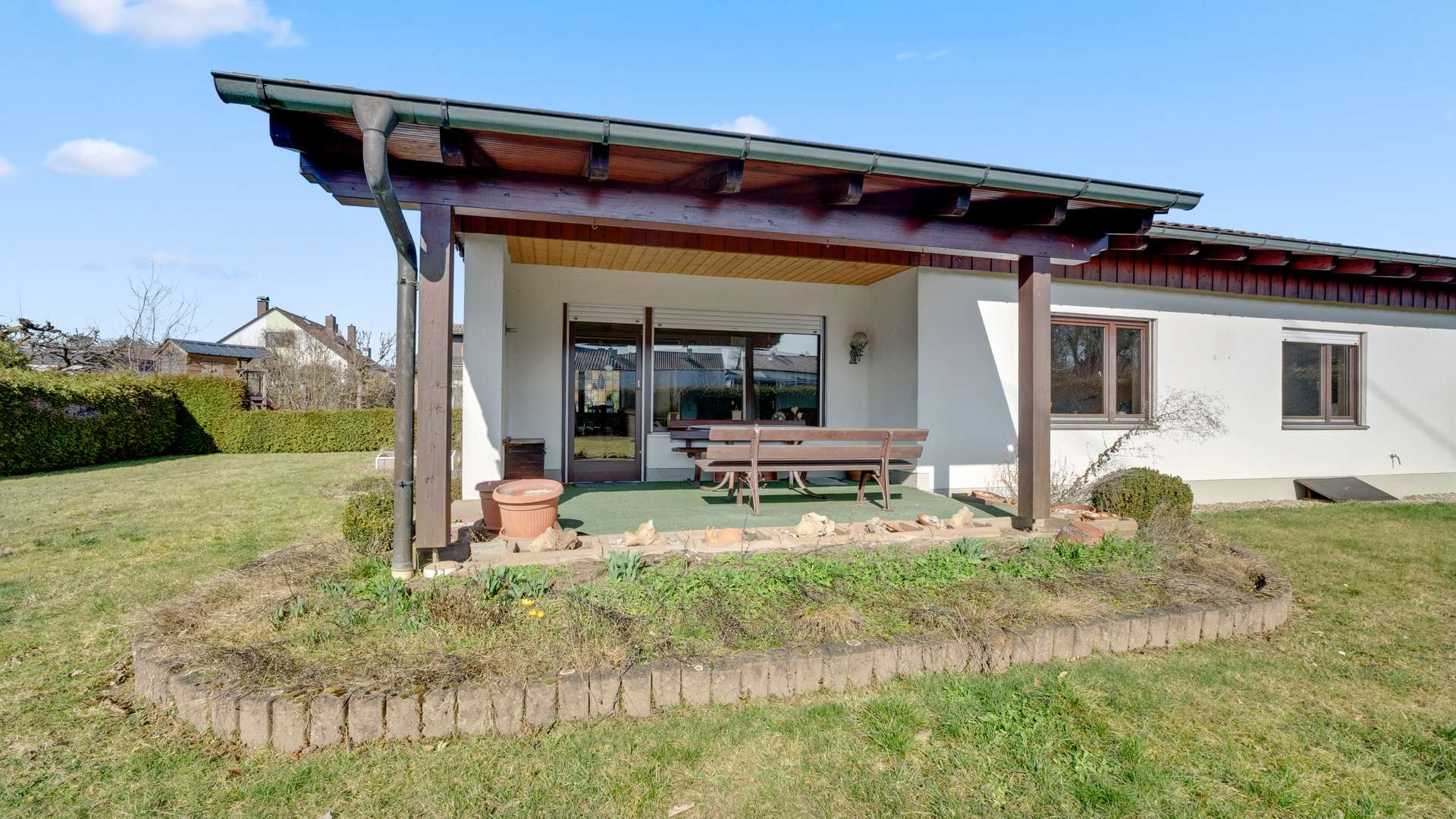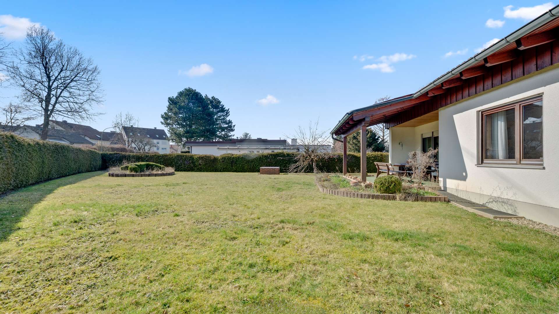 Das gepflegte Anwesen umfasst eine Wohnfläche von 127,57m², die sich auf nur eine Ebene verteilt – ideal für barrierearmes Wohnen. Der Bungalow wurde 1974 erbaut und ist voll unterkellert. Das große Eckgrundstück ist vollständig eingefriedet und bietet eine dichte Thuja-Hecke als natürlichen Sichtschutz, weitläufige Rasenflächen und liebevoll angelegte Blumen- und Zierbeete. Straßenseitig schmückt eine niedrige Mauer mit Gartentor den Zugang. Für Ihre Fahrzeuge stehen eine Doppelgarage mit zwei manuellen Schwingtoren sowie zwei asphaltierte Außenstellplätze zur Verfügung. Die großzügig überdachte Terrasse, mit Holzstützen versehen, bietet einen idyllischen Blick in den Garten und wird zum erweiterten Wohnbereich im Sommer. Eine Zisterne sorgt zusätzlich für eine umweltfreundliche Wasserversorgung der Grünanlagen.
