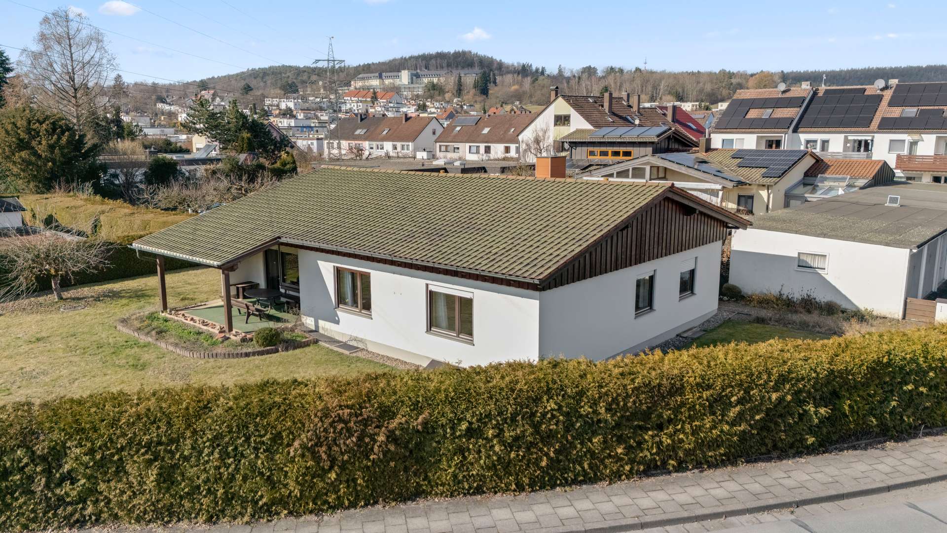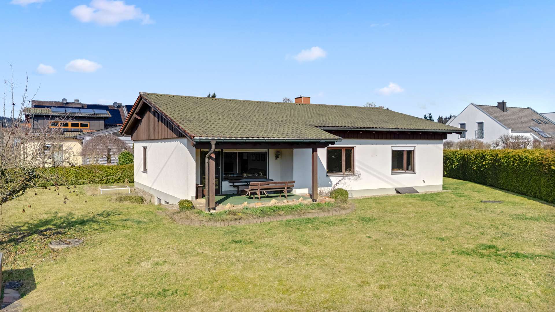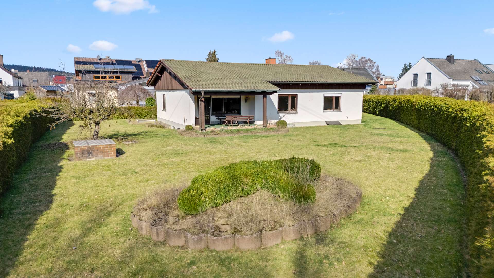 Ein wahrer Wohntraum erwartet Sie: Dieser barrierearme Bungalow mit Keller besticht durch seine exklusive Lage im begehrten Bayreuther Stadtteil Grüner Baum. Das traumhafte Eckgrundstück mit 971m² bietet Ihnen absolute Privatsphäre, eine herrlich angelegte Gartenanlage und eine ruhige, familienfreundliche Umgebung. Ein weiteres Highlight ist die großzügige, überdachte Terrasse, die harmonisch mit den gepflegten Außenanlagen verschmilzt und das perfekte Ambiente für entspannte Stunden im Freien schafft. Ob Alterssitz, Familiendomizil oder Rückzugsort – dieses Zuhause vereint Komfort, Naturnähe und beste Infrastruktur. Und das Beste: Das Haus ist nach optischen Renovierungen sofort bezugsfertig.