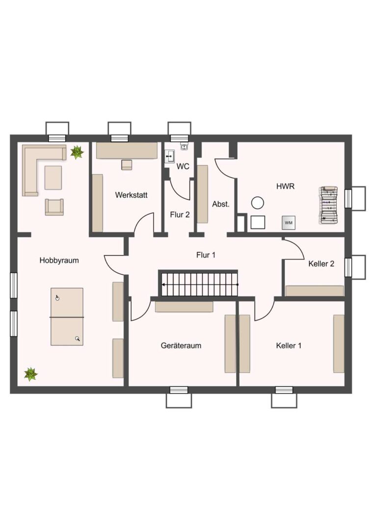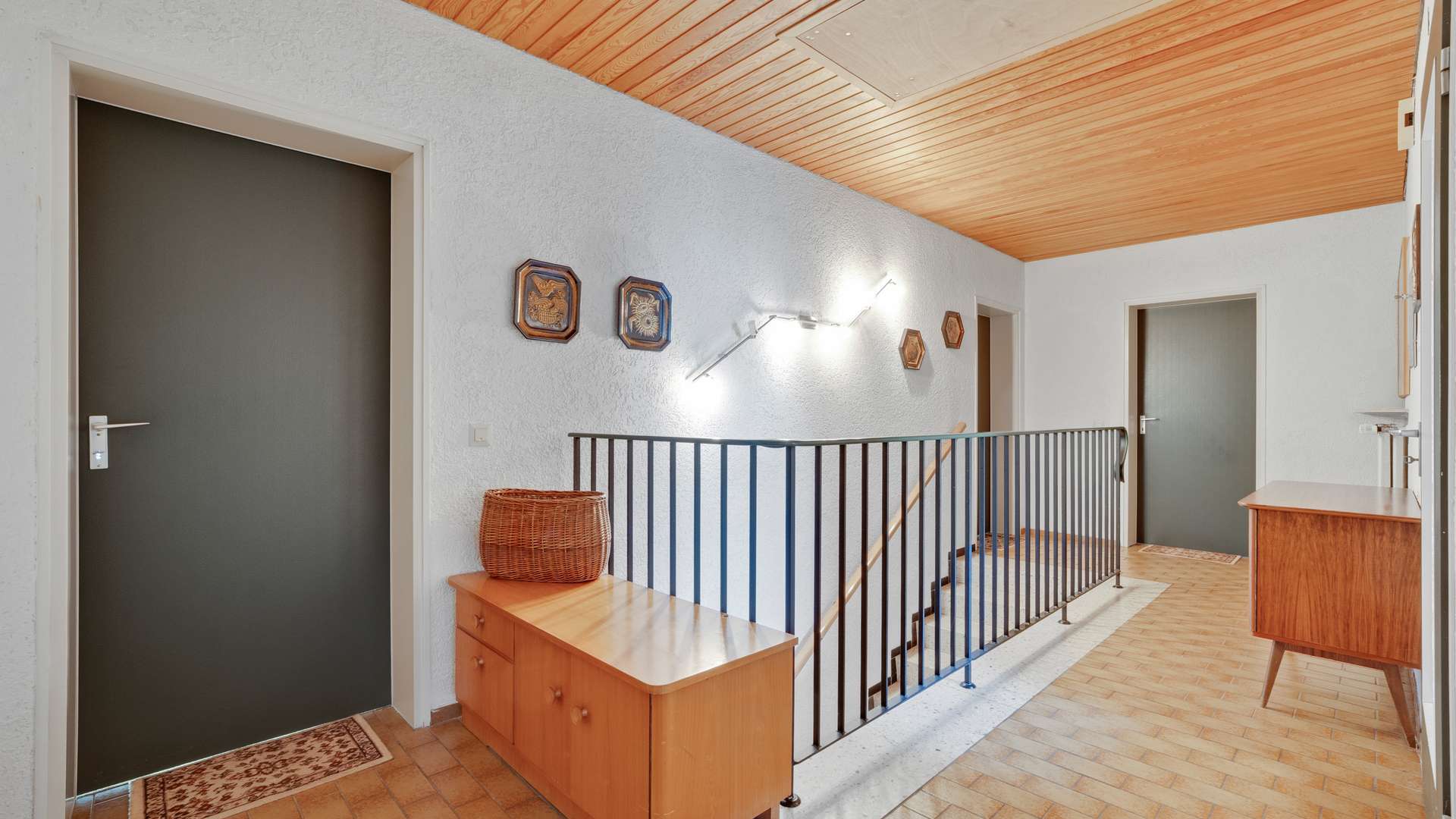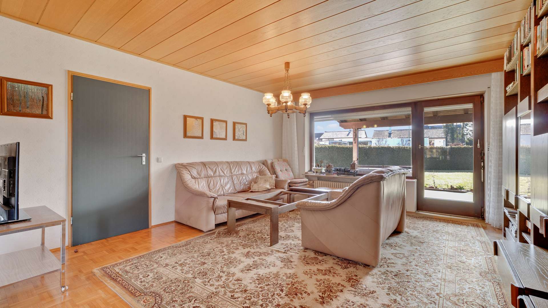 Im barrierearmen Erdgeschoss genießen Sie auf 2,44m Deckenhöhe einen durchdachten Grundriss: Der Windfang mit Garderobenplatz führt in den Flur, von dem alle Wohnräume zugänglich sind. Der großzügige Wohn-Essbereich glänzt mit Parkettboden, hellen Holzdecken und direktem Zugang zur Terrasse – ein Ort voller Gemütlichkeit und Licht. Die Küche mit zwei Fenstern bietet funktionalen Raum für die Zubereitung Ihrer Lieblingsgerichte. Ein Arbeitszimmer, ein Kinderzimmer, ein Elternschlafzimmer und ein voll ausgestattetes Badezimmer mit Fenster, Wanne und Dusche runden das Raumangebot ab. Der Keller begeistert mit vielseitiger Nutzbarkeit: Hobbyraum, Werkstatt oder Hauswirtschaftsräume – hier findet alles seinen Platz. Besondere Highlights sind der beheizte Hobbyraum sowie das zusätzliche WC im Untergeschoss.
