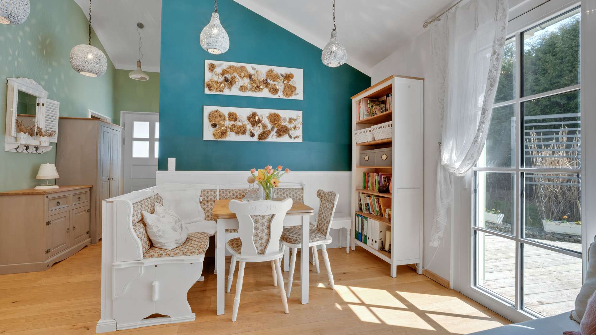 2025: halbhohe Wandverkleidung im Landhausstil mit integrierter Landhaus Eckbankgruppe