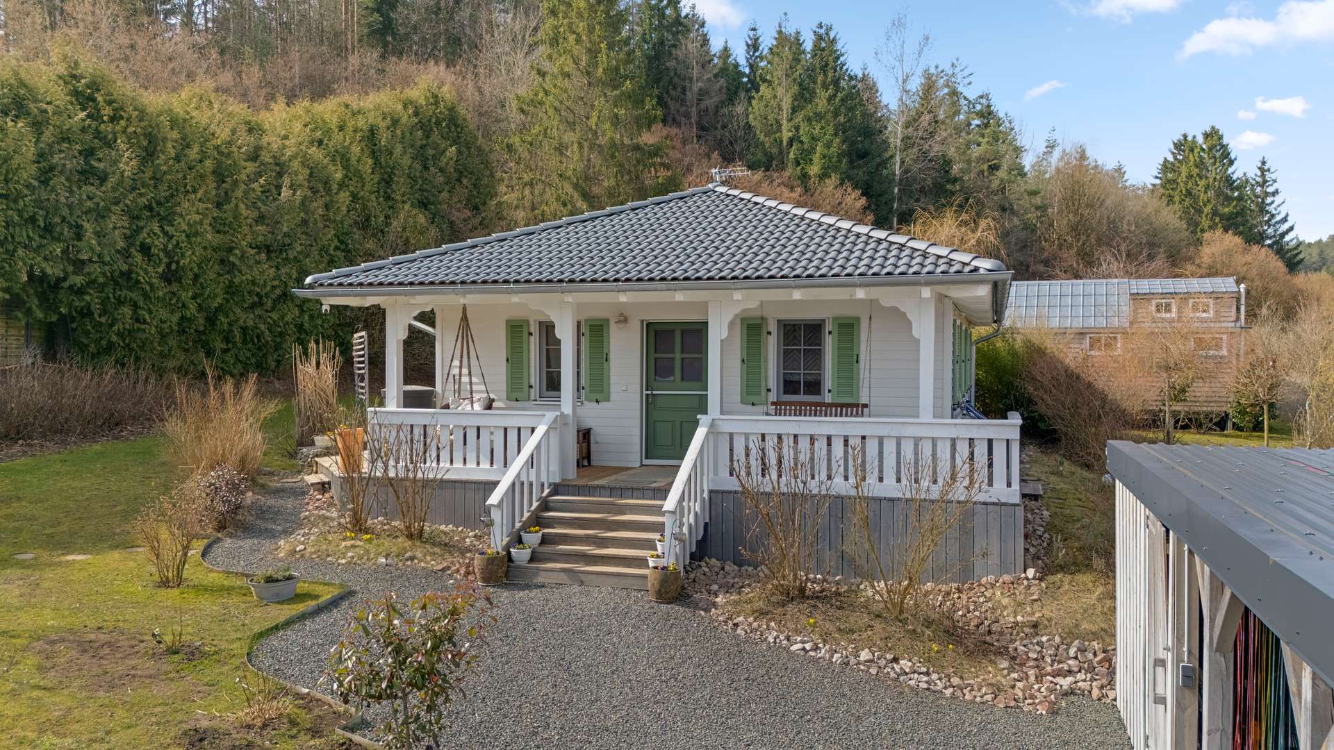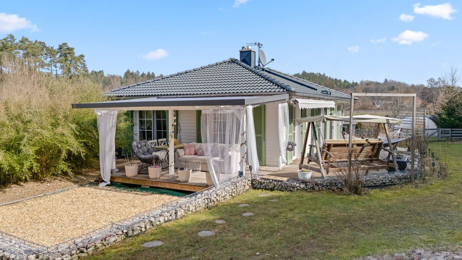 Eingebettet in die idyllische Kulisse des Veldensteiner Forsts bietet dieses außergewöhnliche Anwesen eine einzigartige Kombination aus modernem Wohnkomfort, naturnaher Lage und exklusiven Highlights. Das Leben in absoluter Privatsphäre auf einem großzügigen Grundstück von 2.746m² verbindet Stil, Nachhaltigkeit und Autarkie. Der 2019 errichtete Bungalow im Landhausstil begeistert in hochwertiger Holzbauweise und ist auf effizientes und umweltbewusstes Wohnen ausgelegt. Eine zusätzliche Rarität ist das charmante Tiny House, das als separate Wohneinheit genutzt werden kann – ideal für Gäste, Familie oder Vermietung. Ein liebevoll angelegter Garten mit prachtvollem Baumbestand, ein Wellnessbereich mit Sauna, Außendusche und Jacuzzi sowie Terrassen mit freiem Blick ins Grüne machen diese Immobilie zu einem besonderen Rückzugsort.