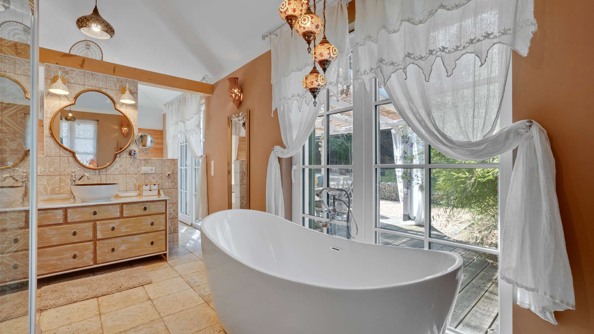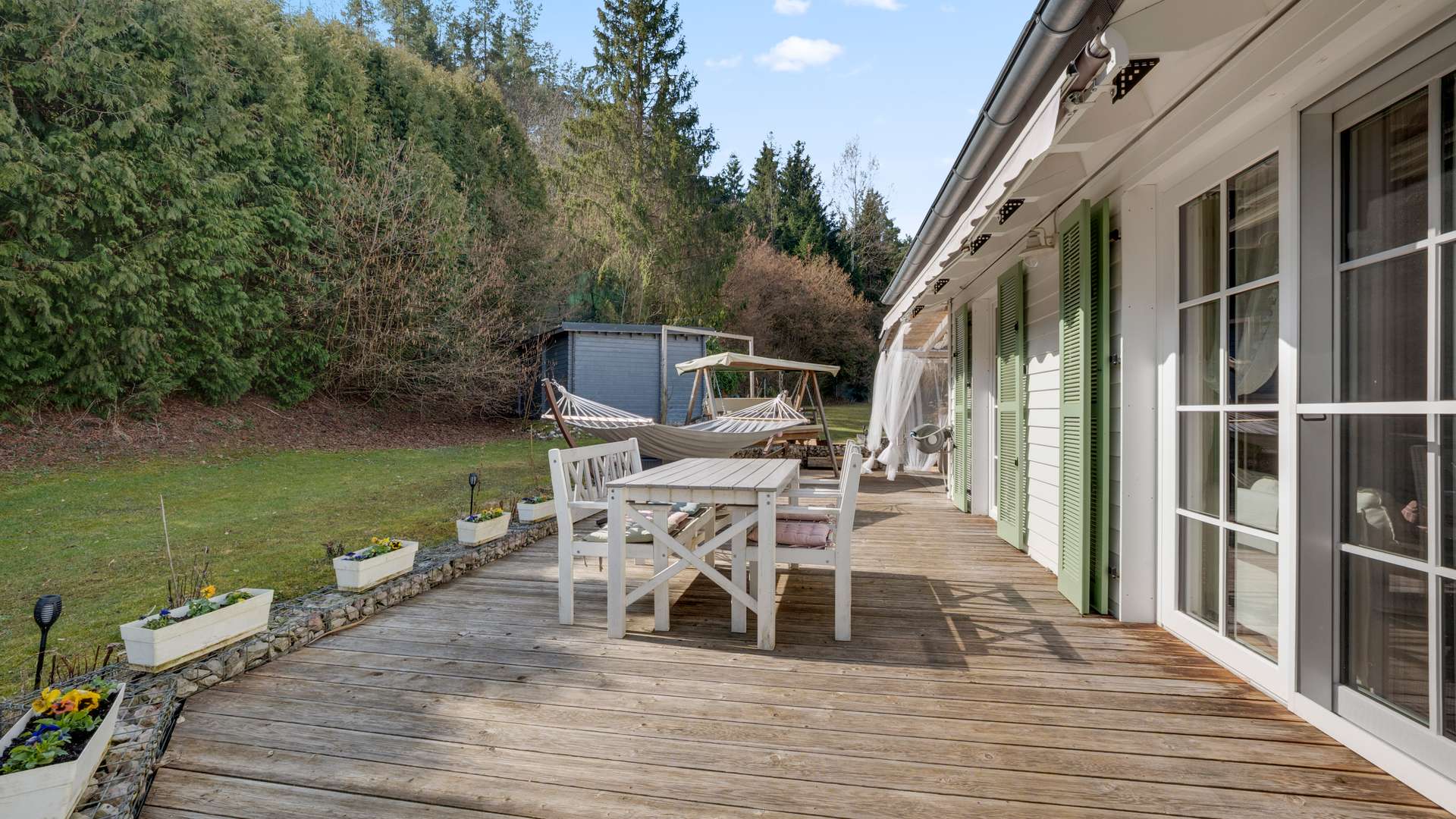 - Große Holzterrassen, teilweise überdacht, mit Waldblick