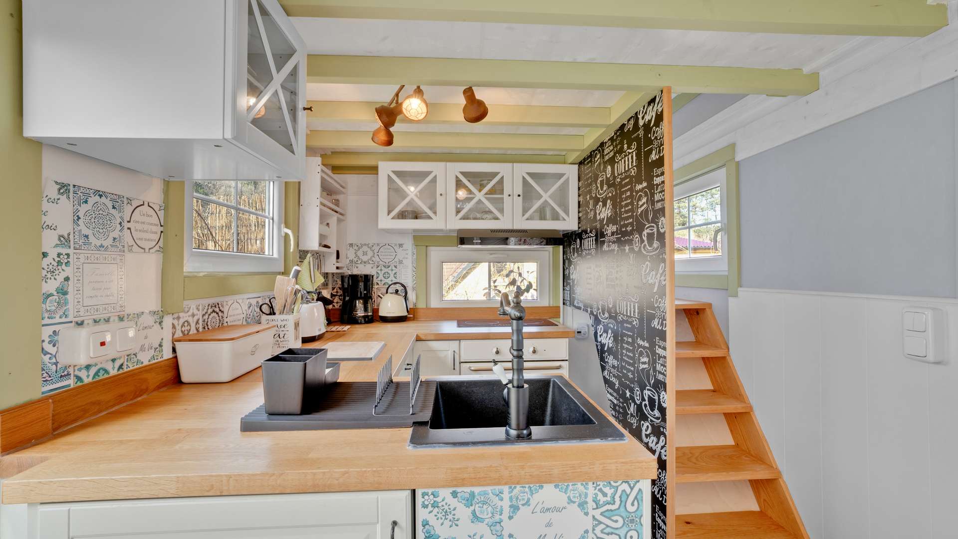 Im Inneren überzeugt der Bungalow mit einer durchdachten Raumaufteilung, die Offenheit und Funktionalität vereint. Herzstück ist der lichtdurchflutete Wohn-/Essbereich mit bodentiefen Fenstern und Blick in den Garten. Ein Kamin sorgt hier für Behaglichkeit, während der direkte Zugang zur großzügigen Terrasse ein naturnahes Lebensgefühl vermittelt. Die Küche mit traditionellen Fliesen integriert sich harmonisch in das Gesamtkonzept. Das Schlafzimmer punktet mit einer großen Fensterfront und direkter Verbindung zum stilvollen Badezimmer, das mit einer freistehenden Badewanne, einer bodentiefen Regendusche und hochwertigen Oberflächen ausgestattet ist. Ein separates WC, ein Arbeitszimmer sowie ein praktischer HWR runden die Raumaufteilung ab. Das Tiny House bietet auf zwei Etagen einen charmanten Rückzugsort mit offenem Wohn- und Küchenbereich, modernem Badezimmer und gemütlichem Schlafloft. Die beiden Küchen im Bungalow und Tiny House können für nur 10.000€ dazu erworben werden.