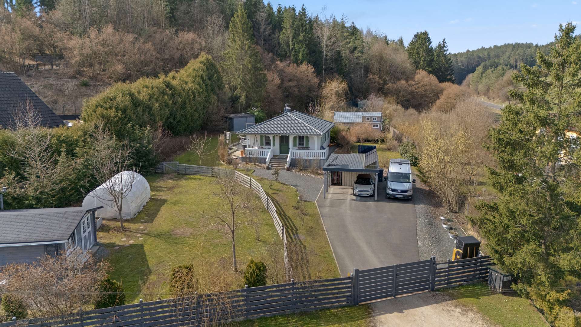 Der Bungalow erstreckt sich über eine Ebene und bietet 93,53m² Wohnfläche, während das Tiny House mit zusätzlichen 19,64m² punktet, sodass insgesamt 113,17m² zur Verfügung stehen. Das Hauptgebäude beeindruckt mit viel Charme und einer teilweise überdachten Holzterrasse aus Lärchenholz als Bindeglied zwischen Innen- und Außenbereich. Die Zufahrt erfolgt über ein elektrisches Tor, das zu einer asphaltierten Einfahrt und einem Doppelcarport mit integrierter Photovoltaikanlage führt. Zusätzliche Nebengebäude wie Gartenhäuser für Geräte und Technik, ein Gewächshaus sowie ein in den Hang gearbeiteter Gewölbekeller für Kühlzwecke erweitern die Nutzungsmöglichkeiten. Der Garten besticht durch seine Strukturvielfalt: Eine gepflegte Rasenfläche, zahlreiche Obstbäume, ein Nutzgarten für Selbstversorger und ein Zierteich verschmelzen harmonisch zu einem Ensemble. Das Tiny House, auf einem Trailer errichtet und mit eigener überdachter Terrasse ausgestattet, bietet ein Höchstmaß an Flexibilität.
