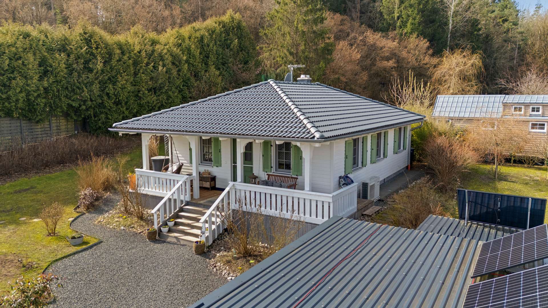 Die Bauweise dieser Immobilie setzt auf hohe Qualität und Nachhaltigkeit. Der Bungalow wurde von Holzbau Hümmer in moderner Holzrahmenkonstruktion mit 36,5cm starken Wänden errichtet. Eine luftdichte, hochgedämmte Futura-Bodenplatte mit integrierter Fußbodenheizung sorgt für wohlige Wärme und reduziert den Energieverbrauch. Das Walmdach ist mit Betondachsteinen eingedeckt und verfügt über eine Zwischensparrendämmung. Kunststofffenster mit Dreifachverglasung und grünen Fensterläden unterstreichen die gute Substanz und die ländliche Eleganz des Hauses. Die Luft-Wasser-Wärmepumpe – ergänzt durch einen Schwedenofen im Wohnbereich – sorgt für ein nachhaltiges Heizkonzept. In Verbindung mit der auf dem Carport installierten PV-Anlage ist ein nahezu autarkes Leben möglich.