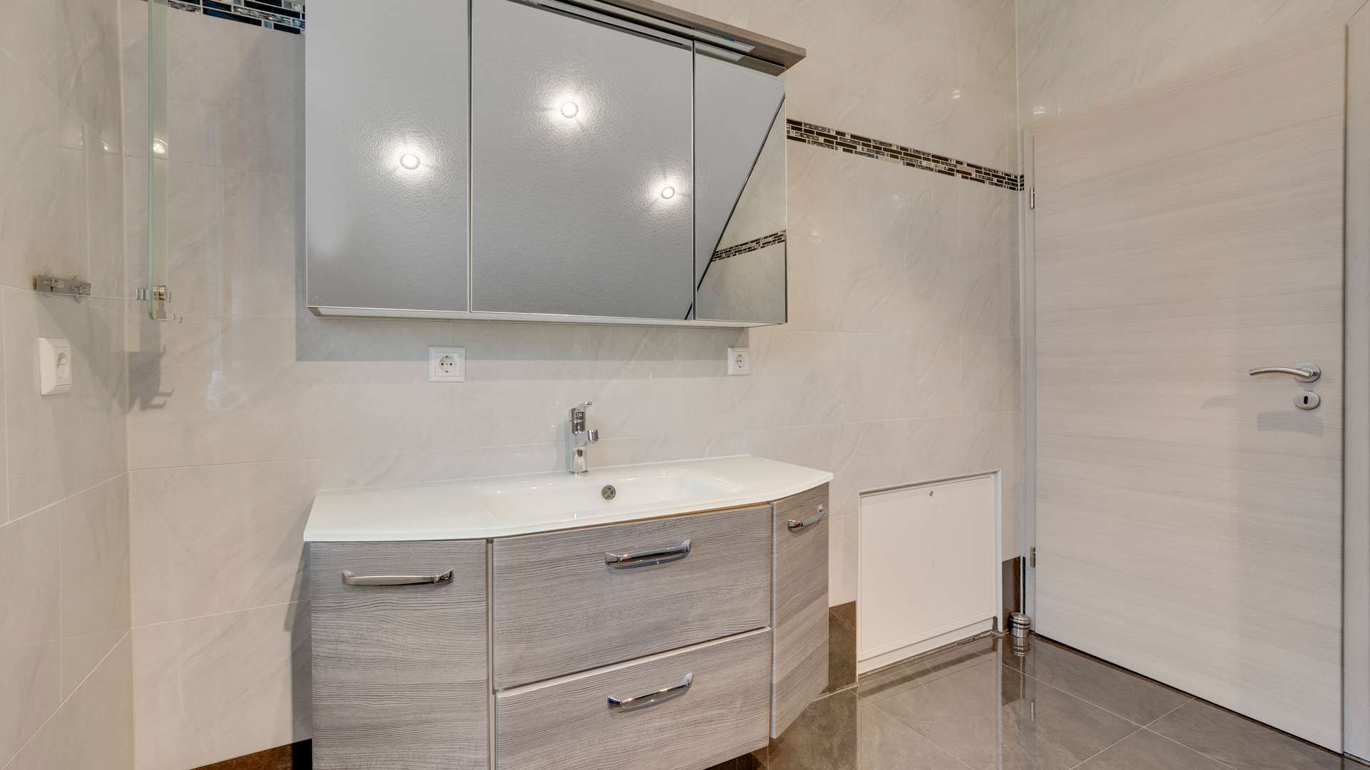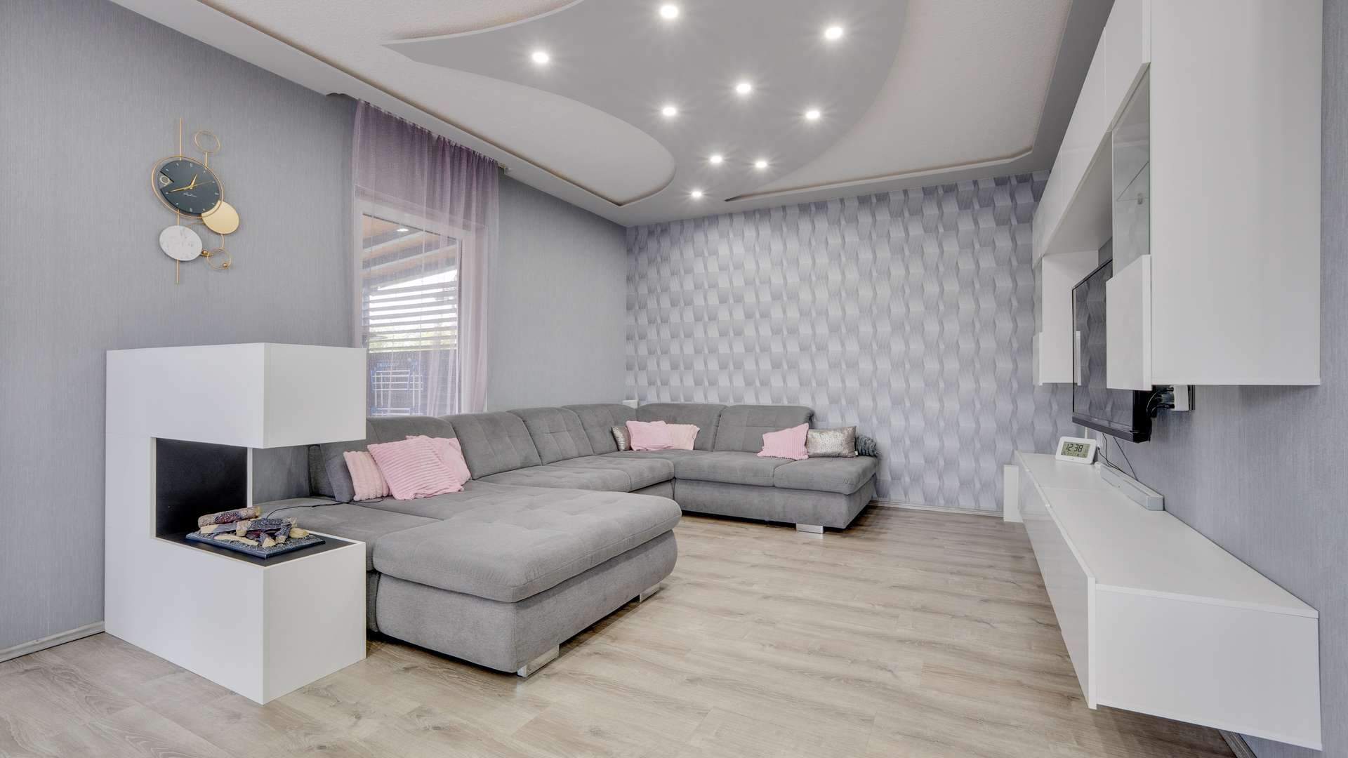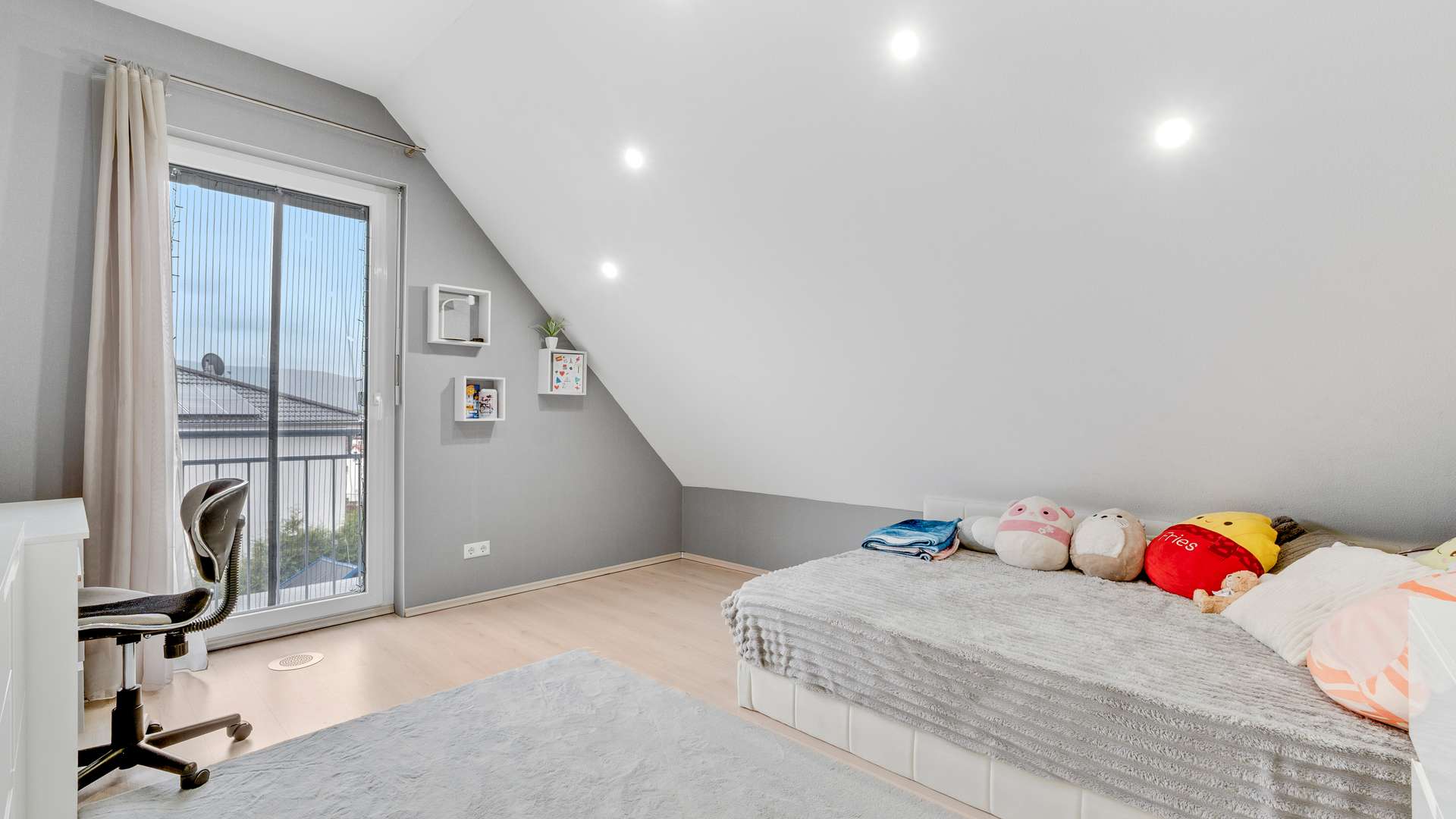 Das Erdgeschoss begeistert durch eine Raumaufteilung, die Familienleben großschreibt. Die außergewöhnliche Deckenhöhe von 2,77m im Erdgeschoss schafft ein großzügiges Wohngefühl, unterstützt durch LED-Deckenspots. Die Diele mit stilvollen Design öffnet sich zum hellen Wohn- und Essbereich, der durch bodentiefe Fenster und direkten Zugang zur großzügig überdachten Terrasse punktet. Die Einbauküche, die für nur 10.000€ übernommen werden kann, ist mit hochwertigen Geräten ausgestattet. Ein modernes Badezimmer mit großer Eckdusche sowie ein praktischer Hauswirtschaftsraum runden den durchdachten Grundriss ab. Hochwertige Materialien wie Fliesen und Designböden spiegeln sich in jedem Detail wider. Im Dachgeschoss warten lichtdurchflutete Räume auf Sie. Der Flur verbindet zwei Kinderzimmer, ein großes Schlafzimmer und ein stilvolles Familienbad mit Eckbadewanne. Große Fensterfronten mit französischen Balkonen sorgen in allen Räumen für reichlich Tageslicht und eine freundliche Atmosphäre. Dank der durchdachten Anordnung der Räume und Details wie LED-Deckenbeleuchtung und einer komfortablen Raumhöhe von 2,67m wird das Dachgeschoss zum Rückzugsort für die ganze Familie.